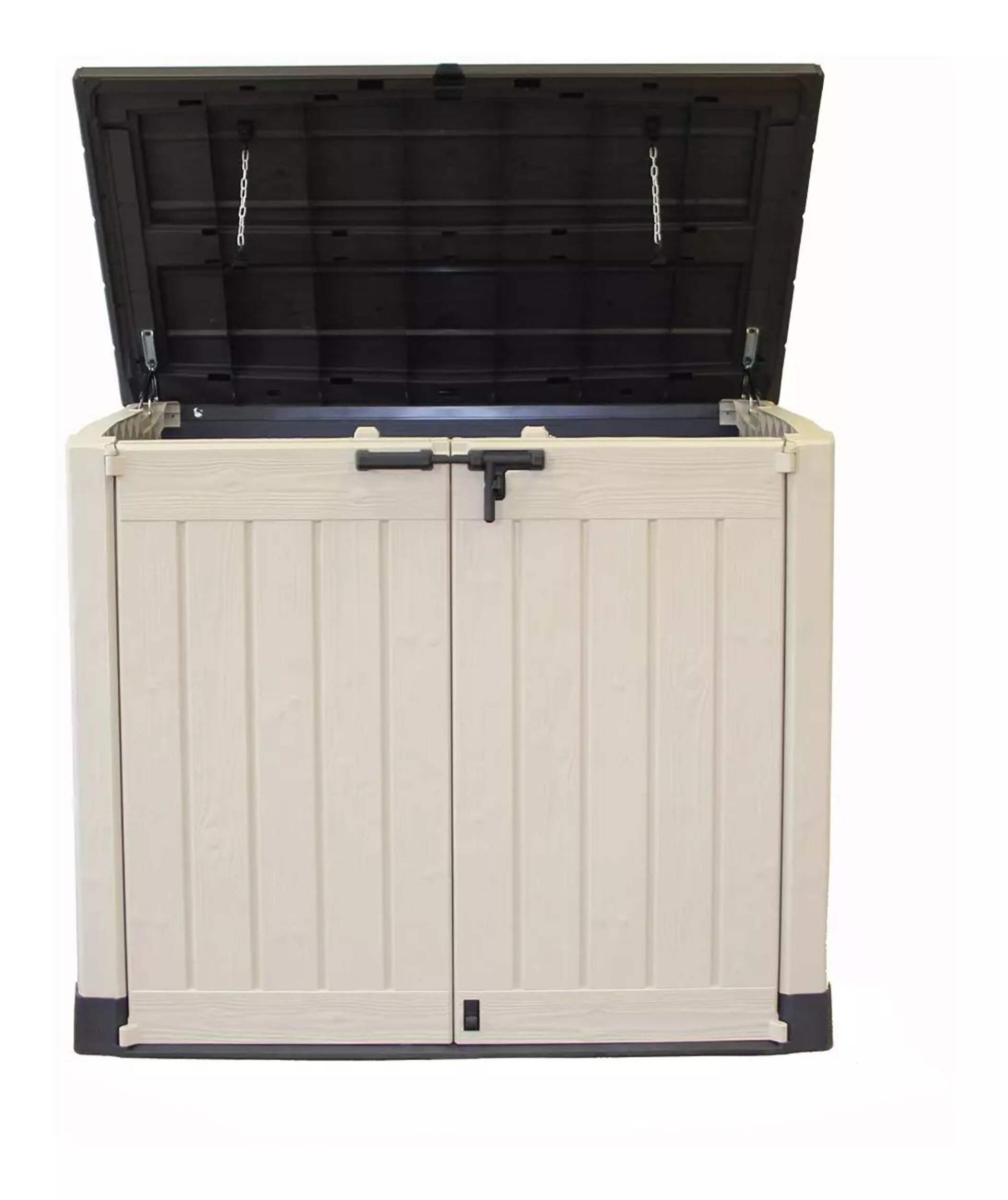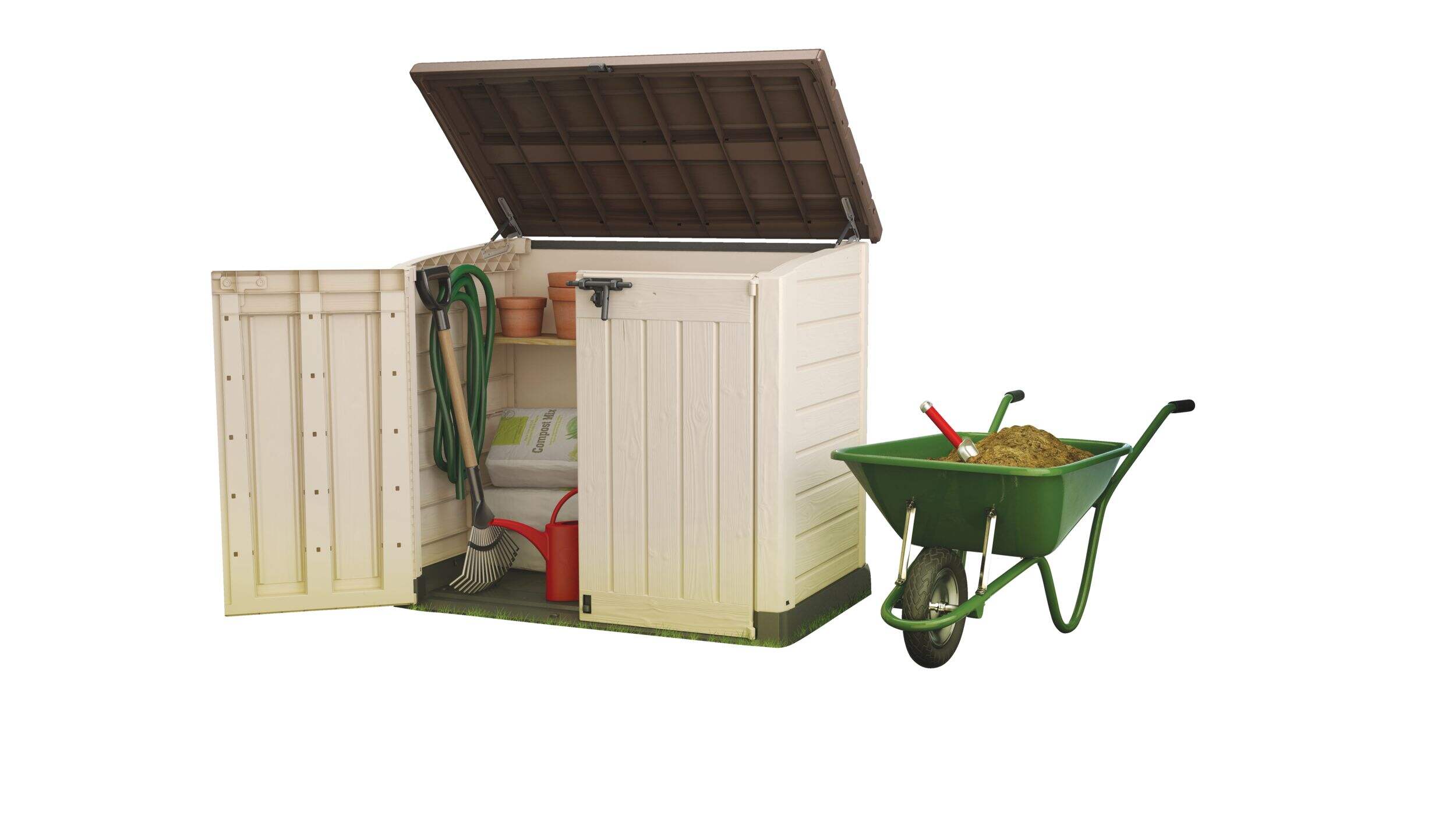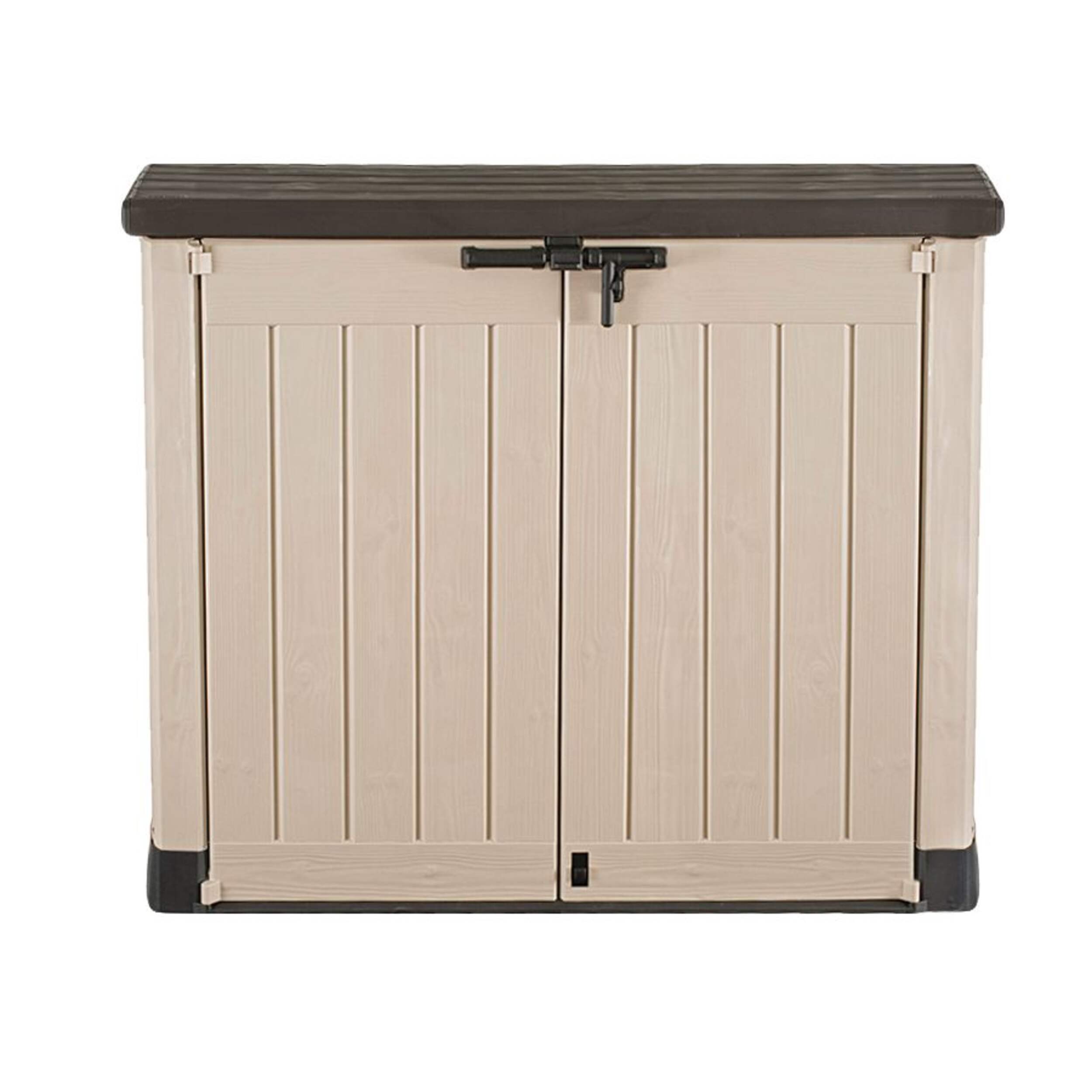 The Keter Store-It-Out Horizontal Storage Shed in Beige & Brown (1189-L) offers a reliable and spacious solution for outdoor storage. Its compact design seamlessly fits into various settings, providing convenient access to all your stored items. With dual access options—open from the front or lift the lid, aided by an easy-open mechanism—it’s perfect for garden tools, trash cans, and other outdoor essentials. This shed keeps your belongings dry and organized, delivering practical storage to any yard or patio without taking up extra space.