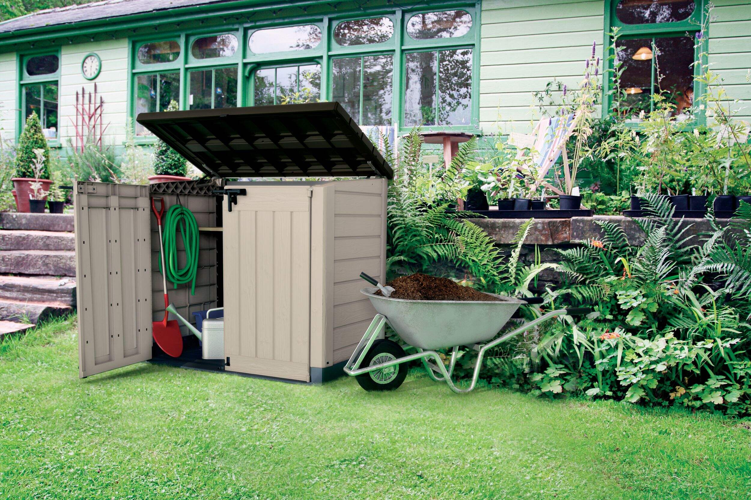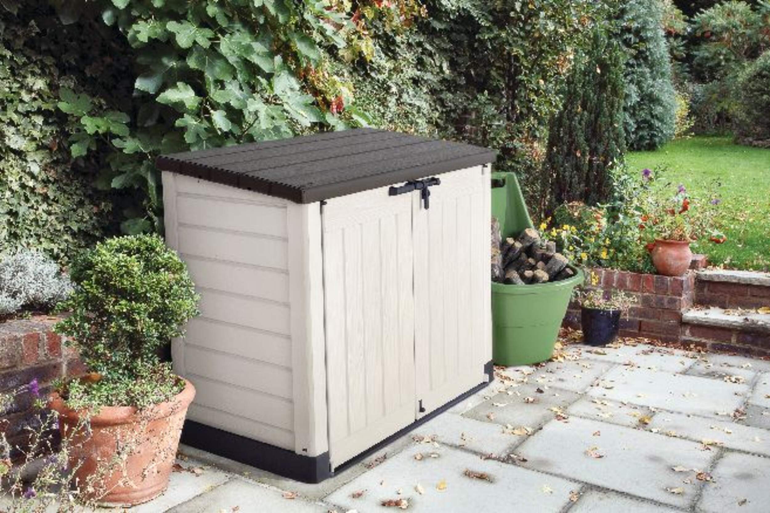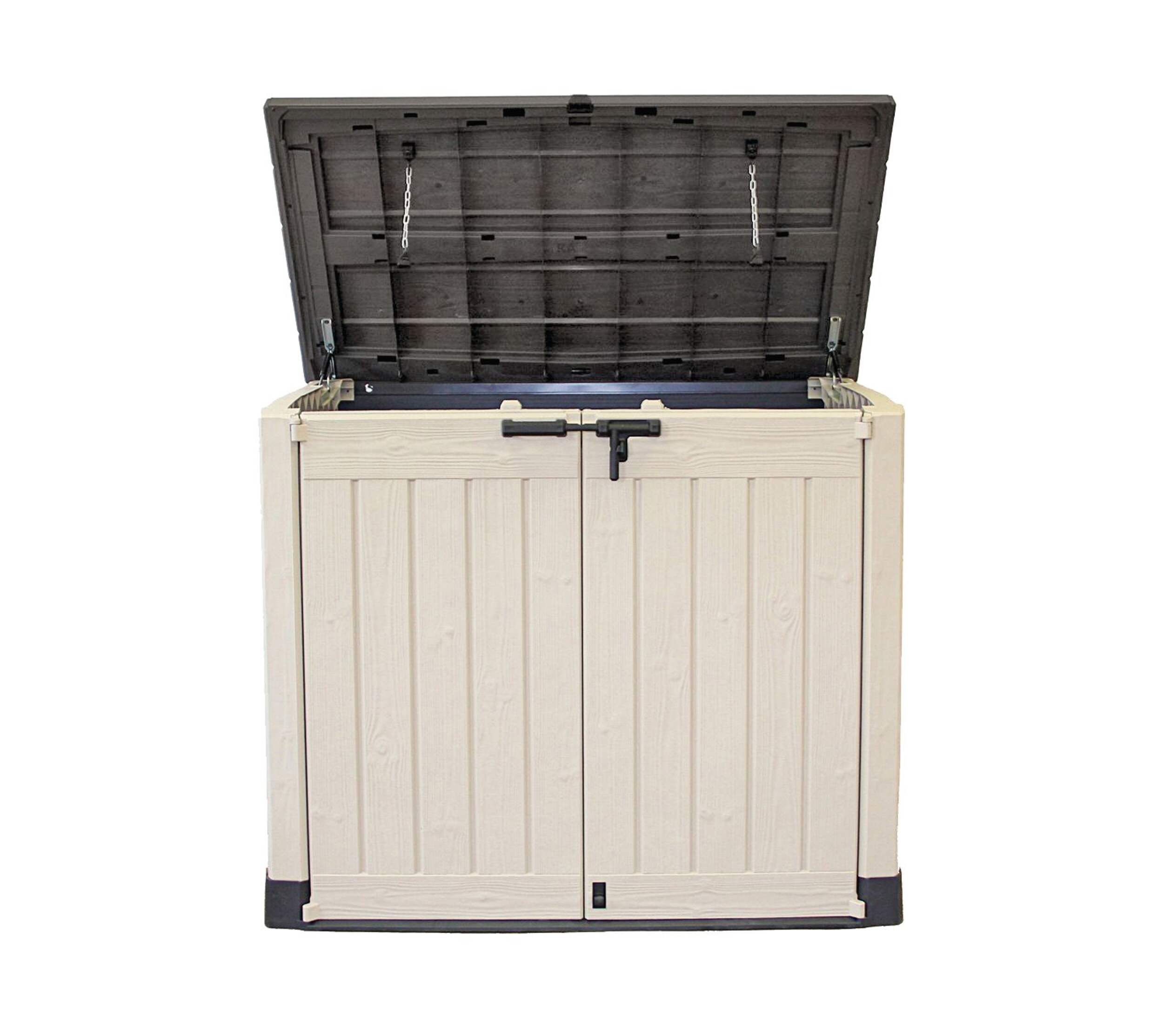 The Keter Store-It-Out Horizontal Storage Shed in Beige & Brown (1189-L) offers a reliable and spacious solution for outdoor storage. Its compact design seamlessly fits into various settings, providing convenient access to all your stored items. With dual access options—open from the front or lift the lid, aided by an easy-open mechanism—it’s perfect for garden tools, trash cans, and other outdoor essentials. This shed keeps your belongings dry and organized, delivering practical storage to any yard or patio without taking up extra space.