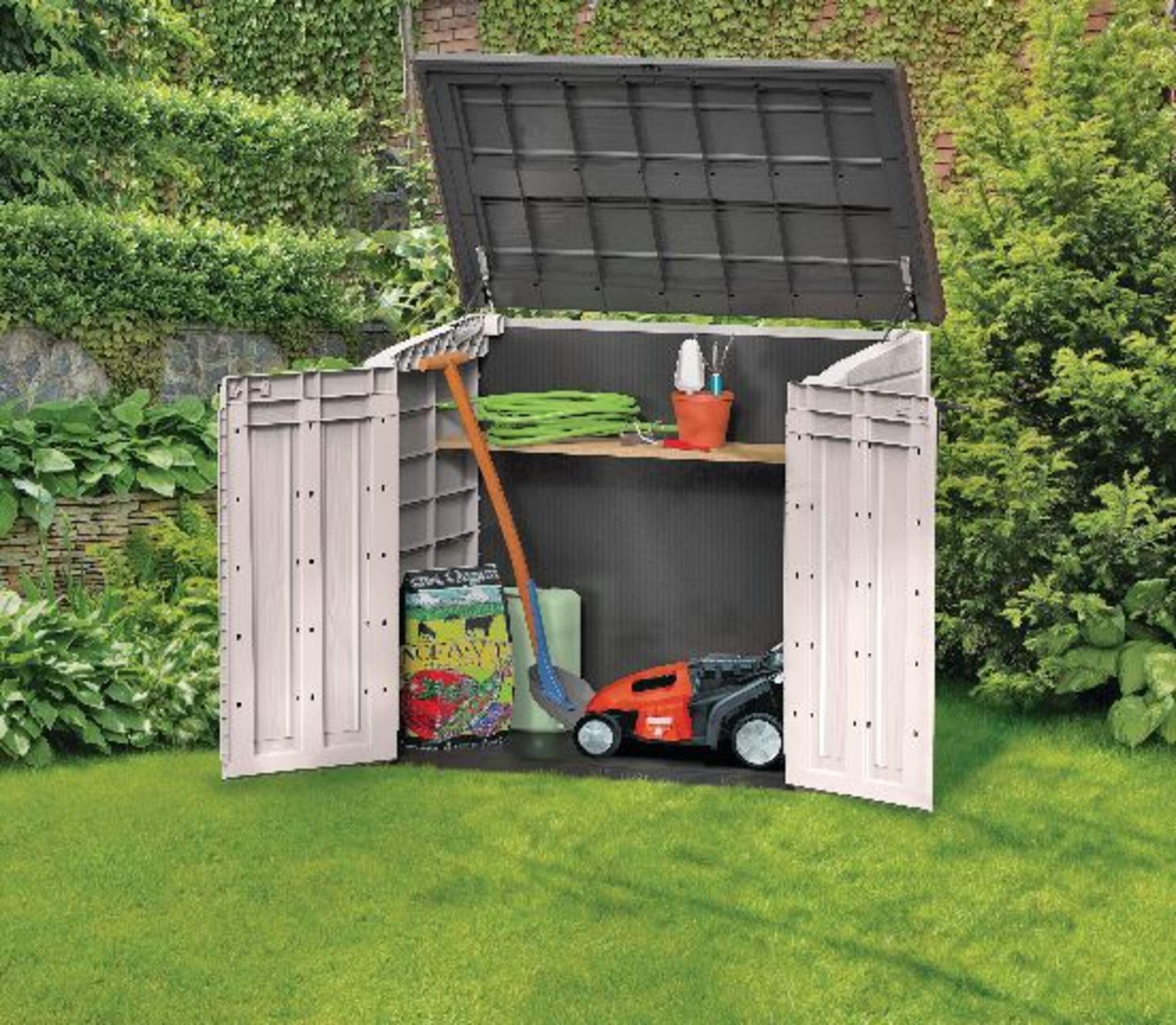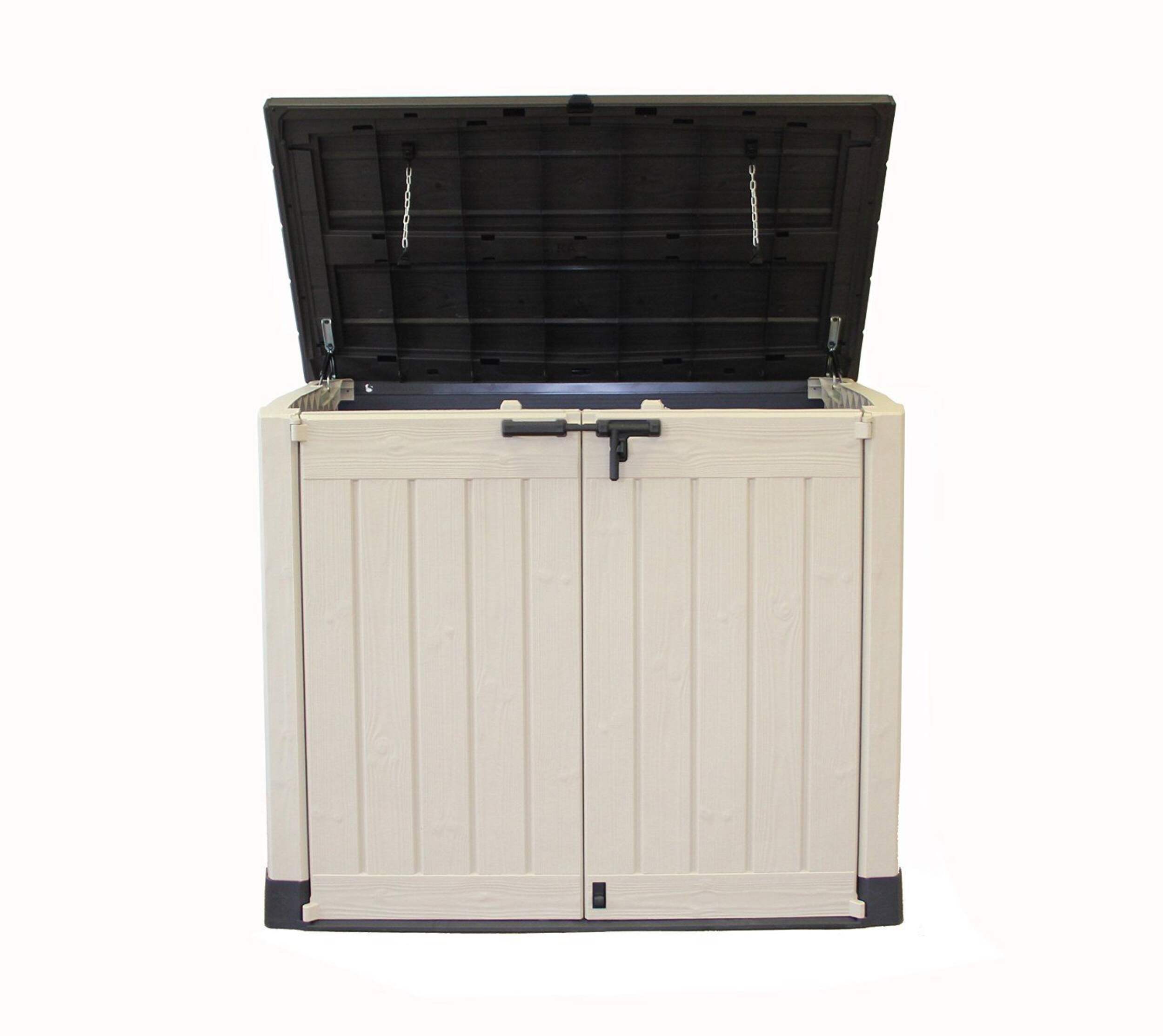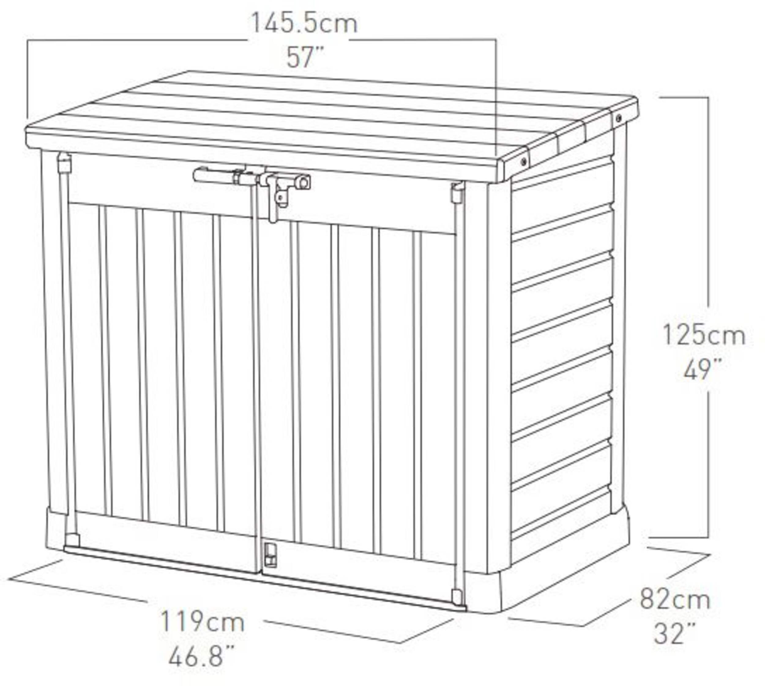 Stores up to two 240 L (63 US gal) trash cans or most garden equipment