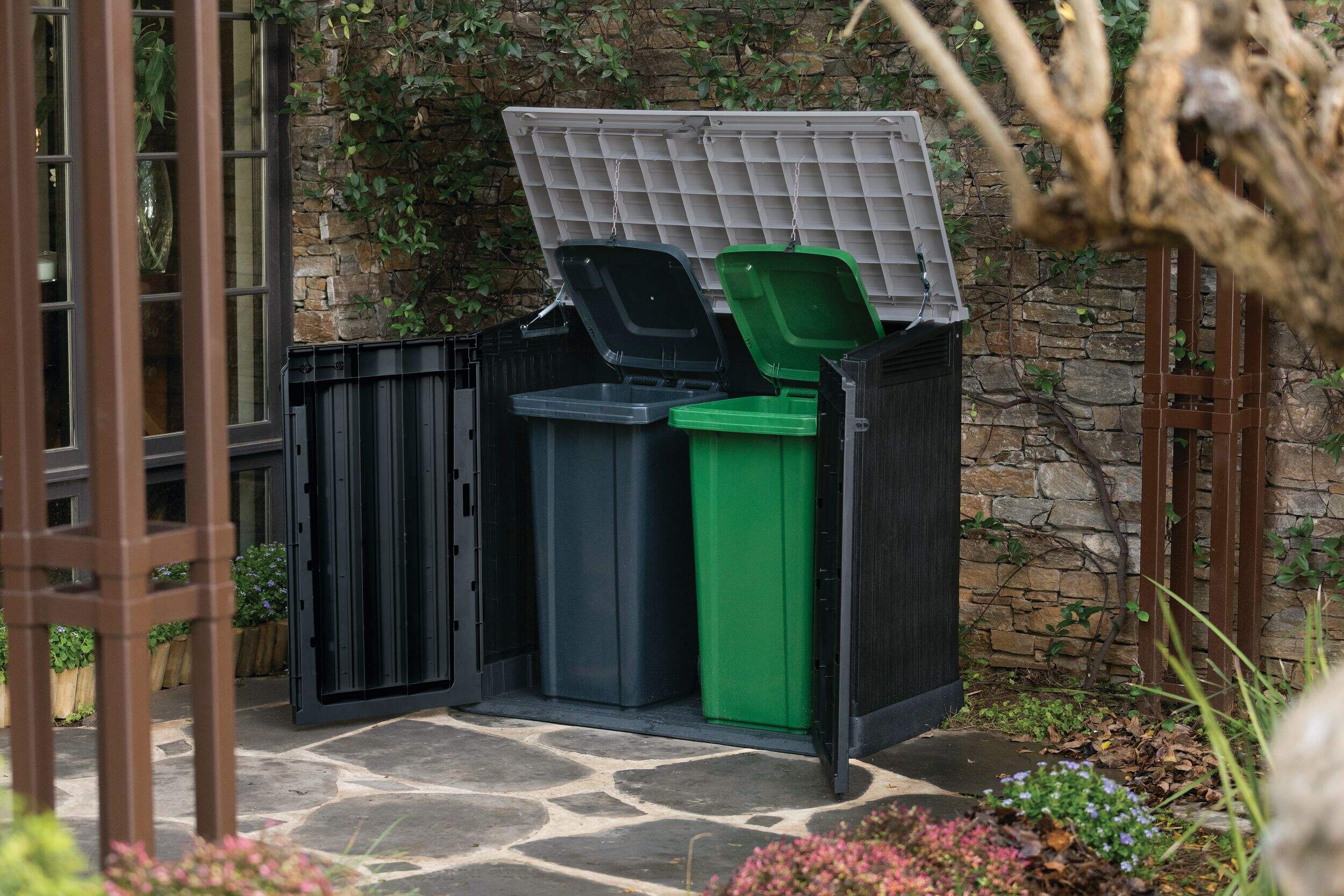 The Store-It-Out MIDI Horizontal Storage Shed is great for your patio, balcony, or garden. Durable and weather resistant for many years of maintenance-free use, this storage shed also comes with hydraulic pistons that hold the top open and a special bin-opening kit that lets you open your trash bins just by lifting the lid of the unit - perfect when you only have one free hand.