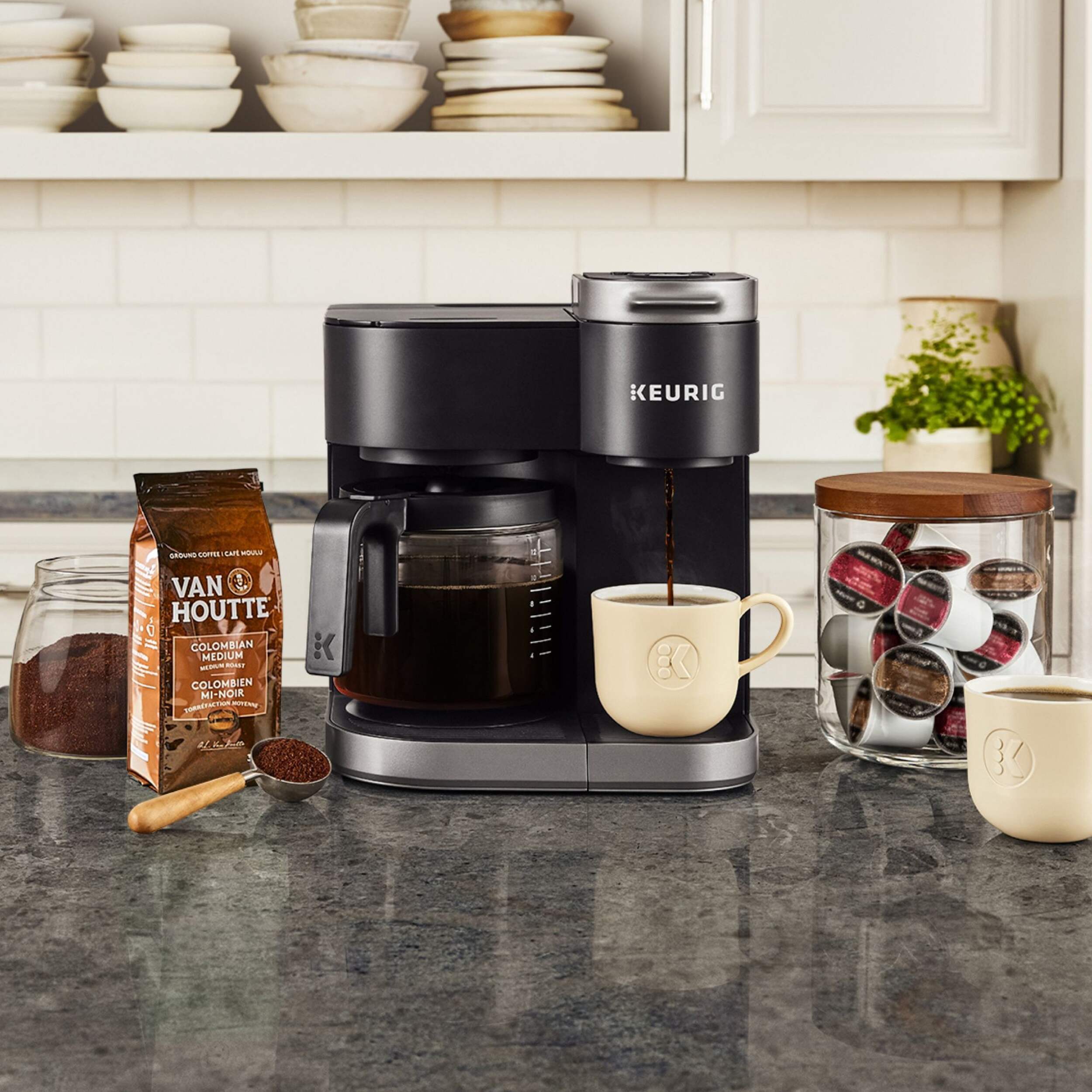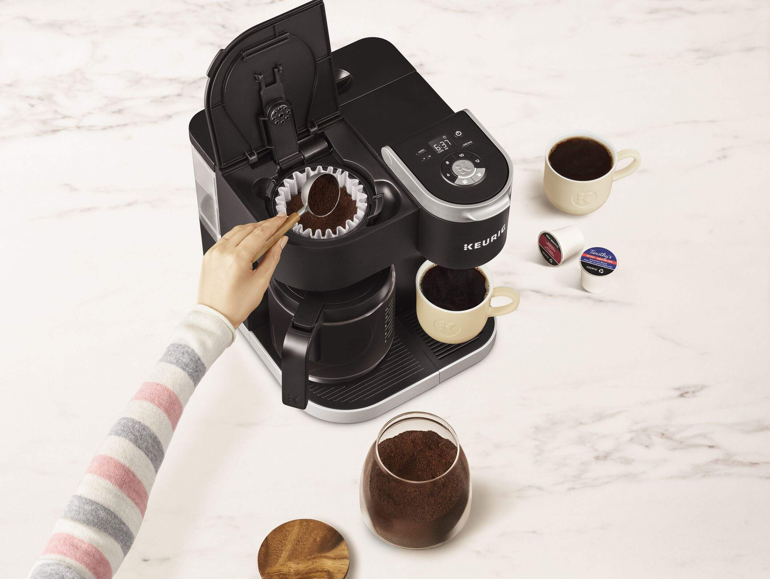 BREW A CUP AND A CARAFE: Use both ground coffee and K-Cup® pods