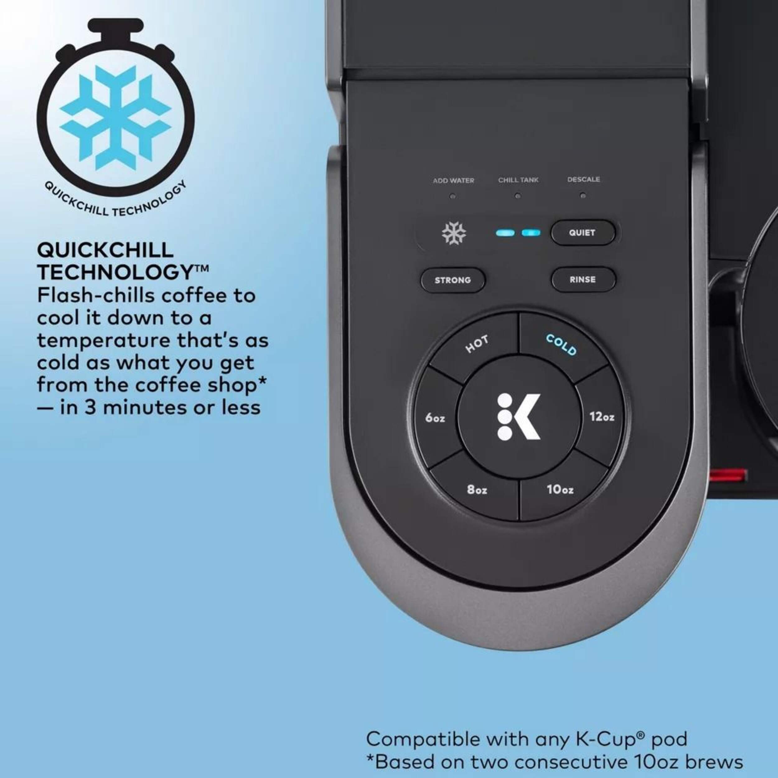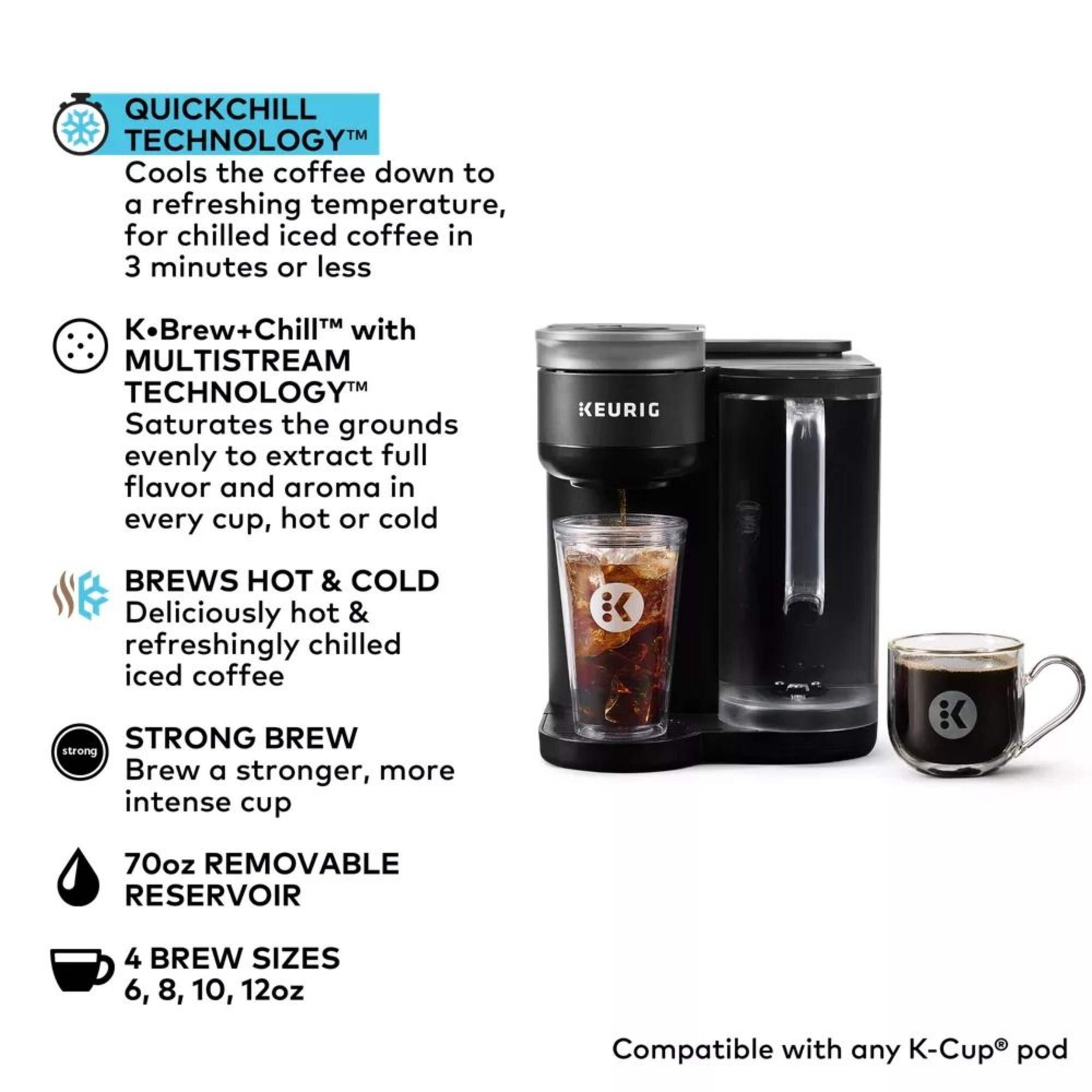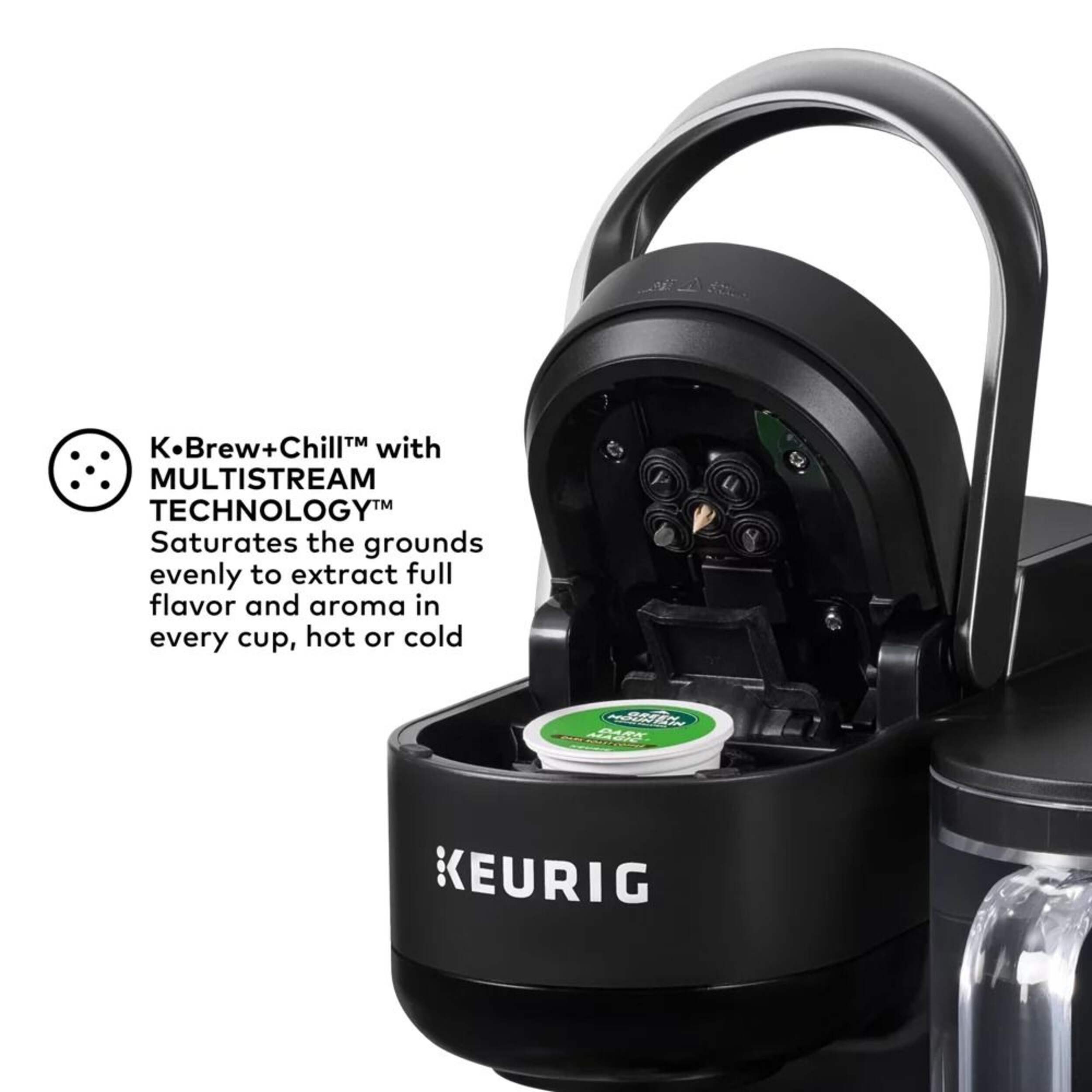 Introducing the first at-home coffee maker to make iced coffee as cold as the coffee shop*: the Keurig® K-Brew+Chill™. Enjoy full-flavoured, perfectly chilled iced beverages in minutes, as well as delicious hot coffee, using ANY of your favourite K-Cup® pods.The NEW K-Brew+Chill™ with MultiStream Technology™ saturates the grounds evenly to extract full flavour and aroma in every cup, hot or cold. It features QuickChill Technology™, our latest brewing innovation that flash-chills your coffee after brewing so it dispenses at a cool temperature for minimal ice melt and robust, rich flavour … in 3 minutes or less. The Strong Brew option allows you to make a more intense, bold-flavoured cup for both hot and iced drinks. The K-Brew+Chill™ comes with an extra-large, removable 2.07 L (70oz) water reservoir and brews in 177, 237, 296, and 355 ml (6, 8, 10, and 12 oz cup sizes, so you can enjoy many cups between refills.Finally, an at-home coffee maker that makes iced coffee as cold as the coffee shop, for the delicious flavour and cool refreshment that iced coffee lovers have been looking for.*Based on two consecutive 296 ml (10oz) brews." For Québec consumers only - Notice on the warranty of availability of spare parts, repair services and information necessary for repair or maintenance (s. 39 of the Consumer Protection Act)Please be advised that Keurig Canada Inc. ( “Keurig”), as well as their respective affiliates, subsidiaries, parent companies, insurers, successors and assigns, does not guarantee, within the meaning of section 39 of the Consumer Protection Act, CQLR, c. P-40.1 and sections 79.18 to 79.20 of the Regulation respecting the application of the Consumer Protection Act, CQLR, c P-40.1, r. 3, the availability of replacement parts, repair services, or the information necessary for the maintenance or repair of goods manufactured, imported, advertised, or sold by Keurig, its affiliates or subsidiaries.https://www.keurig.ca/bill29