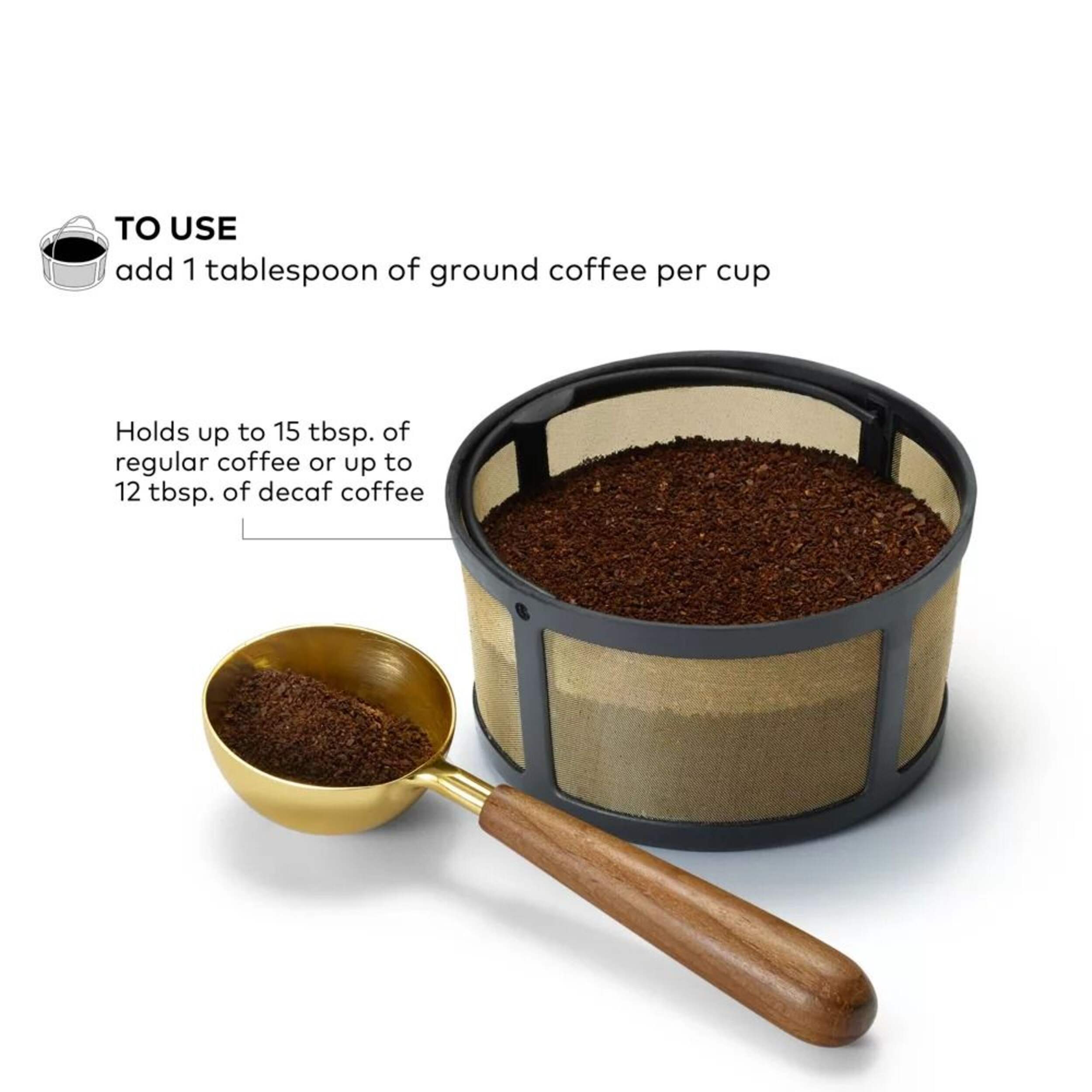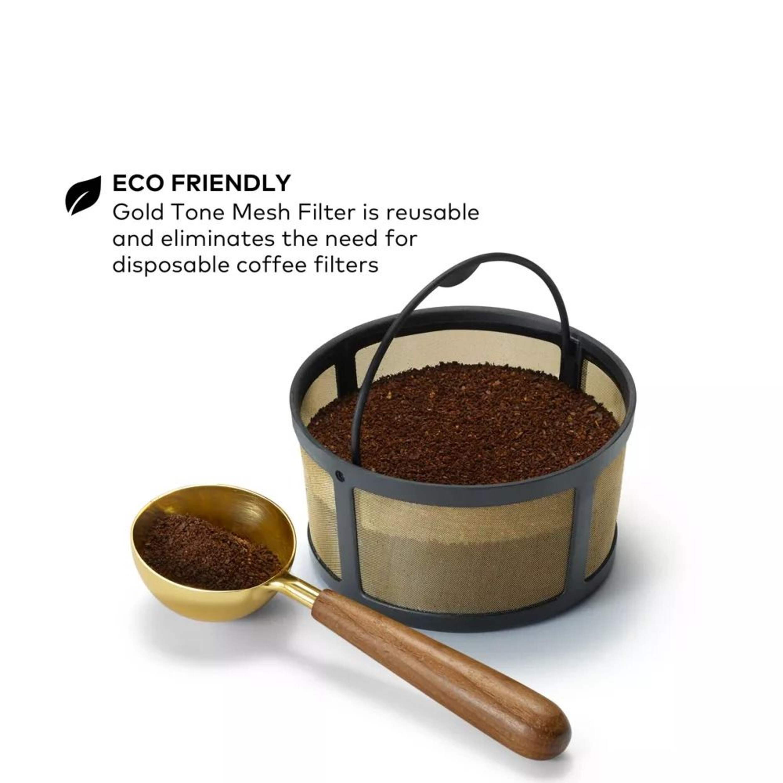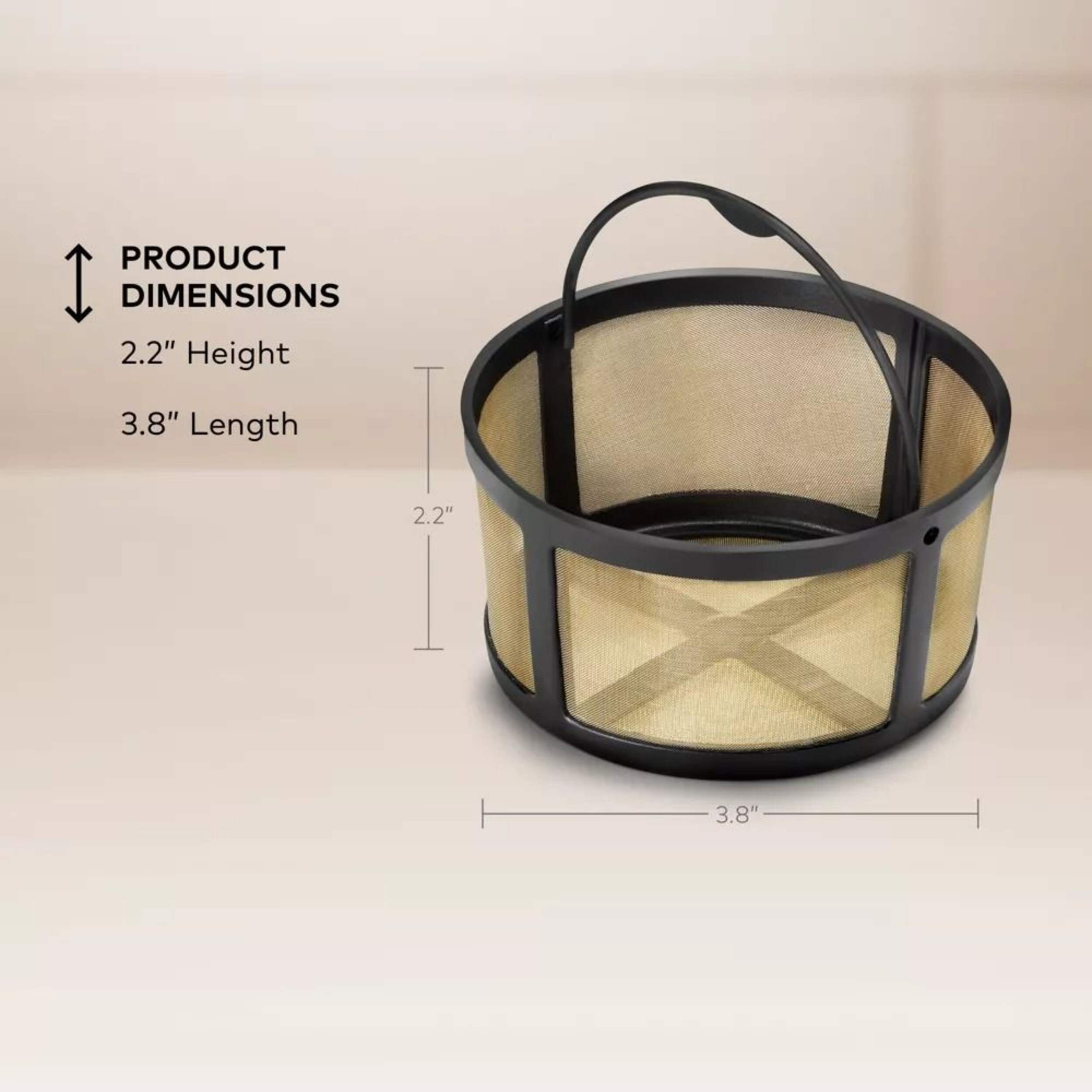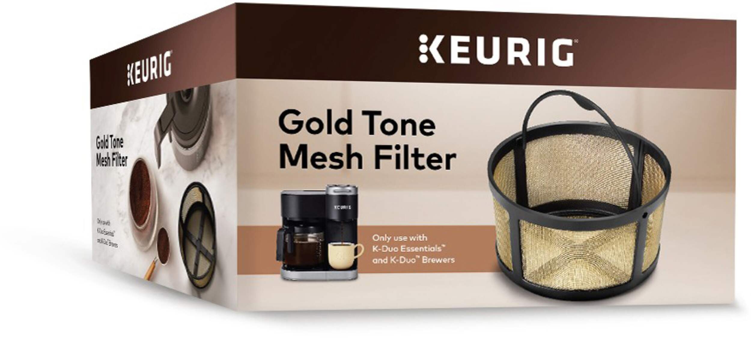 Enjoy the fresh-brewed coffee you love and eliminate the need for disposable coffee filters with the Keurig® Gold Tone Mesh Filter. Designed for use with the K-Duo™ and K-Duo Essentials™ Single Serve & Carafe Coffee Makers, the reusable Gold Tone Mesh Filter is the easy and eco-friendly way to brew a carafe of delicious ground coffee. Designed with ease in mind, the attached handle makes the Gold Tone Mesh Filter easy to fill and clean (hand wash only), so it’s perfect for hosting gatherings of any size, treating friends and family to all their freshly brewed favorites, or enjoying a pot on your own. Simply add the desired amount of ground coffee to the filter basket (we recommend 1 tablespoon per cup) and brew. • Holds up to 15 tbsp. of regular coffee or up to 12 tbsp. of decaf coffee• Product Dimensions: 3.8”L X 2.2” H