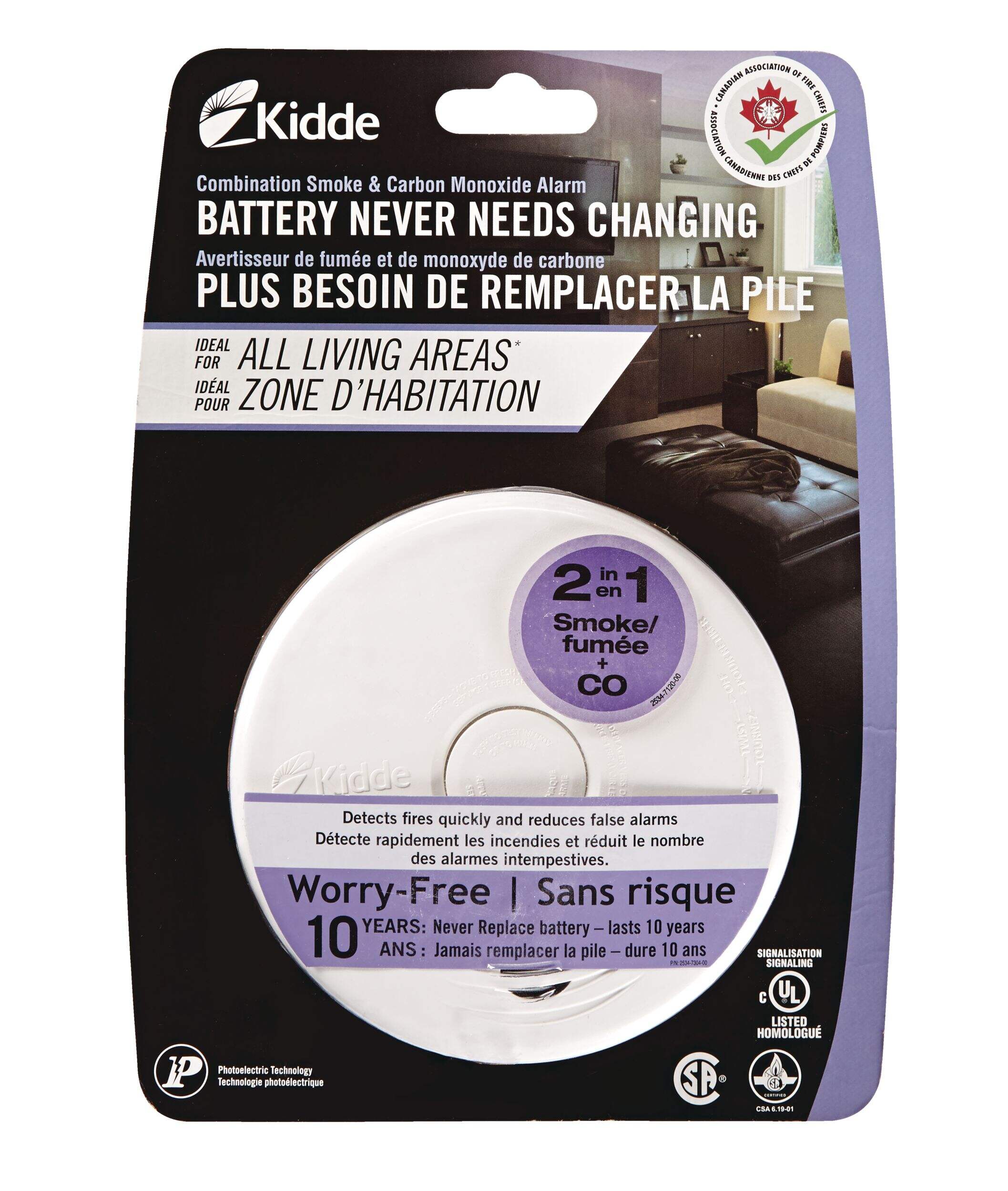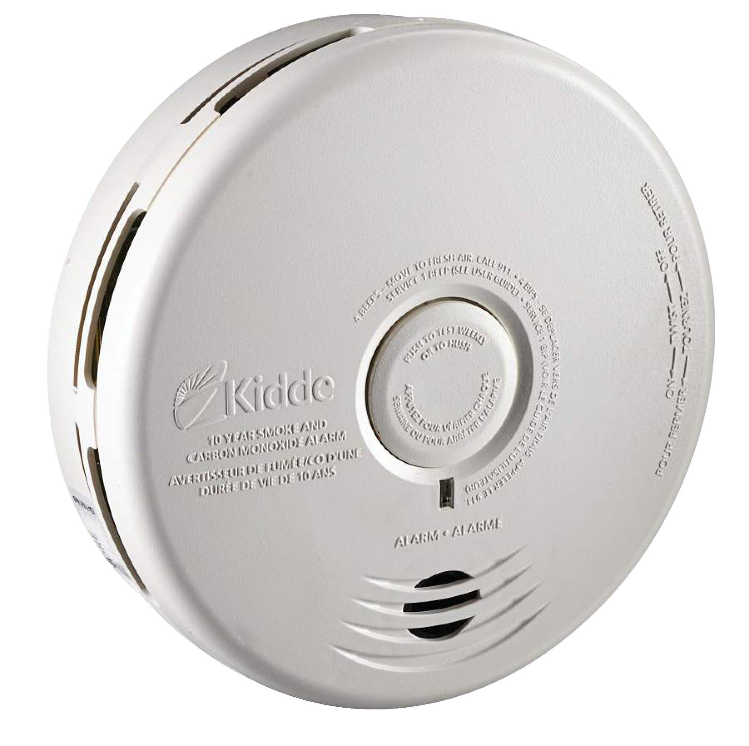 The Kidde P3010CUCA is a 10-year, sealed battery, smoke and carbon monoxide alarm that features photoelectric and electrochemical sensing technology with a Hush® feature and a voice warning to help identify the danger. The alarm will automatically activate when it is attached to the mounting bracket; there are no pull-tabs, no switches, everything is automatic. At the end of alarm life, the unit will chirp, indicating the alarm is in need of replacement. The customer can use a simple tool such as a screwdriver to deactivate the unit, stopping the chirp and making it safe for disposal. This smoke alarm uses photoelectric sensing technology. Photoelectric sensing alarms may detect visible fire particles (associated with slow smouldering fires) sooner than ionization alarms.
