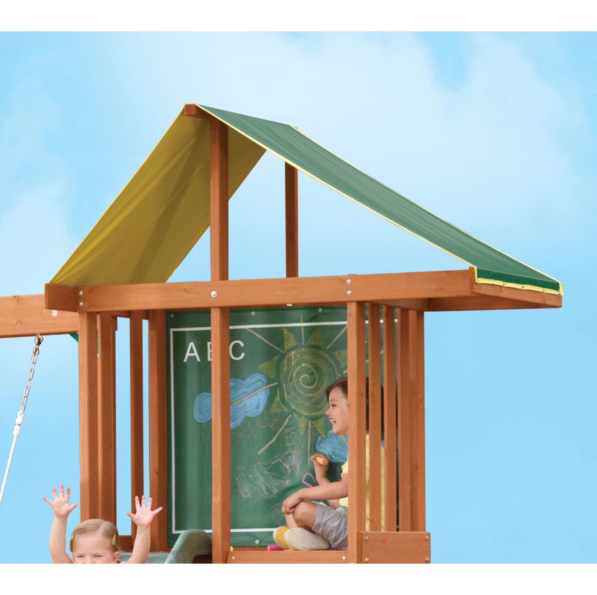 Rock wall ladder leads to an upper clubhouse with a vinyl chalkboard wall for creativity