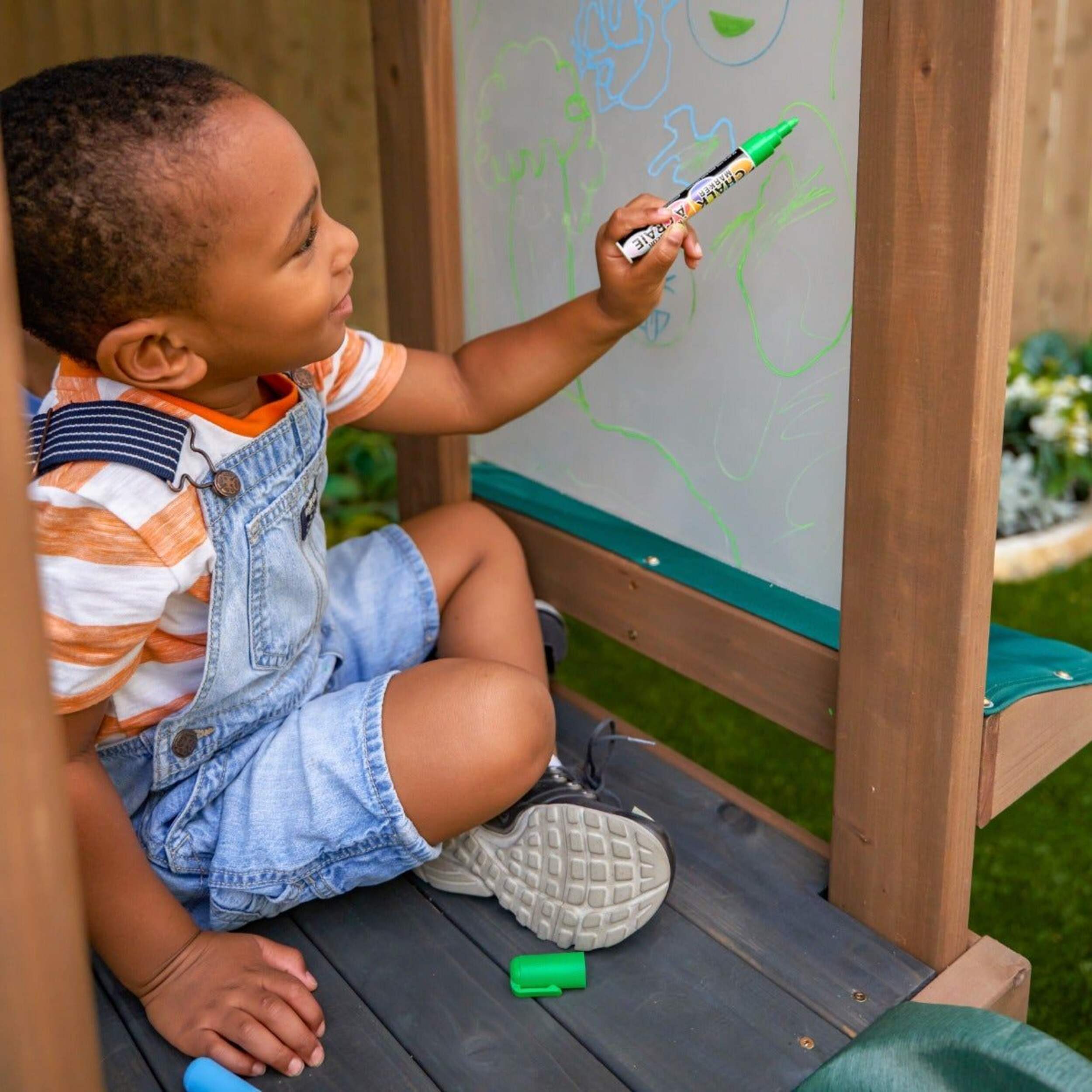Designed for smaller backyards, this wooden playset has tons of fun for a whole troop of kids. Hike up the ladder to reach the shaded deck where you can draw your own unique "pictographs" on the art wall. A nice fabric canopy provides shade during the day. Take a trip down the slide and pretend it's a ride down a rushing river. Hop on a swing and soar through the air like a hang glider over the treetops. When you need a break from the adventure, rest at the attached table and bench set. Enjoy some trail snacks and map out your next journey. It's always non-stop action in the Wilderness Point Swing Set.