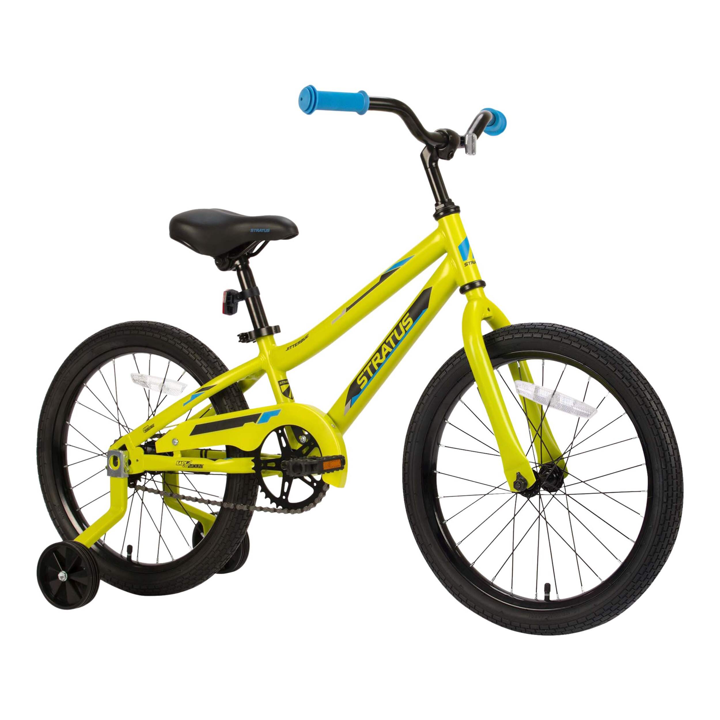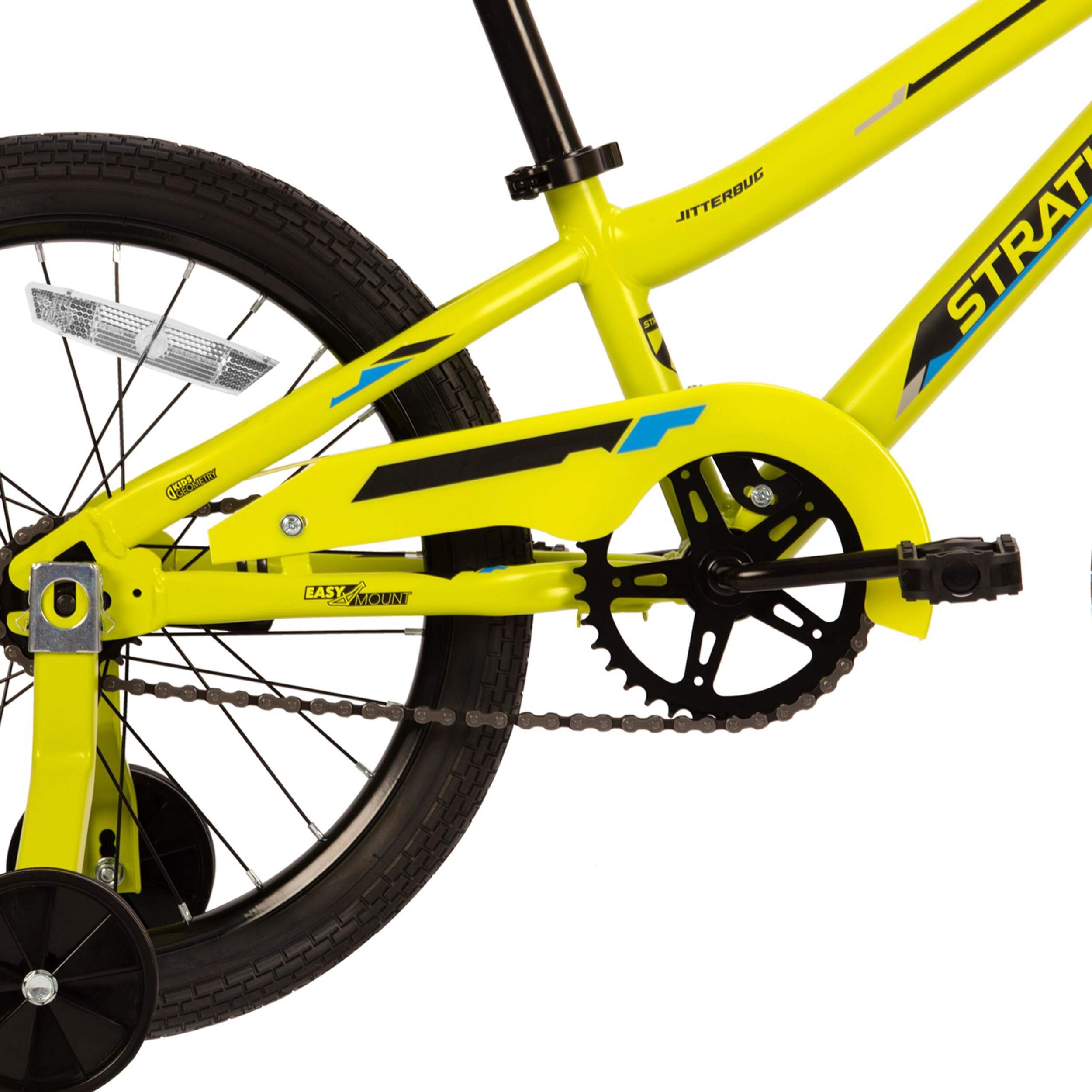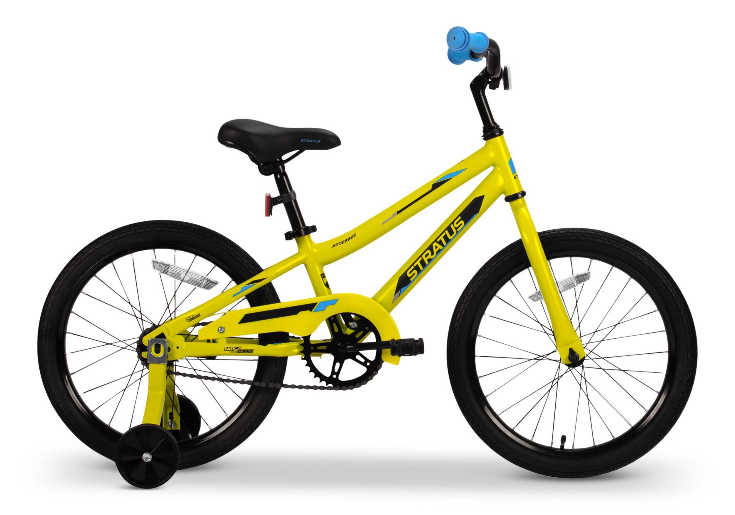 The Kids' Stratus Jitterbug Bicycle combines style and functionality for young riders. It features a custom lower steel frame with CO2 welding, ensuring durability and making it easy to mount. The single-speed drivetrain and coaster brake offer straightforward control, while the smooth inverted tread tires provide a comfortable riding experience. With training wheels and an adjustable seat, this bike is ideal for beginners.
