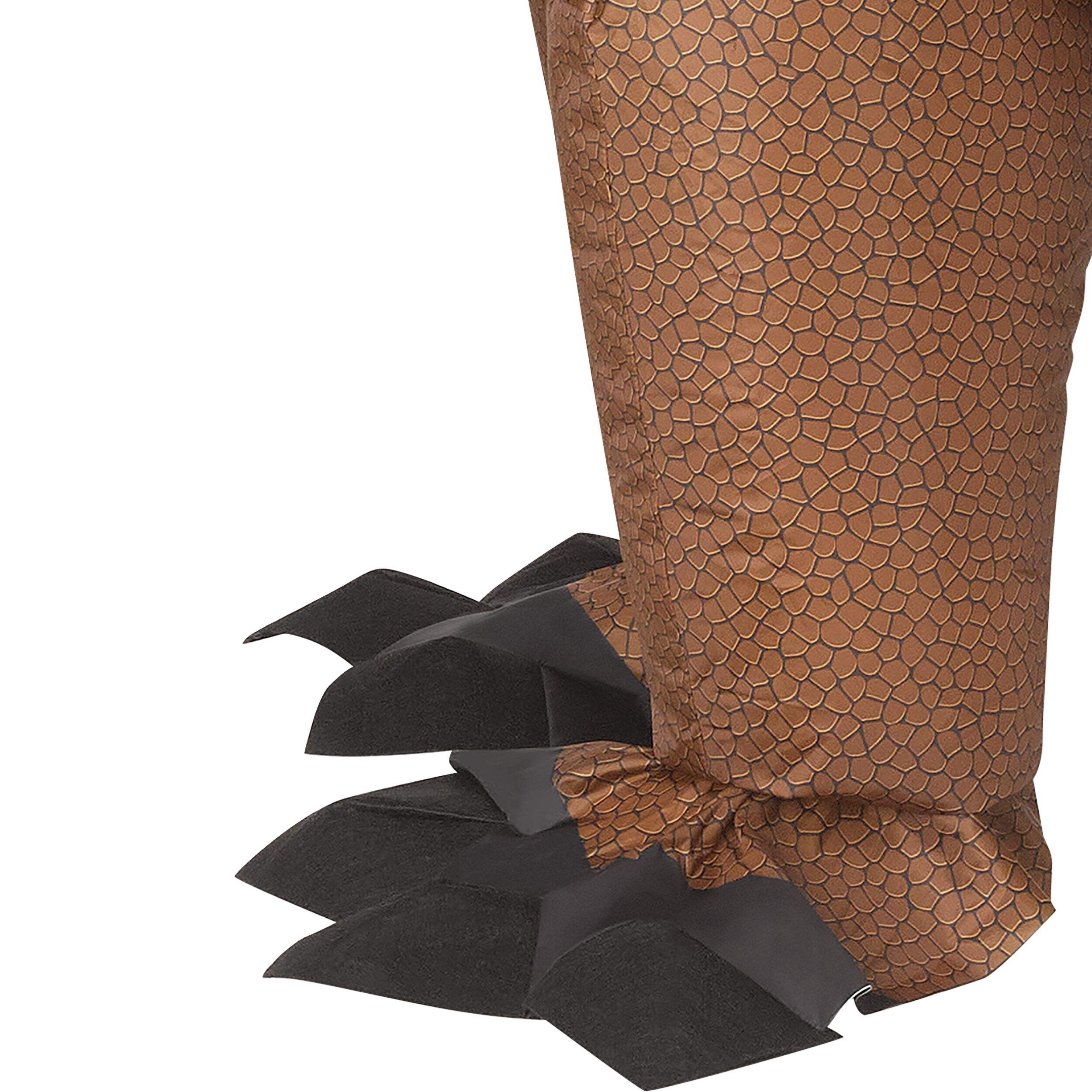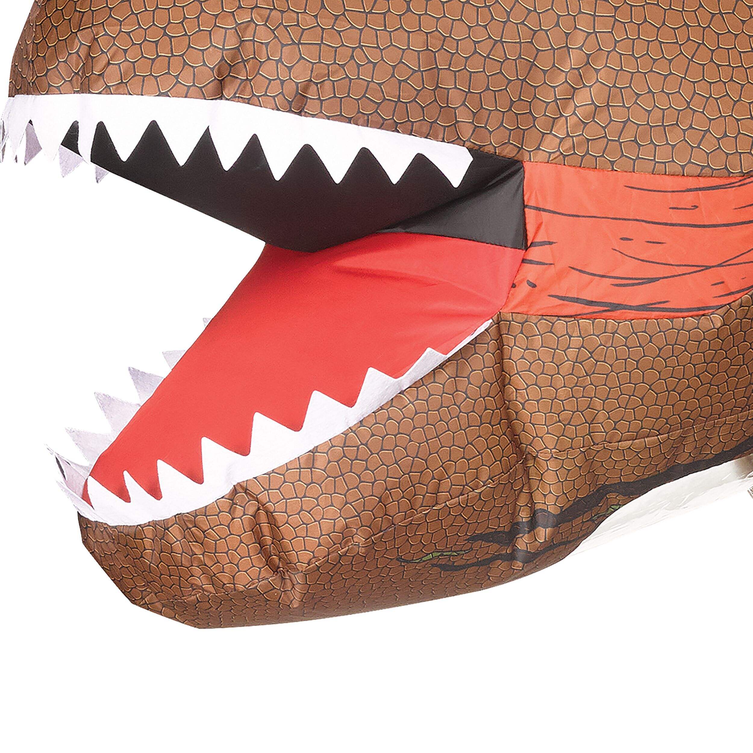 The Kids' T-Rex Dinosaur Inflatable Halloween Costume features a lightweight one-piece dinosaur suit that comfortably transforms kids into a towering T-Rex. Screen-printed details cover all sides, including ferocious teeth and scales. A battery powered fan keeps the t-rex costume inflated for ease of wear, and the face opening ensures that children can easily see through the mouth.