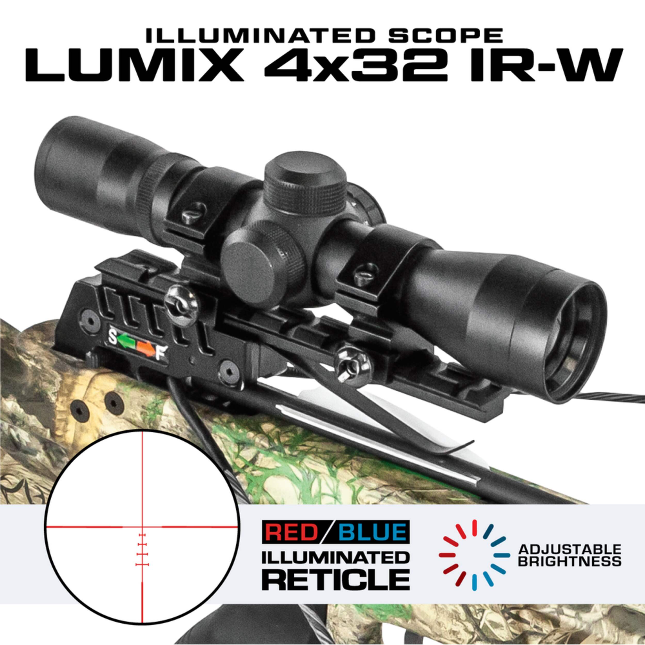 Pacakage Includes: LUMIX 4 x 32 IR-W Scope, Rope Cocker, String Suppressors, 5-Bolt Quiver, (3) HYPR Lite Bolts and Field Tips, Stick of Rail Lube