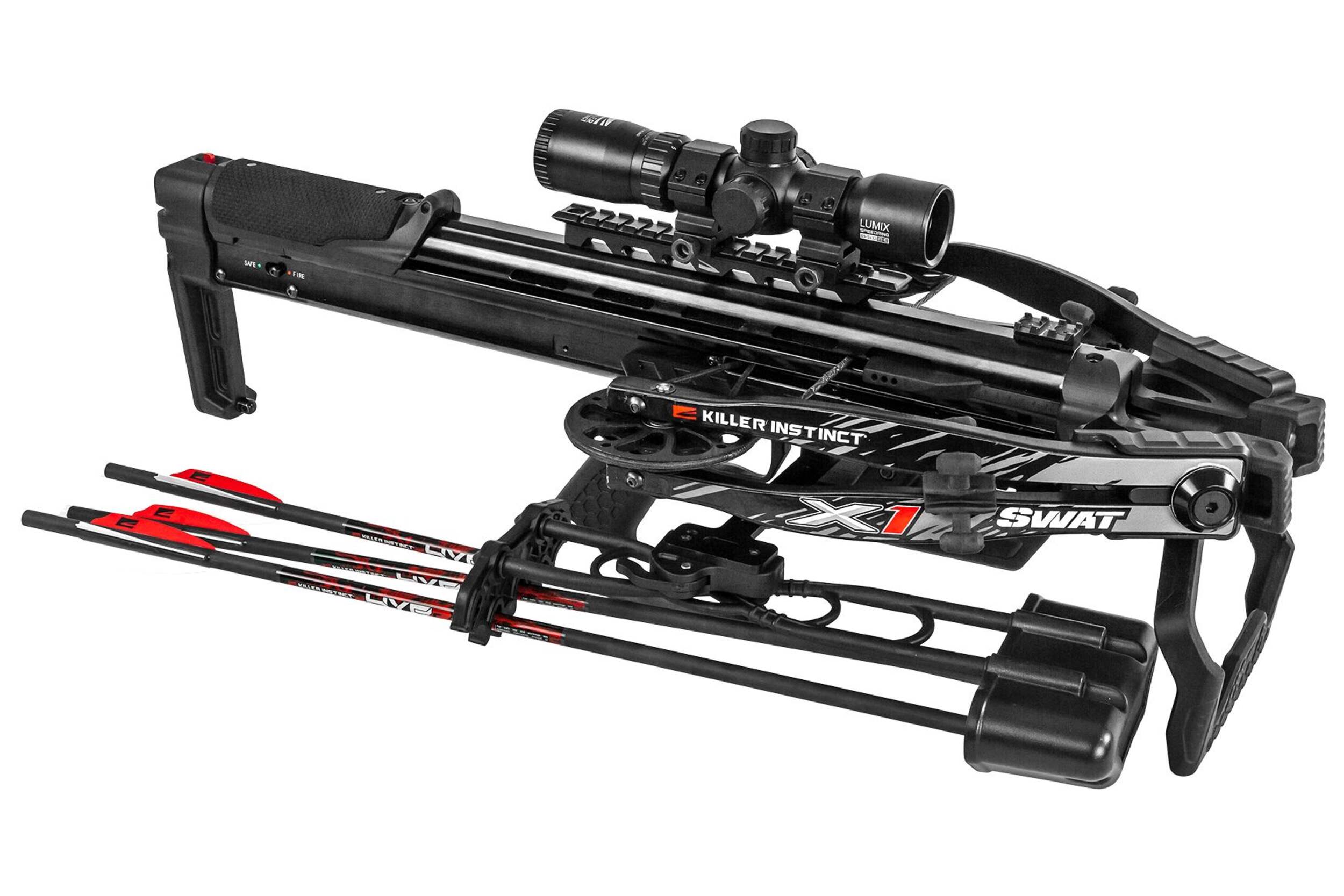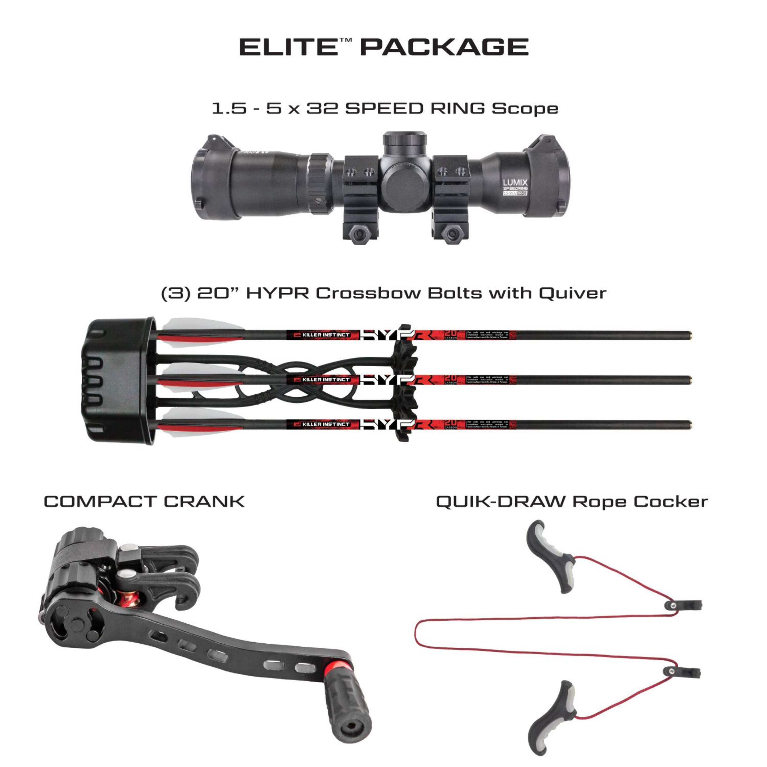 Includes: LUMIX Speed Ring 1.5 - 5 x 32 IR-E Scope, Compact Silent Crank, Quik-Draw Rope Cocker, Quiver, (3) 20" HYPR Bolts (390 grains) with Field Tips, Stick of Rail Lube