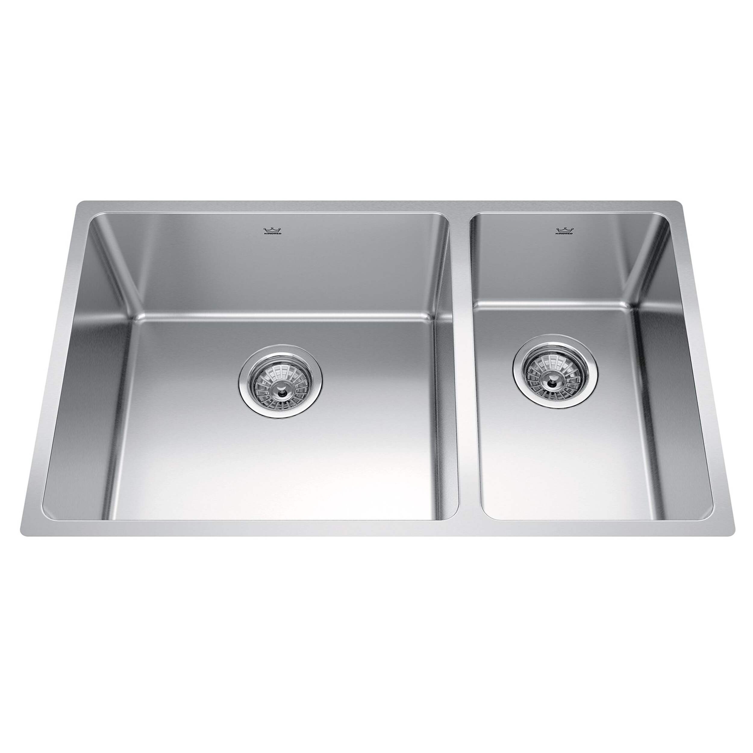 Brookmore Collection 30.6-in x 18.2-in Undermount Double Bowl Stainless Steel Kitchen Sink. The Brookmore stainless steel sink collection will create something truly unique that fits both prepping and cleaning needs. Made with high-quality 18-gauge stainless steel with a rich chromium content that helps shield the material from corrosion and prevents bacterial growth. The undermount sink style provides a sleek, modern look and makes cleaning up spills and messes easy. The spacious 9" deep bowls are perfect for soaking and washing stacks of dishes, and the sound-dampening system goes to work to reduce the noise caused by a garbage disposal or running water.