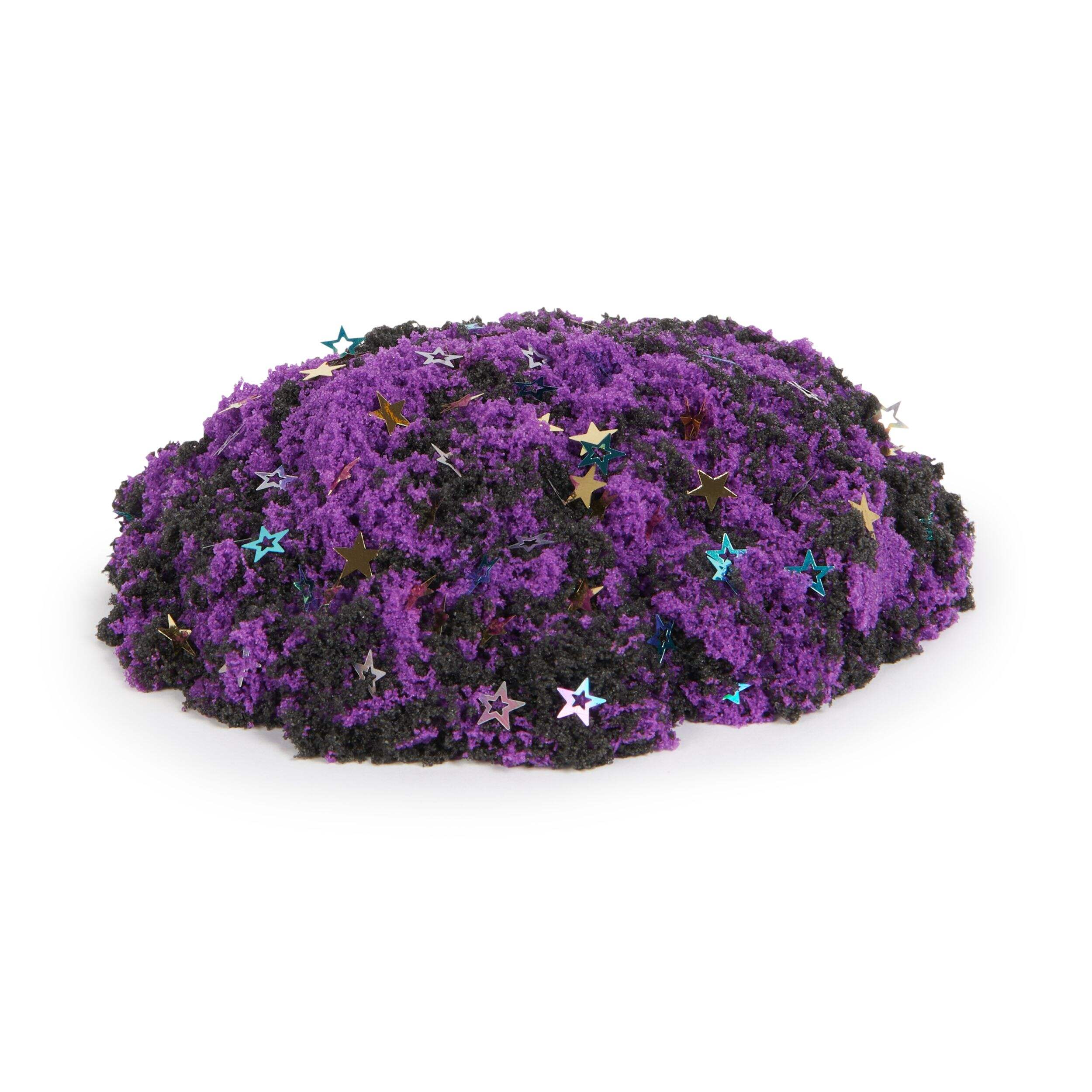 Comes with 2 Kinetic Sand colors, 1 themed tool, 2 stamper lids, and sparkly mix-ins