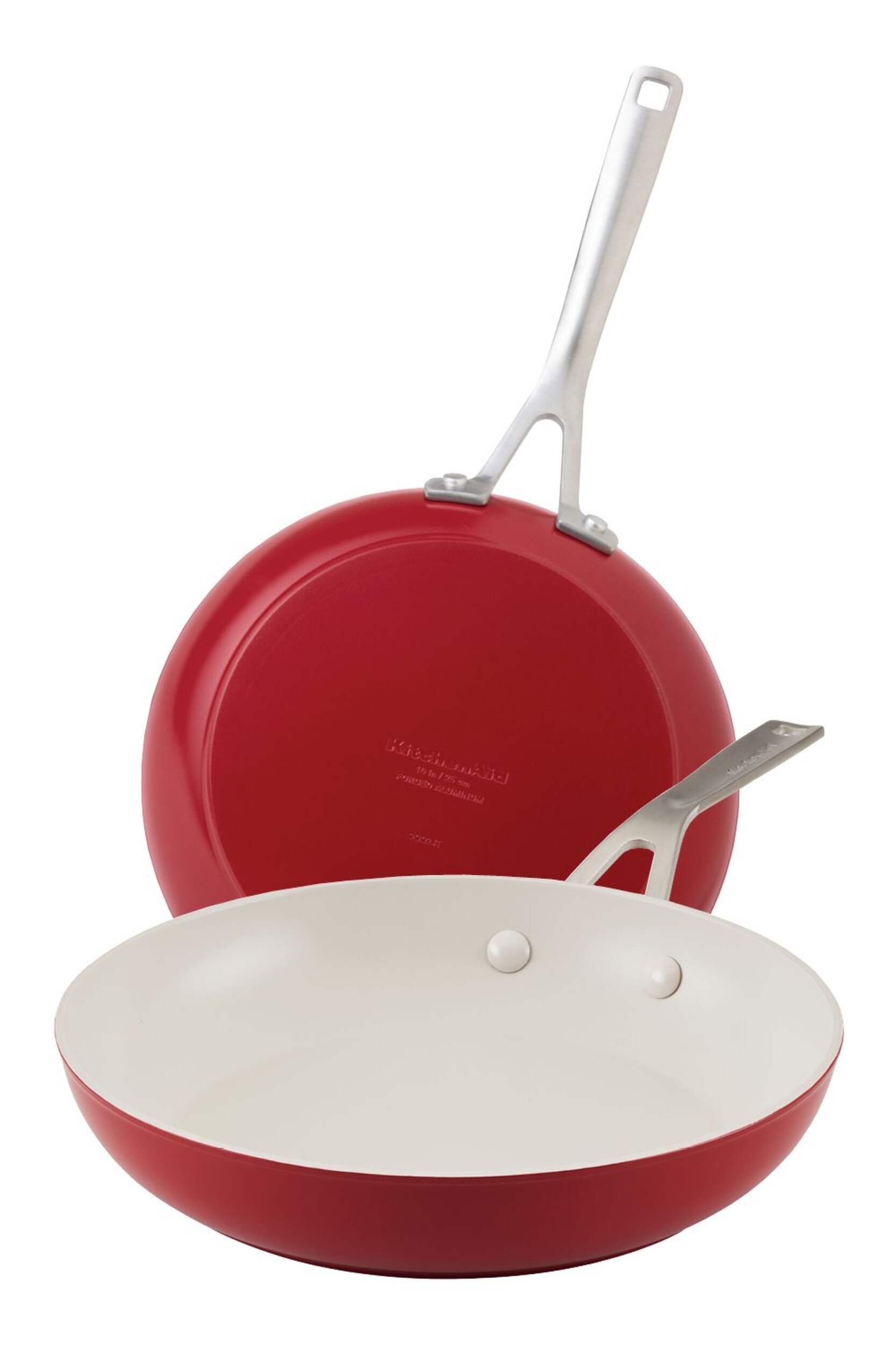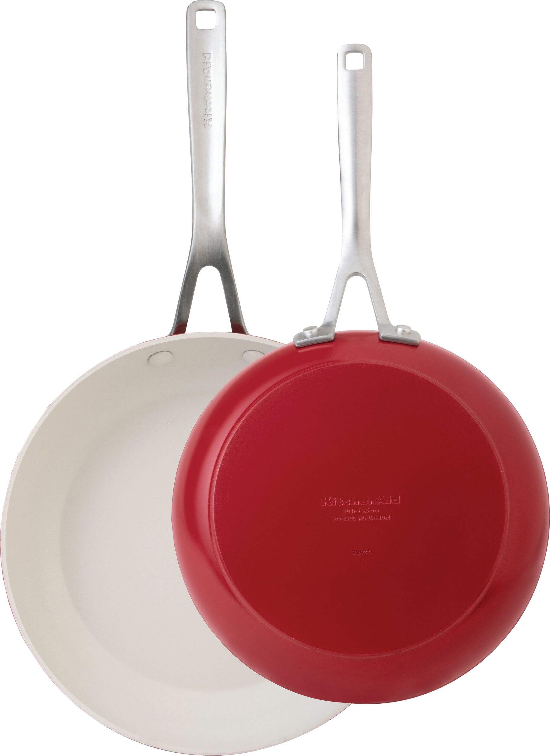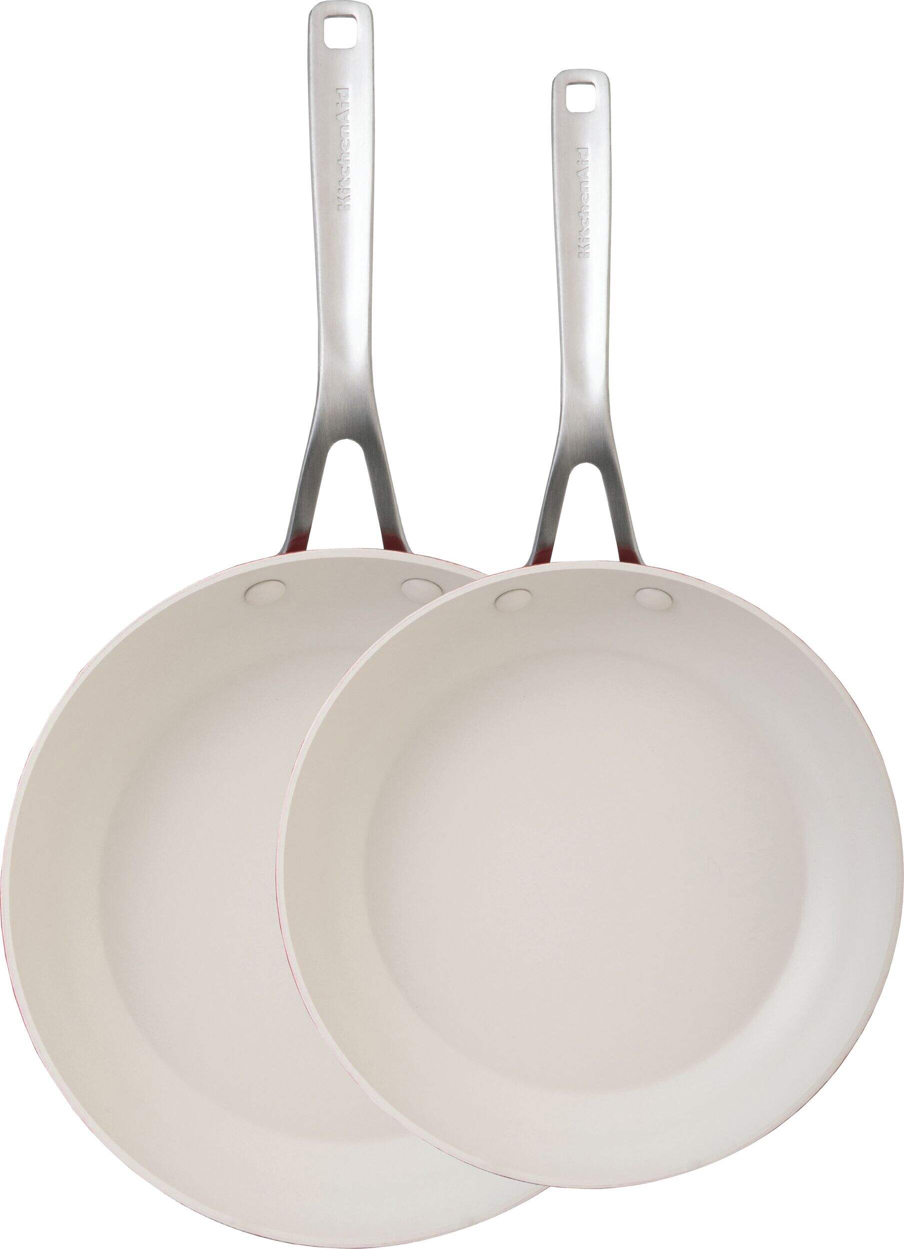 The KitchenAid Ceramic Forged Aluminum Fry Pans 2-Pack contains a pair of pans with durable aluminum bodies for optimal heat distribution. Stainless steel handles further improve the pans' durability, making this pack an ideal choice for anyone seeking resilient cookware.