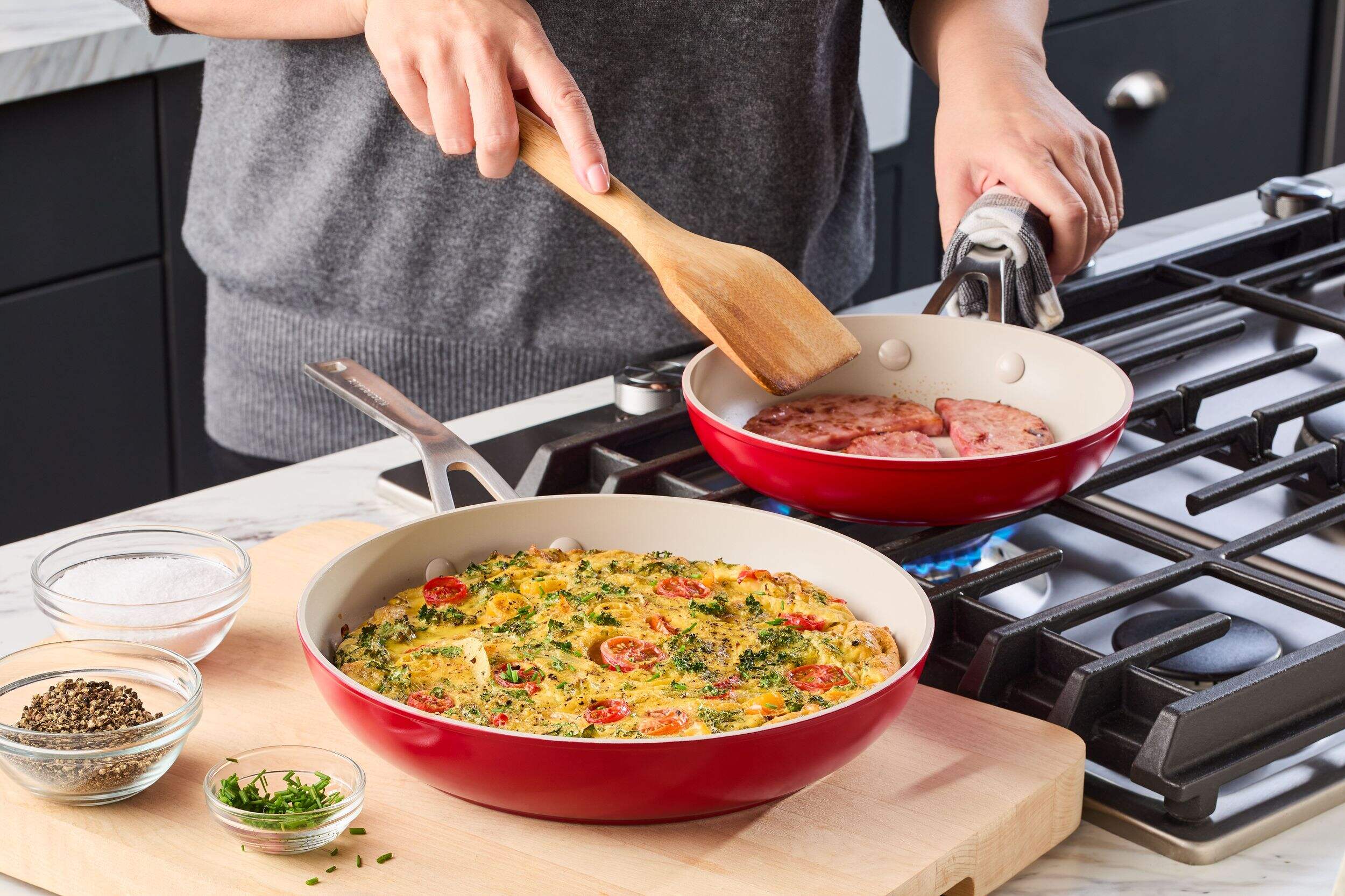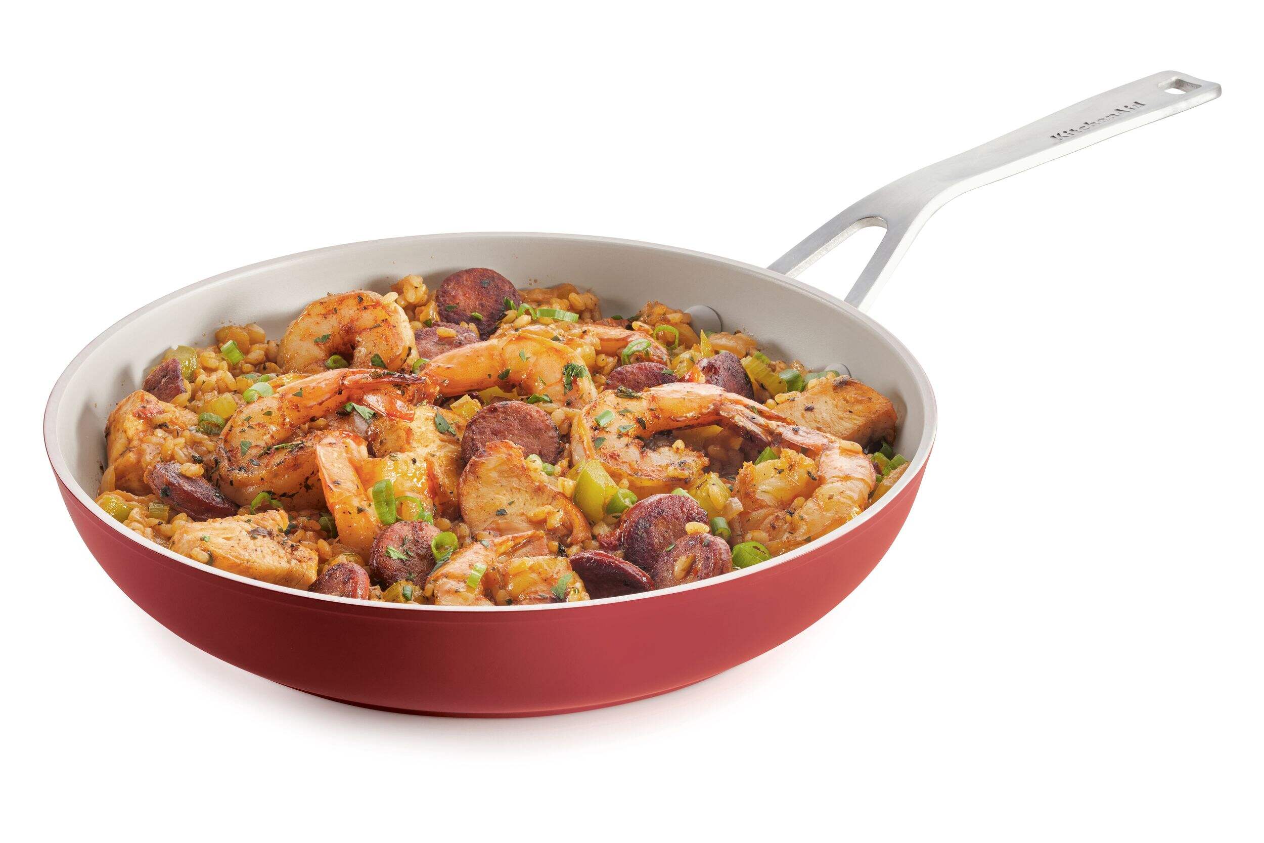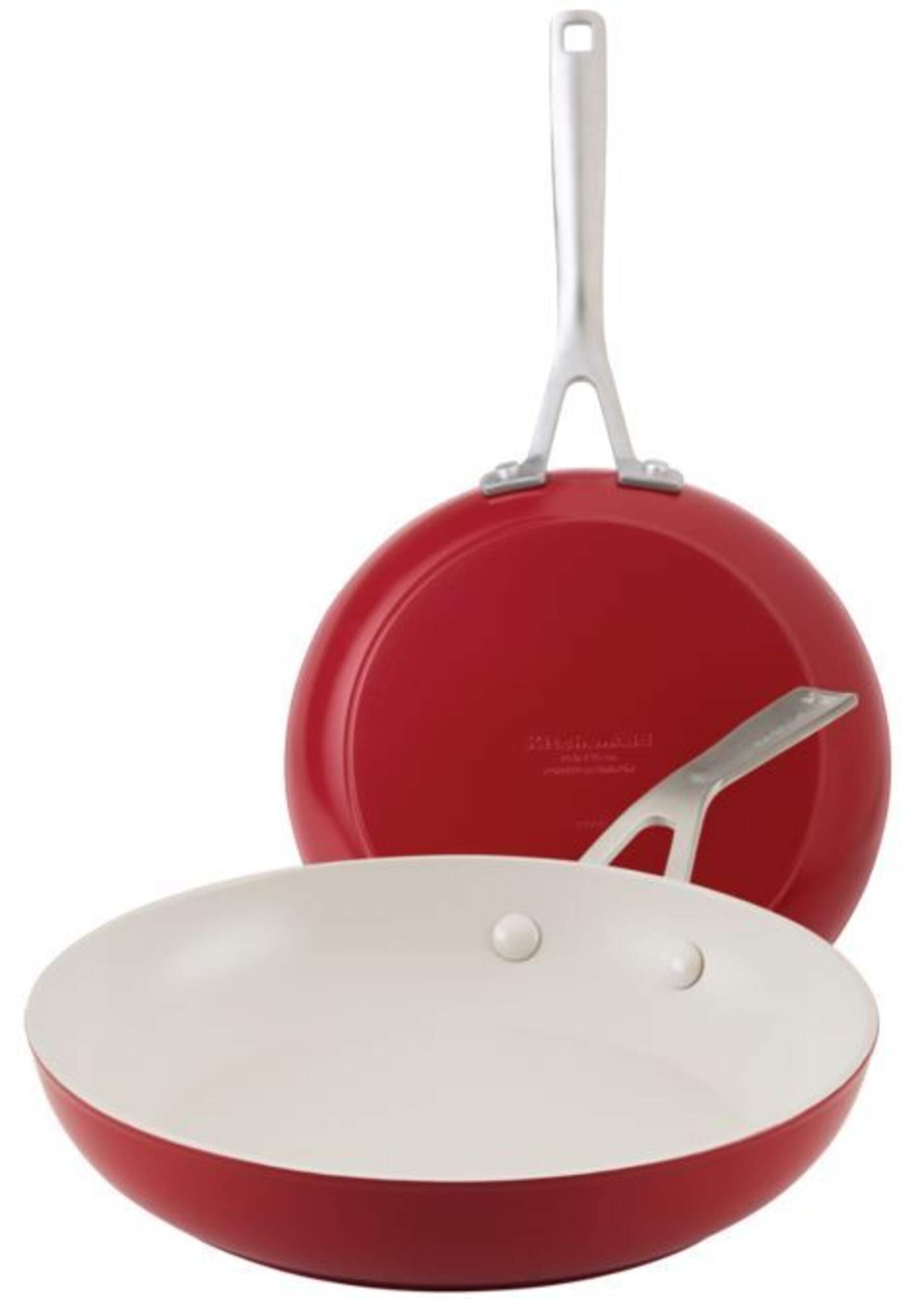 The KitchenAid Ceramic Forged Aluminum Fry Pans 2-Pack contains a pair of pans with durable aluminum bodies for optimal heat distribution. Stainless steel handles further improve the pans' durability, making this pack an ideal choice for anyone seeking resilient cookware.