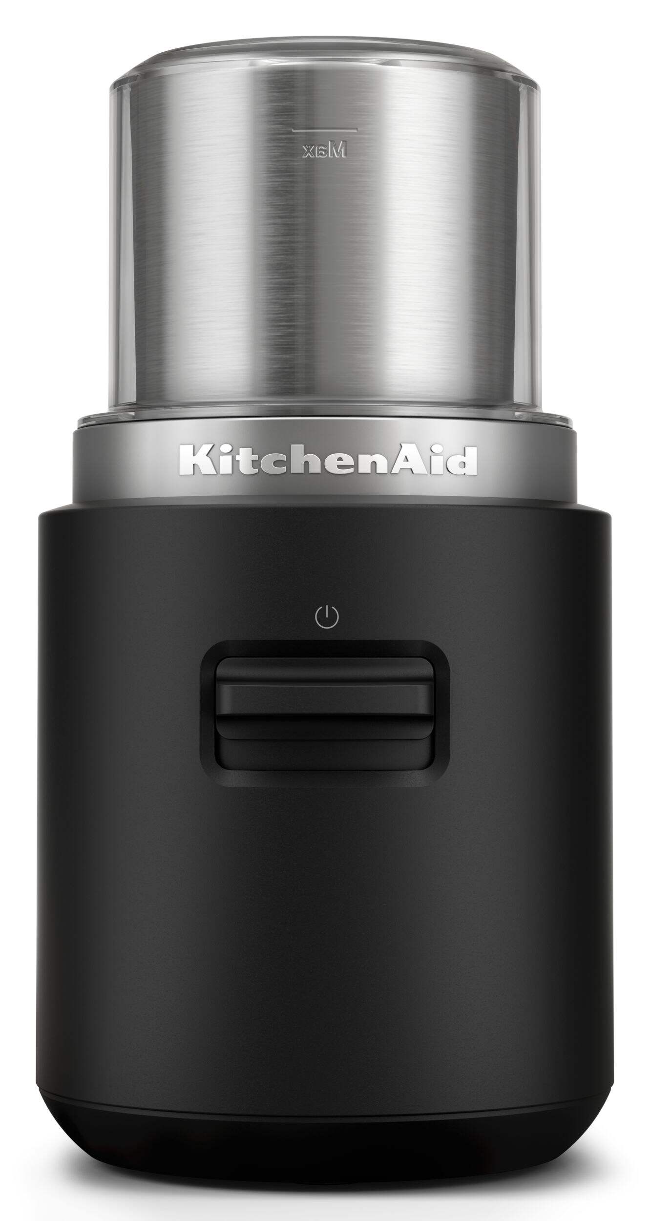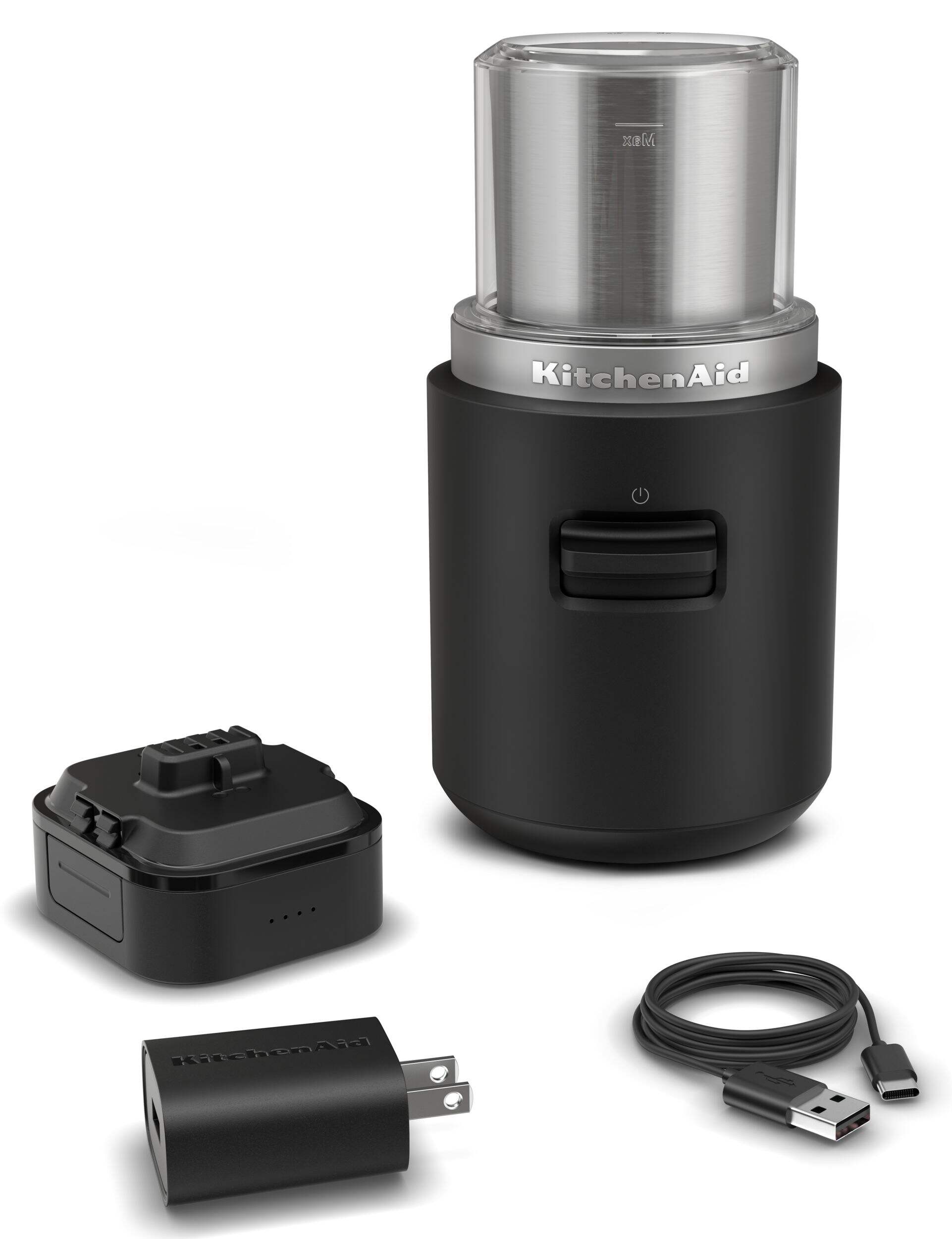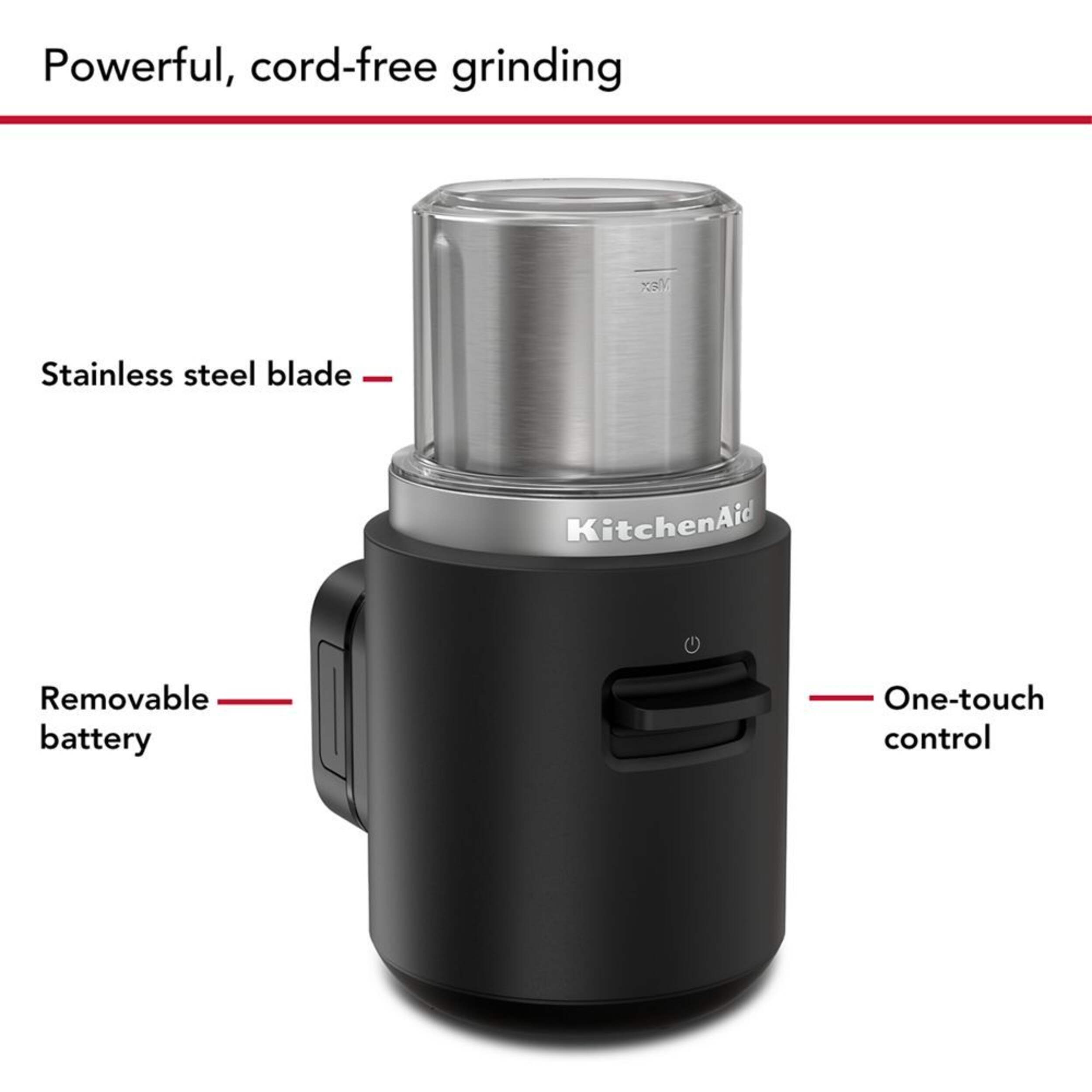 The KitchenAid Go™ Coffee Grinder offers quick grinding with the convenience of cordless operation. Powered by a removable 12V battery, this compact grinder features a stainless steel bowl for grinding spices, herbs, nuts, and coffee beans. The 4oz capacity grinds enough beans to make up to 12 cups of coffee. Designed for portability, this cordless spice and coffee grinder can be used from countertop to campsite.