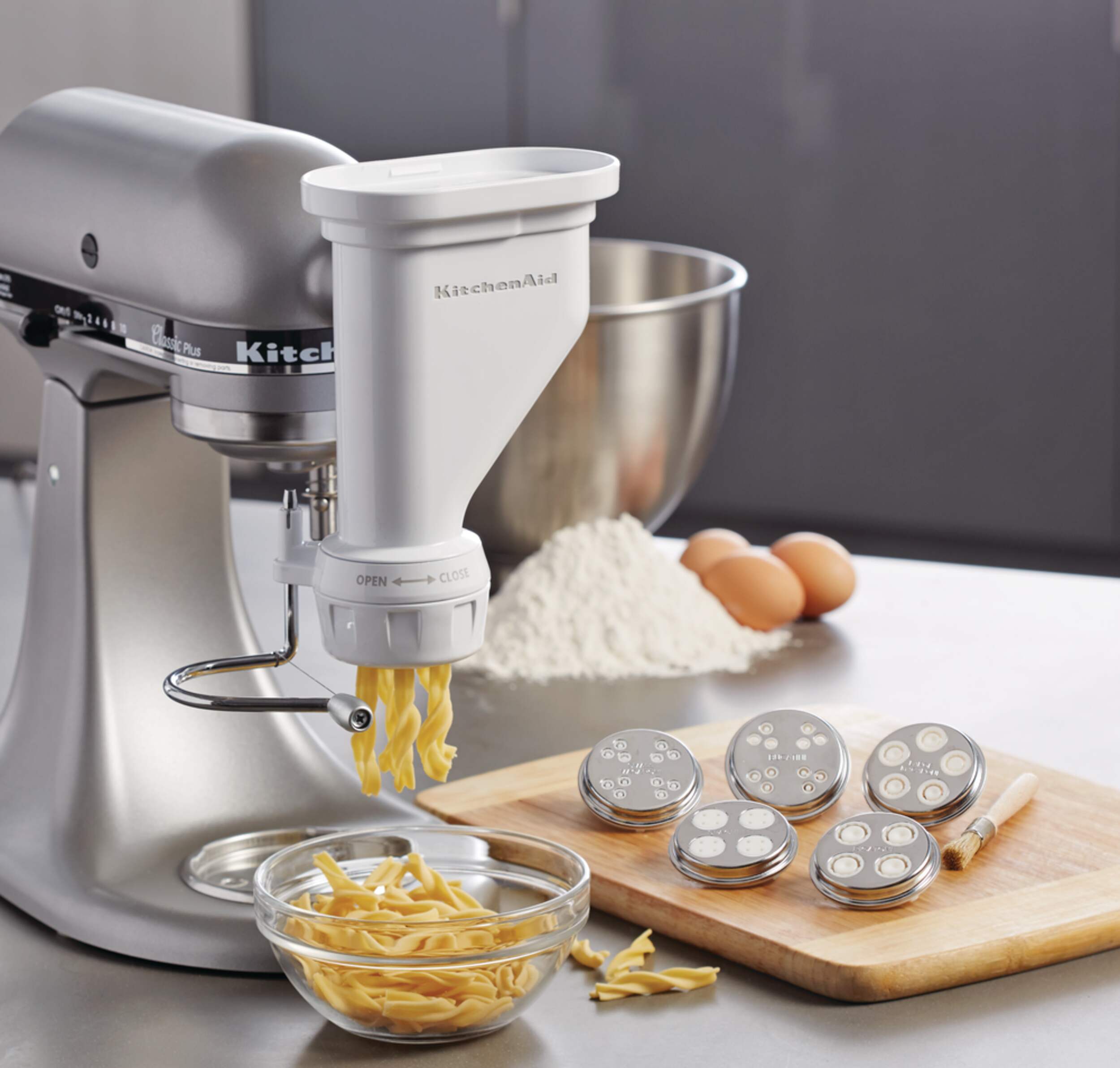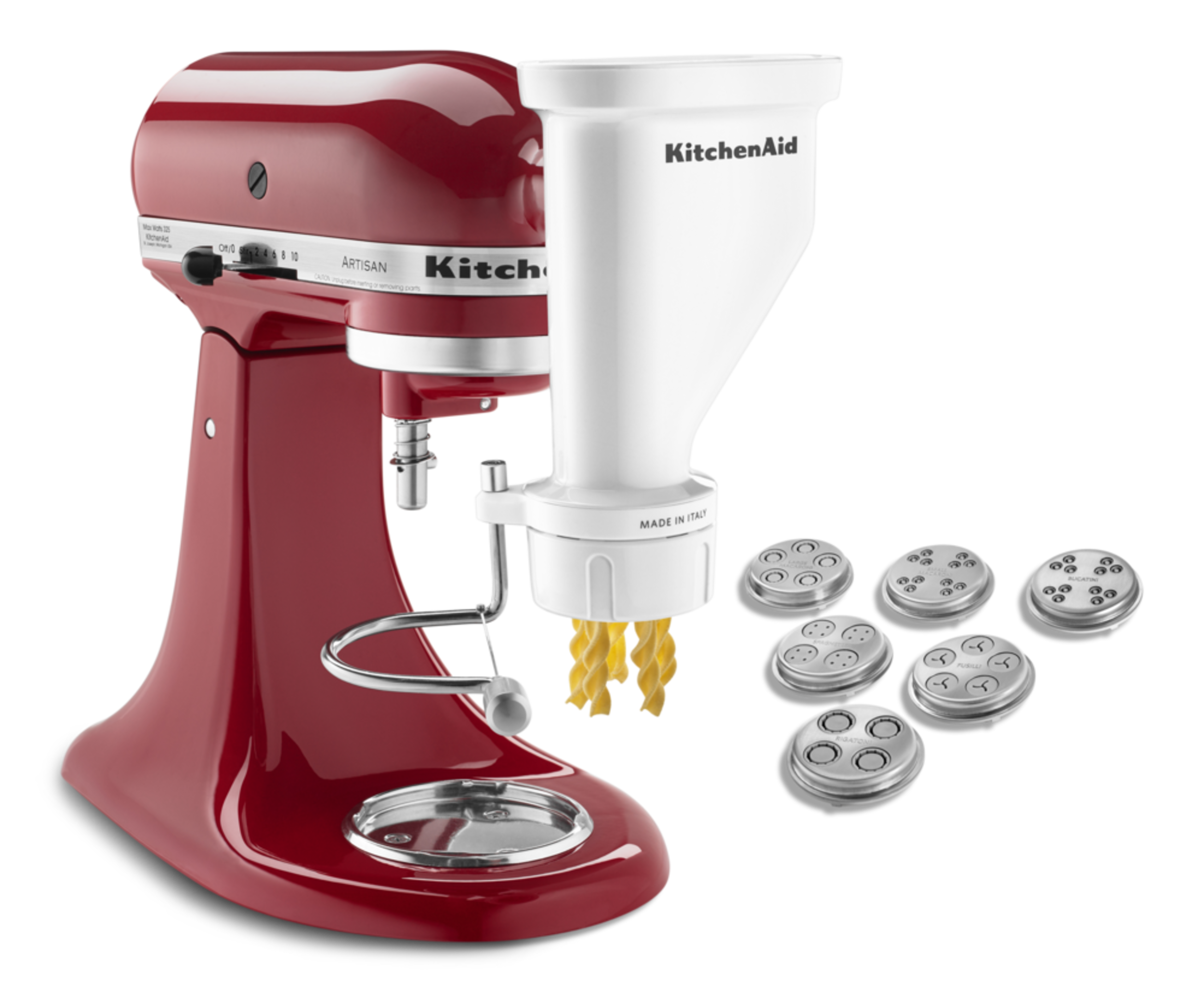 The KitchenAid® Gourmet Pasta Press Attachment comes with 6 change discs. It's the perfect tool for creating homemade pasta with ease. Attach it to your KitchenAid® Stand Mixer* (sold separately) to effortlessly make six different pasta shapes, including spaghetti, rigatoni, fusilli, and more. This attachment simplifies pasta-making, letting you enjoy fresh, delicious pasta right at home. Ideal for pasta lovers and budding chefs eager to explore new recipes, it brings convenience and creativity to your kitchen.