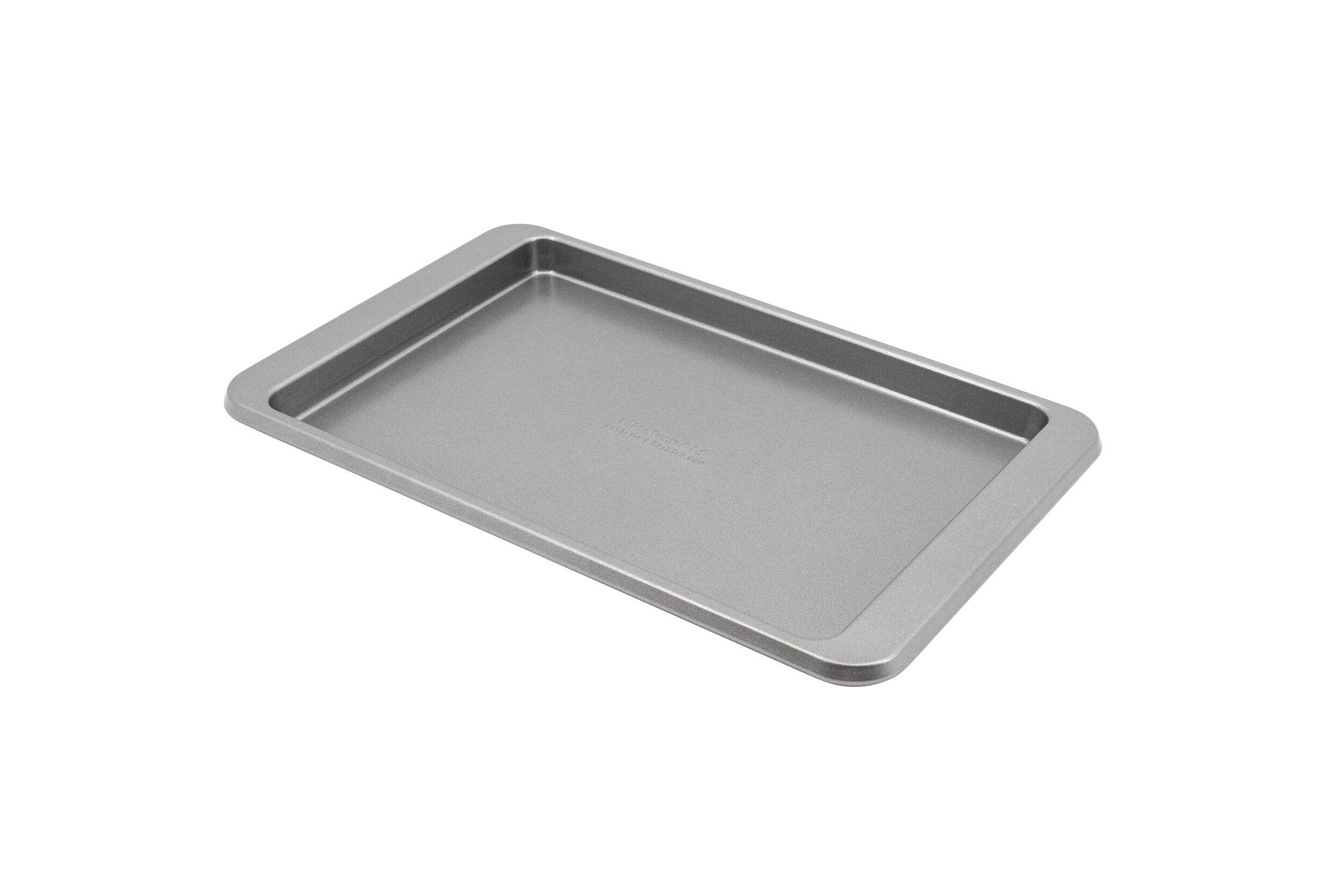 The KitchenAid Non-Stick Rectangle Cookie Baking Sheet, Small, bakes up perfection, whether you're whipping up sweet treats or savoury snacks. The heavy-duty aluminized steel construction and superior nonstick coating mean your cookies will release easily and the pan will withstand the test of time. The extended handles allow for easy transport in and out of the oven, even with oven mitts on. The rim design provides extra durability to prevent warping and popping. The cookie sheet is oven-safe up to 450°F/232°C and dishwasher-safe for simple cleanup.