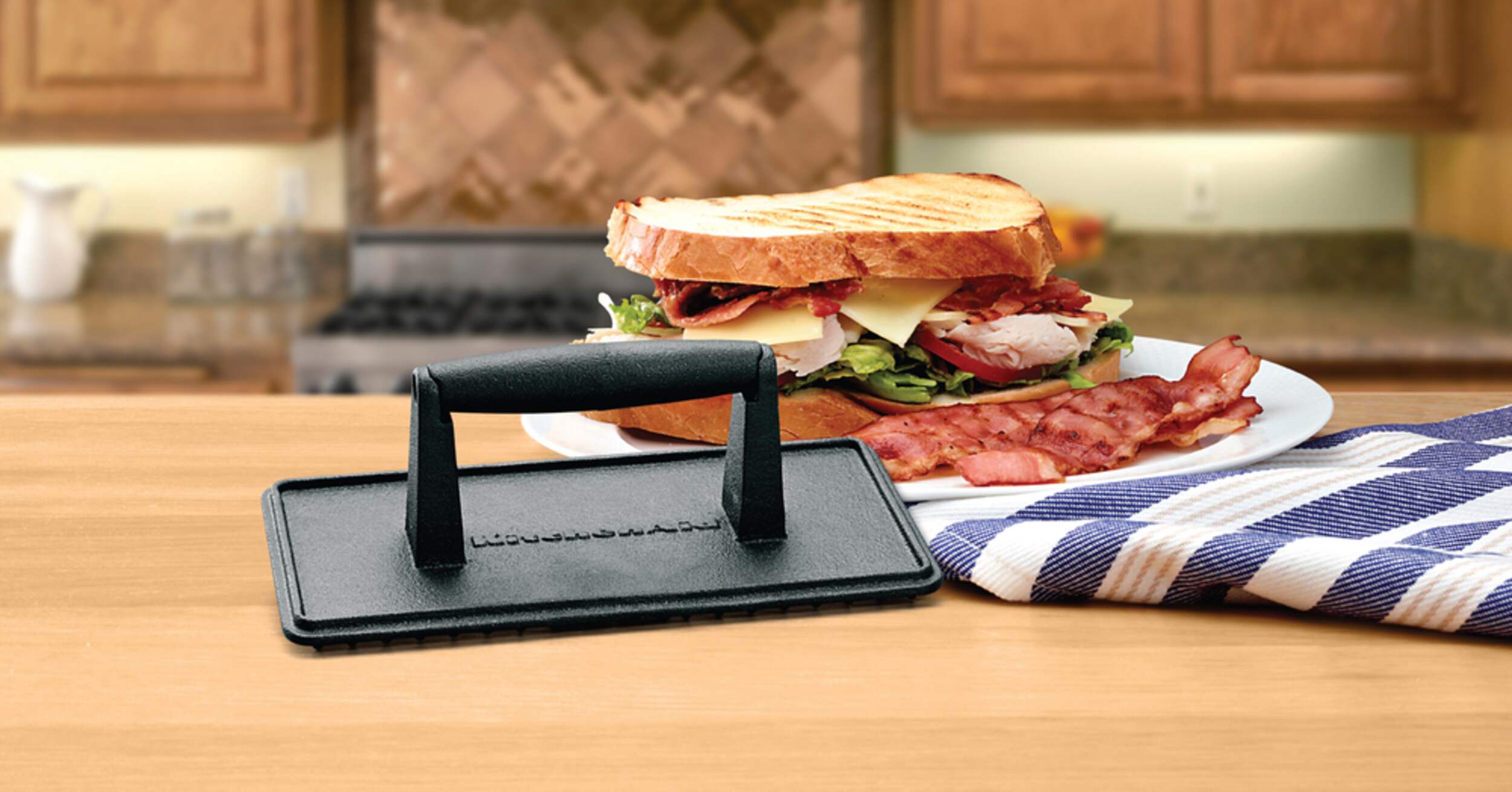 KitchenAid Rectangular Grill Press is a heavy-weight cast iron press, perfect for flattening bacon, burgers, or grilling Panini's