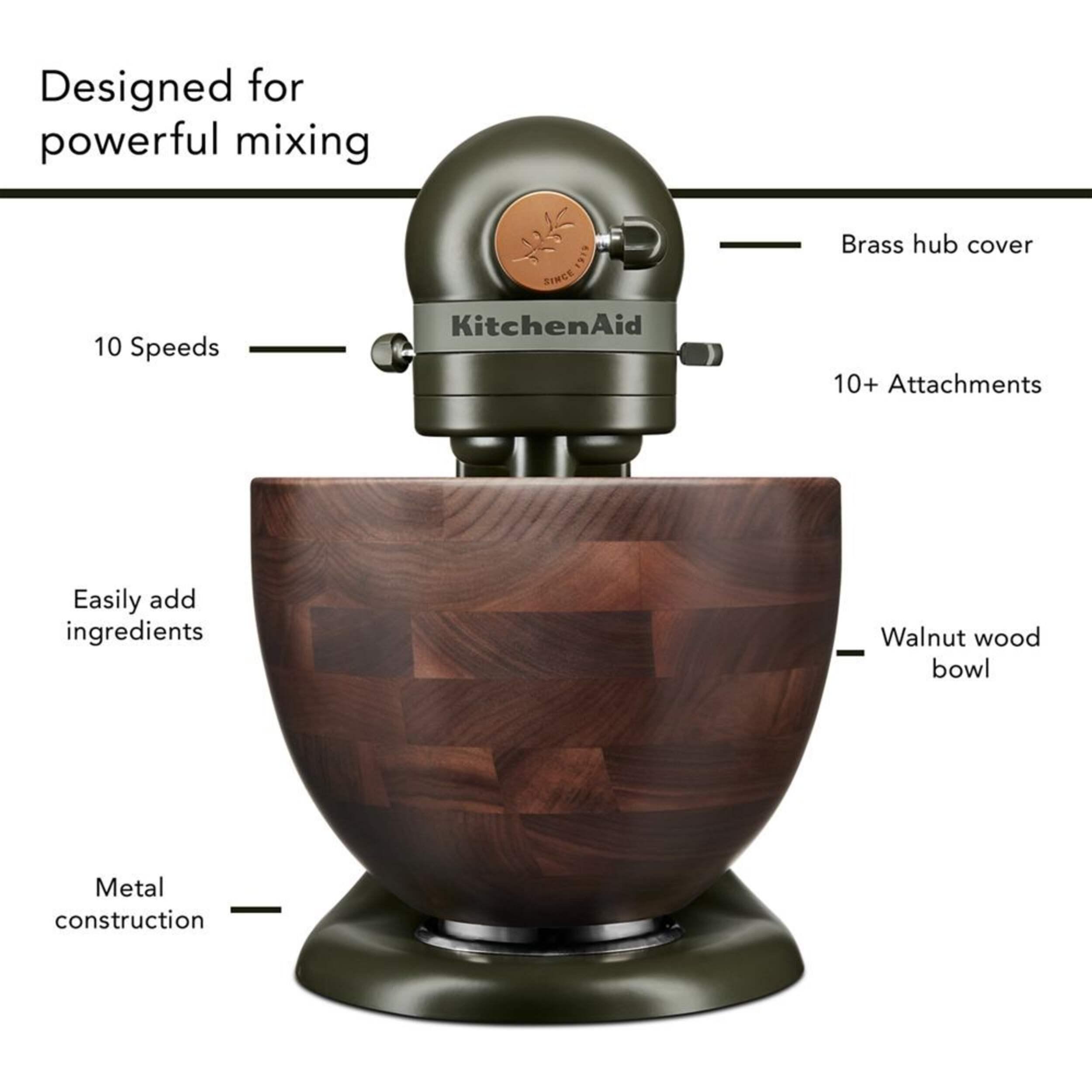 Introducing the KitchenAid Stand Mixer, a perfect blend of style and functionality. Evergreen brings the essence of the outdoors within, so you can come alive in the kitchen every single time you use it. Ground yourself in natural elements of evergreen: deep, forest green and a true, walnut wood bowl.