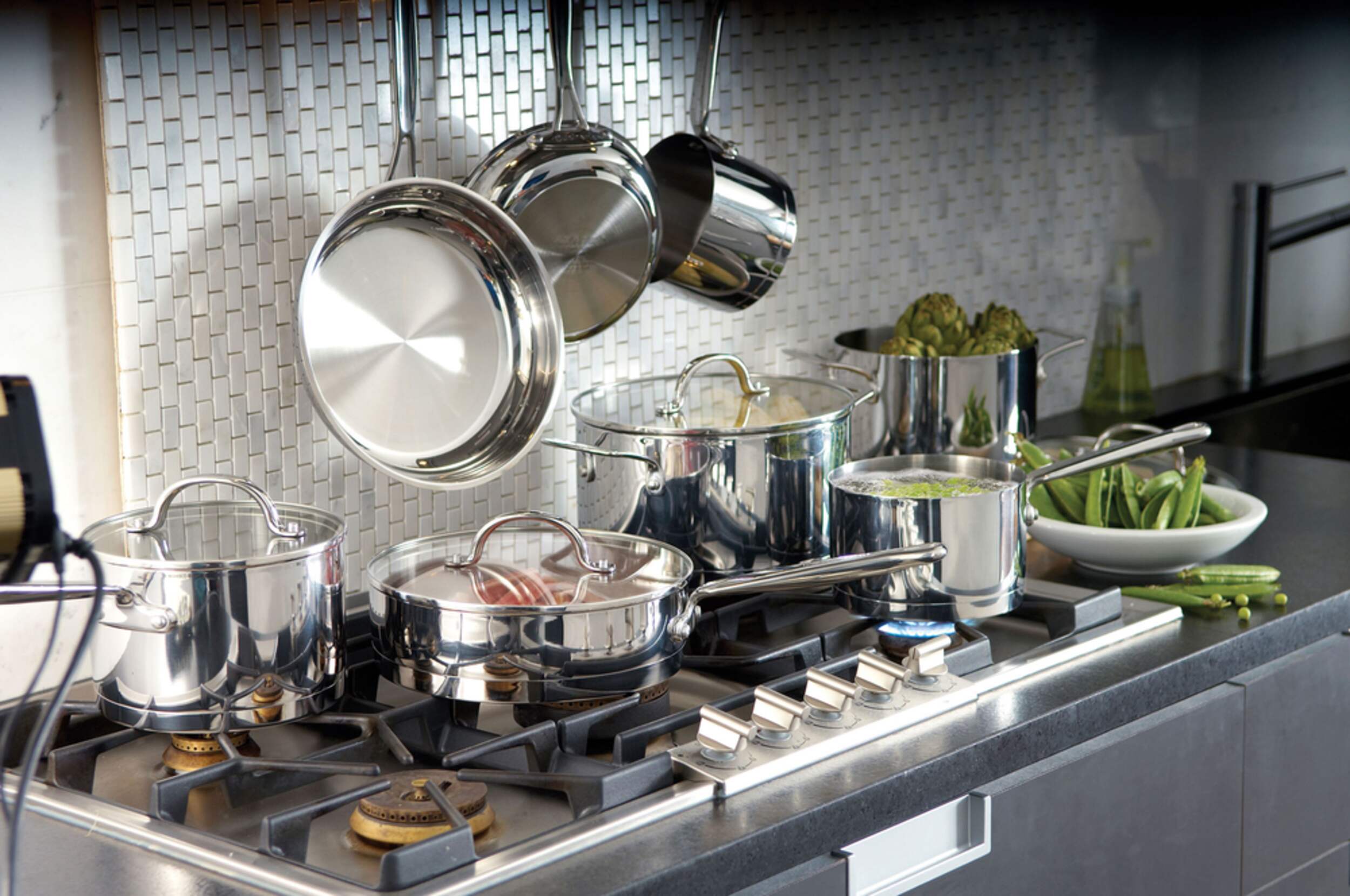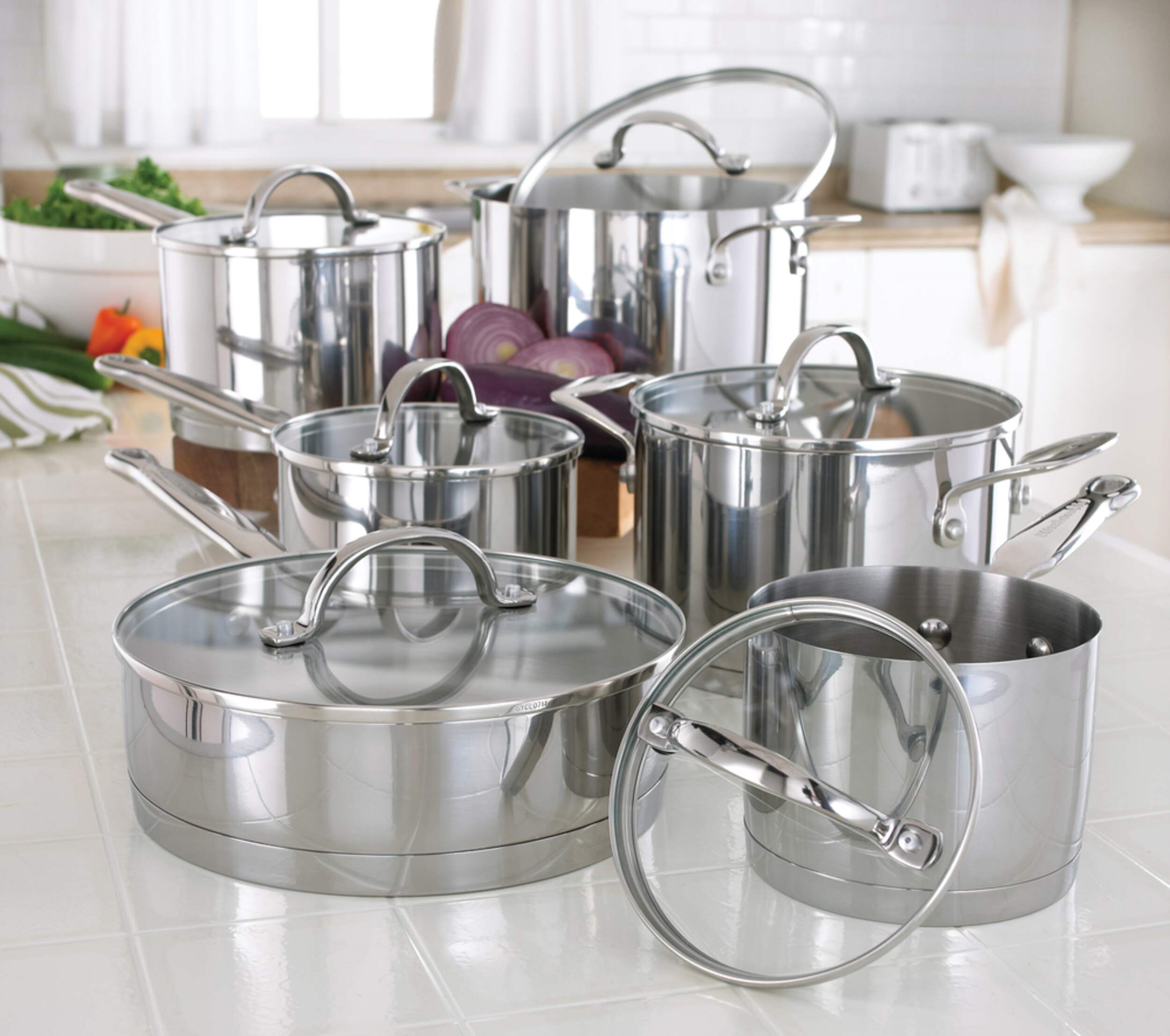 Beautifully designed and built for daily use, this KitchenAid Straightedge Cookware Set will become a kitchen favourite. Made of durable stainless steel with extra-thick, impact-bonded stainless and aluminum full cap base, the pots and pans conduct heat efficiently and evenly for best cooking results. The break-resistant lids lock in heat, moisture and flavour and let you monitor the cooking process.