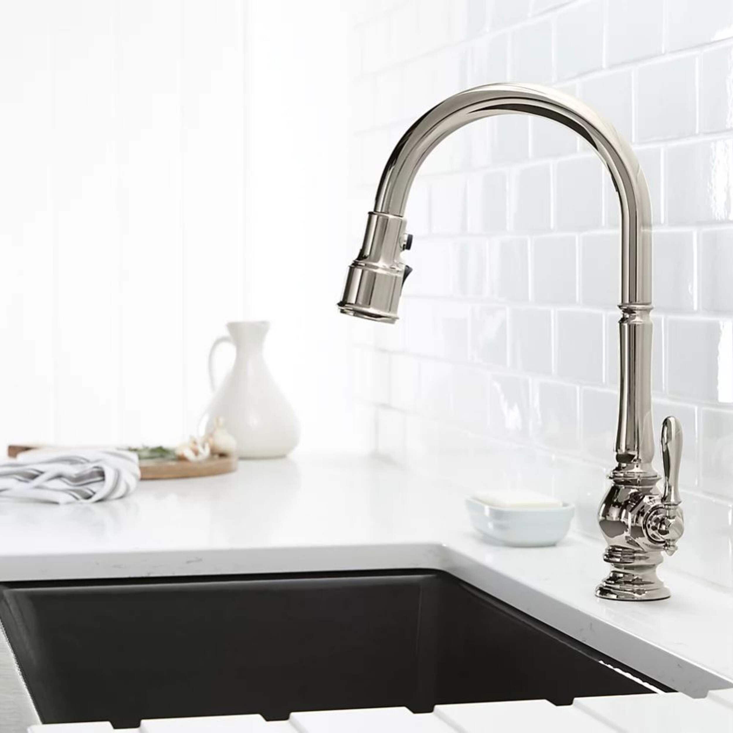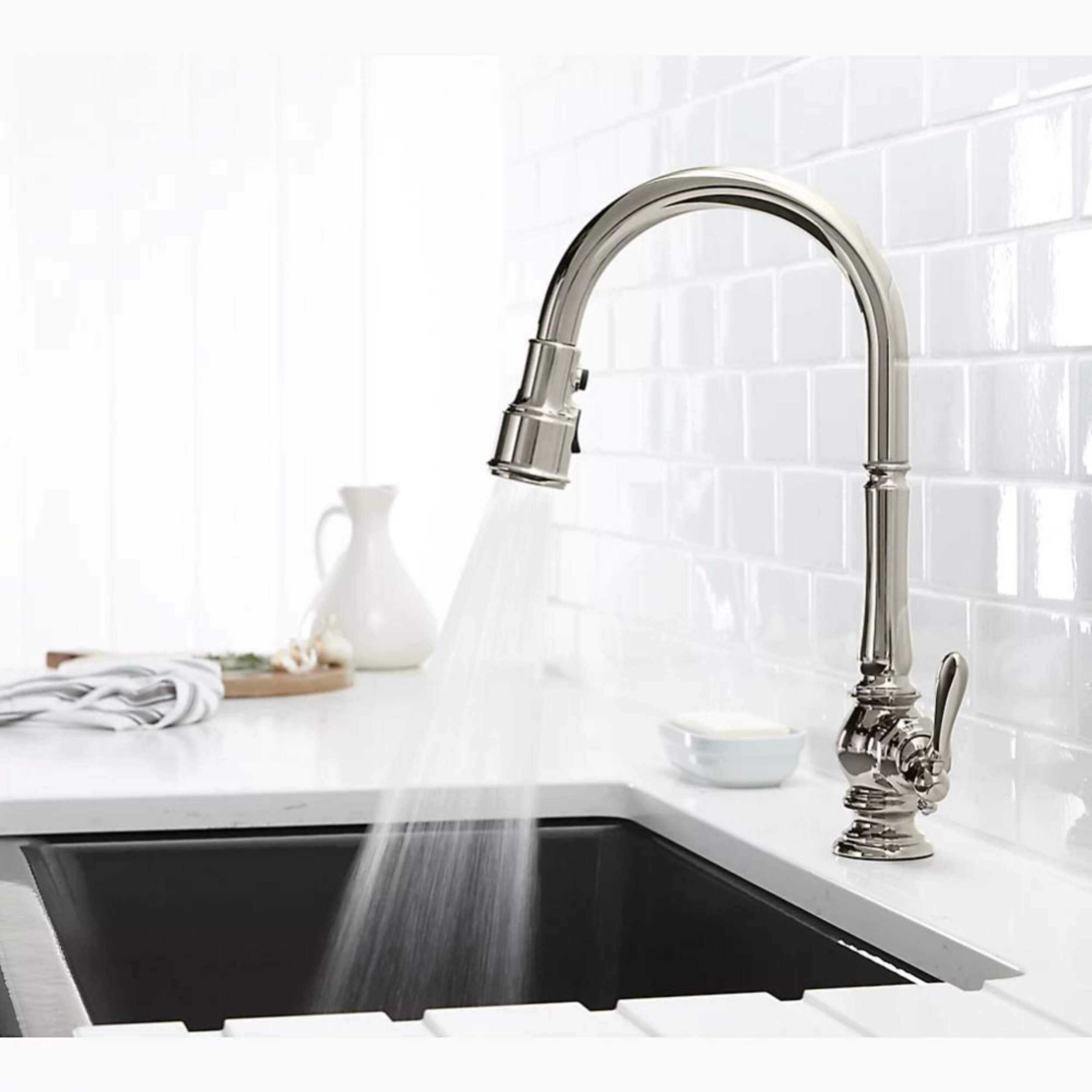 The Artifacts faucet collection brings you classic designs reimagined in fresh ways for various task areas of the kitchen. This Artifacts kitchen sink faucet displays vintage style with its high-arch spout and turned lever handle. The three-function pull-down sprayhead has you covered for a range of tasks: BerrySoft spray for food prep; an aerated stream for filling pots; and Sweep spray for cleaning. Kohler's DockNetik docking system secures the sprayhead to the spout.