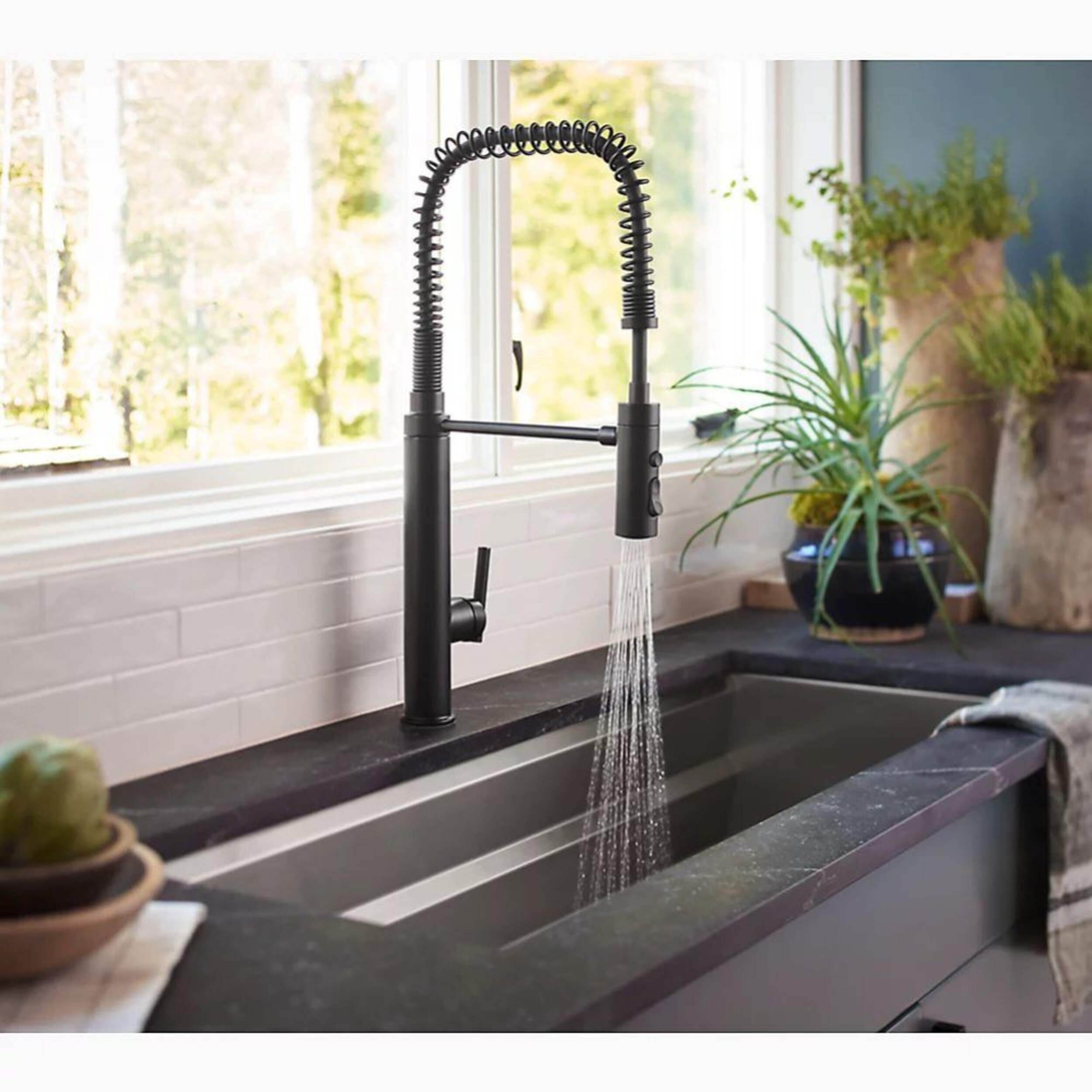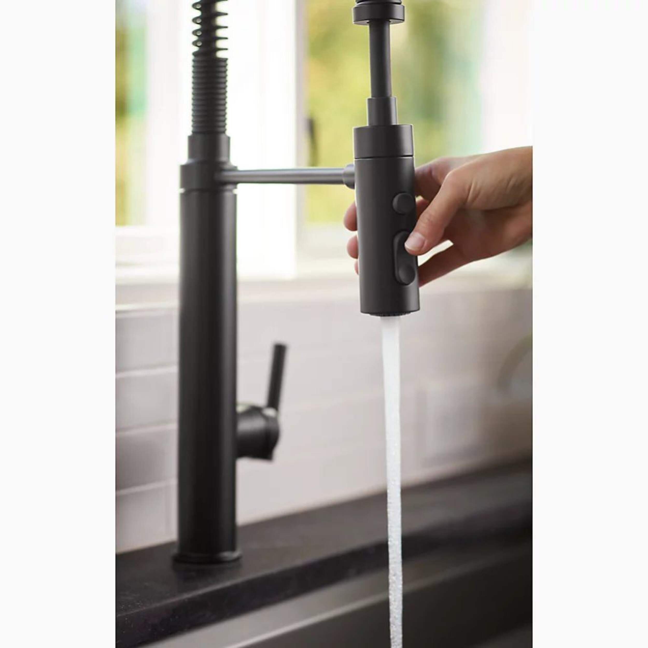Professional-style faucet with an easy-to-clean coated hose and removable coil