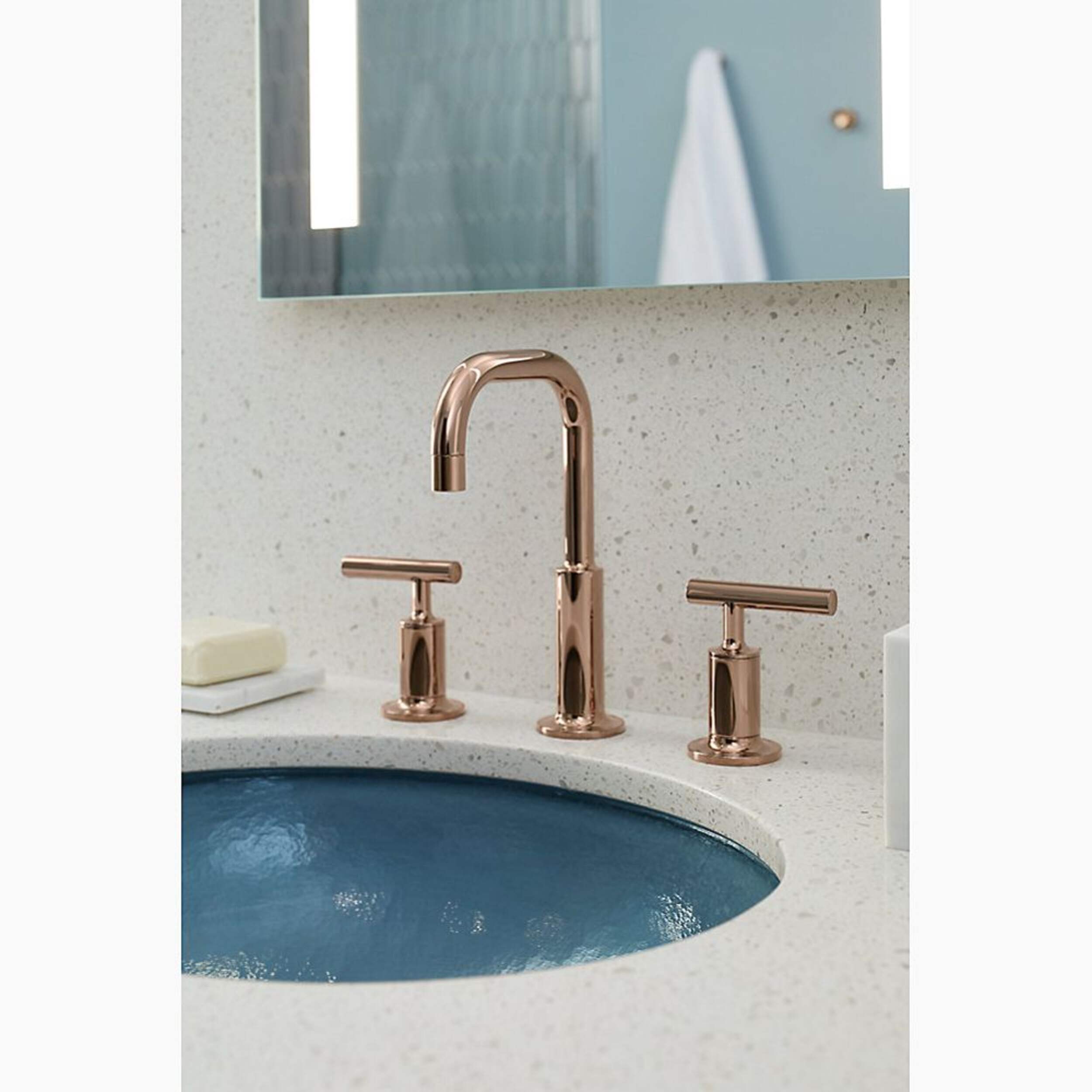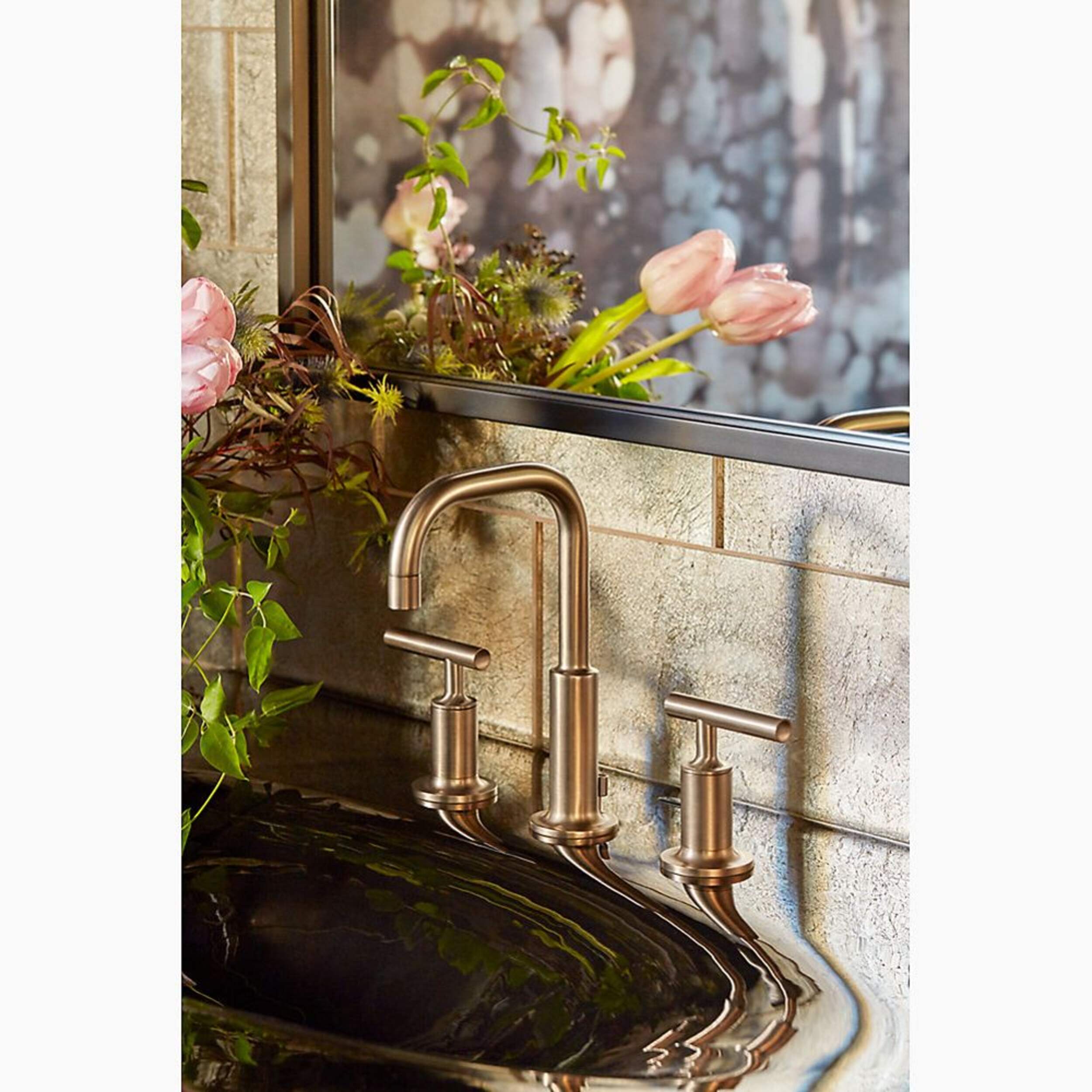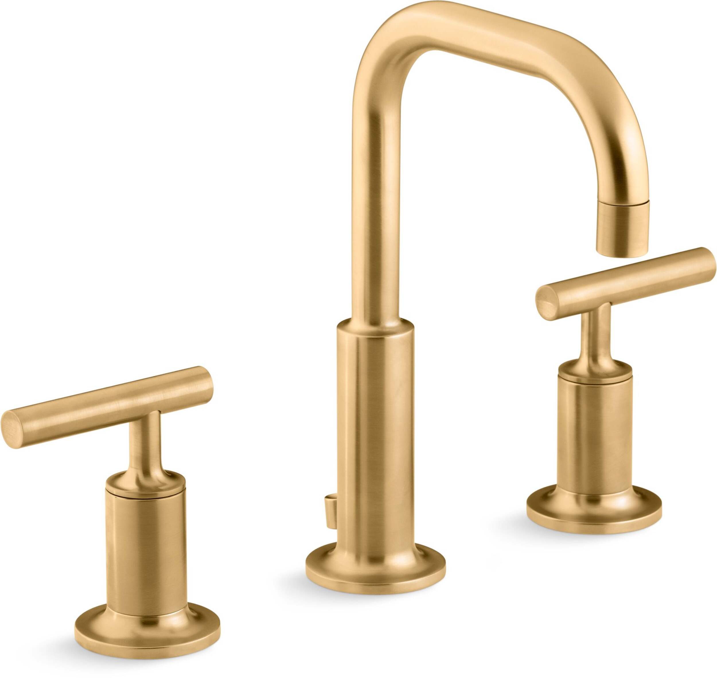 Combining architectural forms with sensual design lines, KOHLER® Purist faucets and accessories bring a touch of modern elegance to your bathroom. This widespread bathroom sink faucet exemplifies the Purist collection's understated style, with its low gooseneck spout and lever handles. Easy-to-install and leak-free UltraGlide® valves provide reliable performance and durability. And the spout features laminar flow, which helps conserve water while preventing splashing.