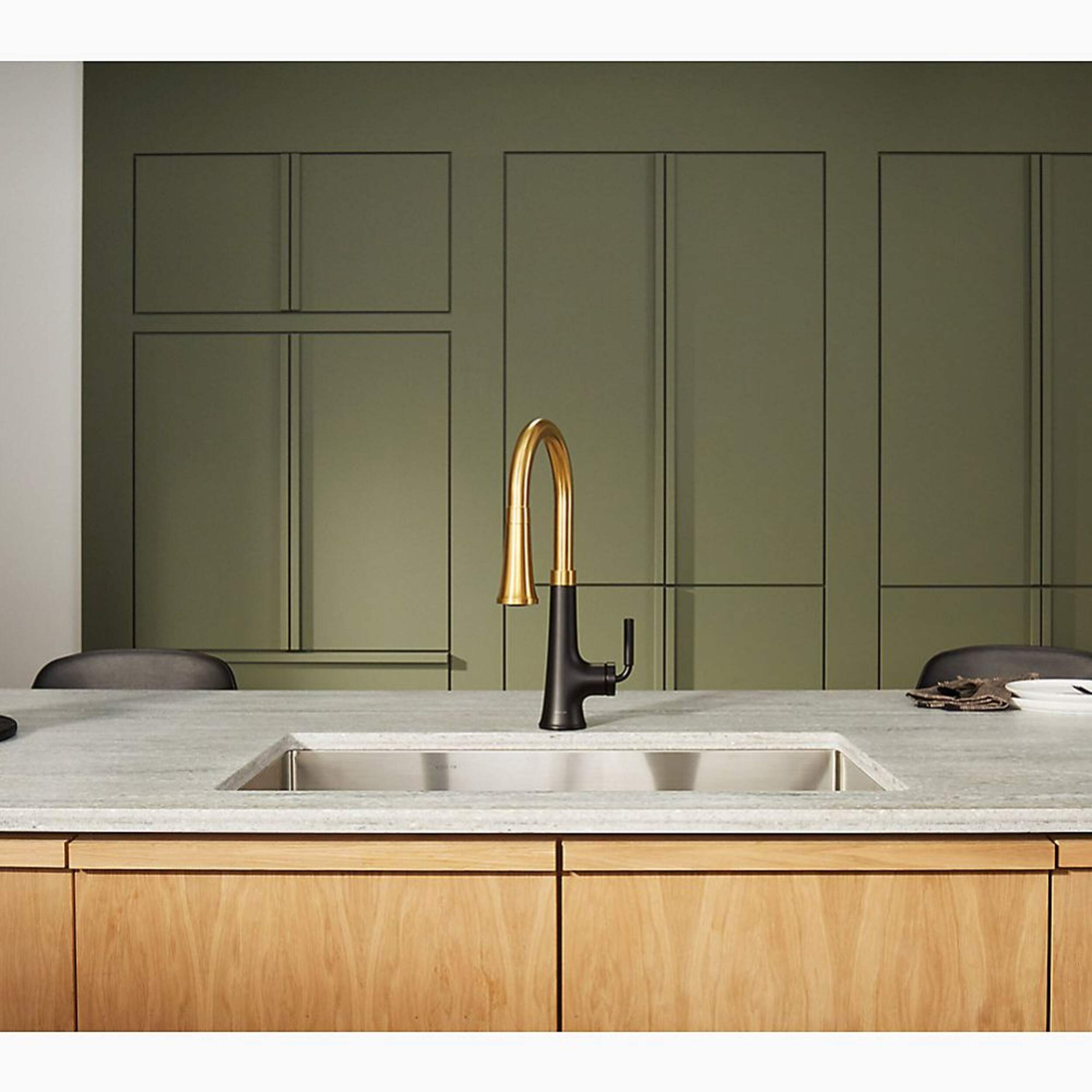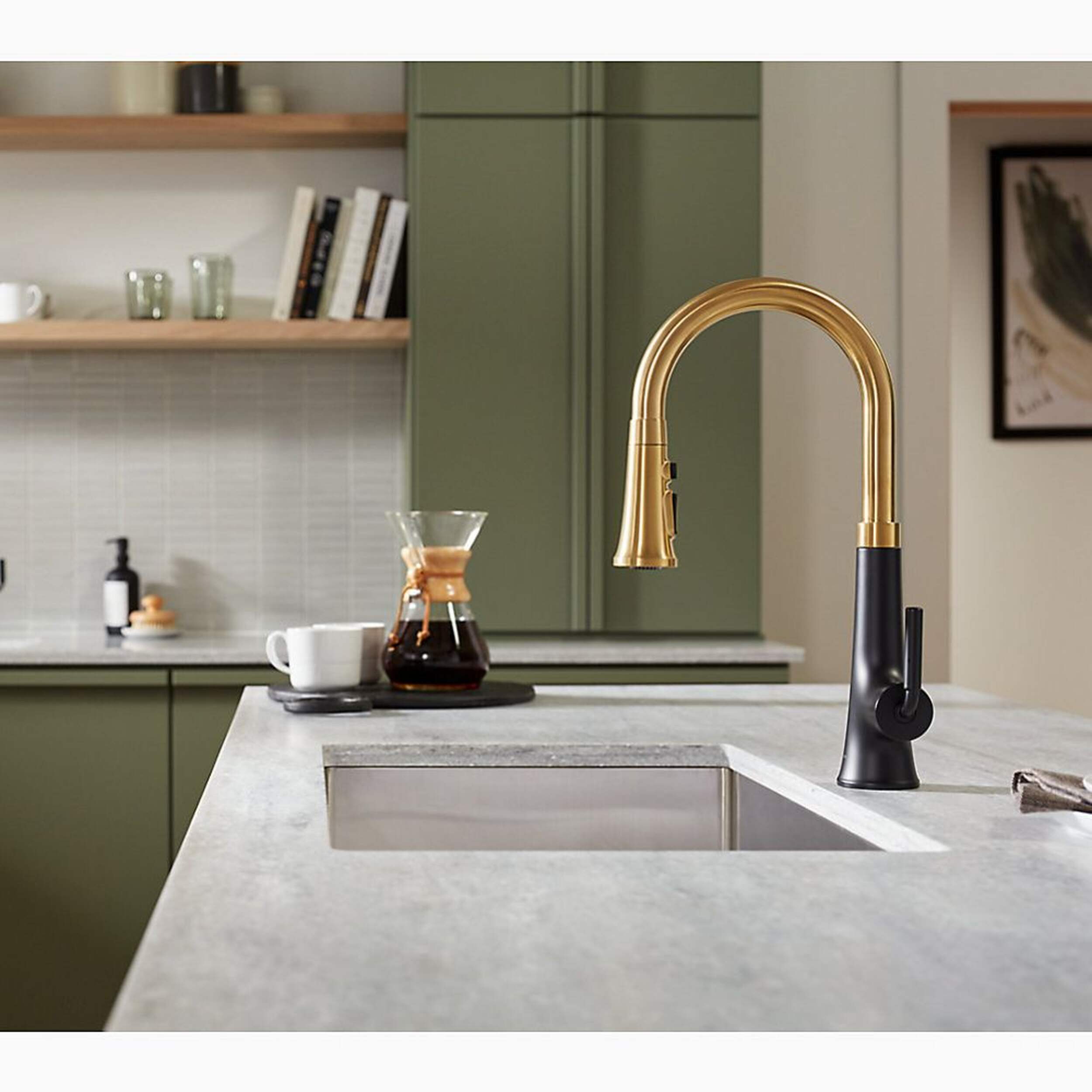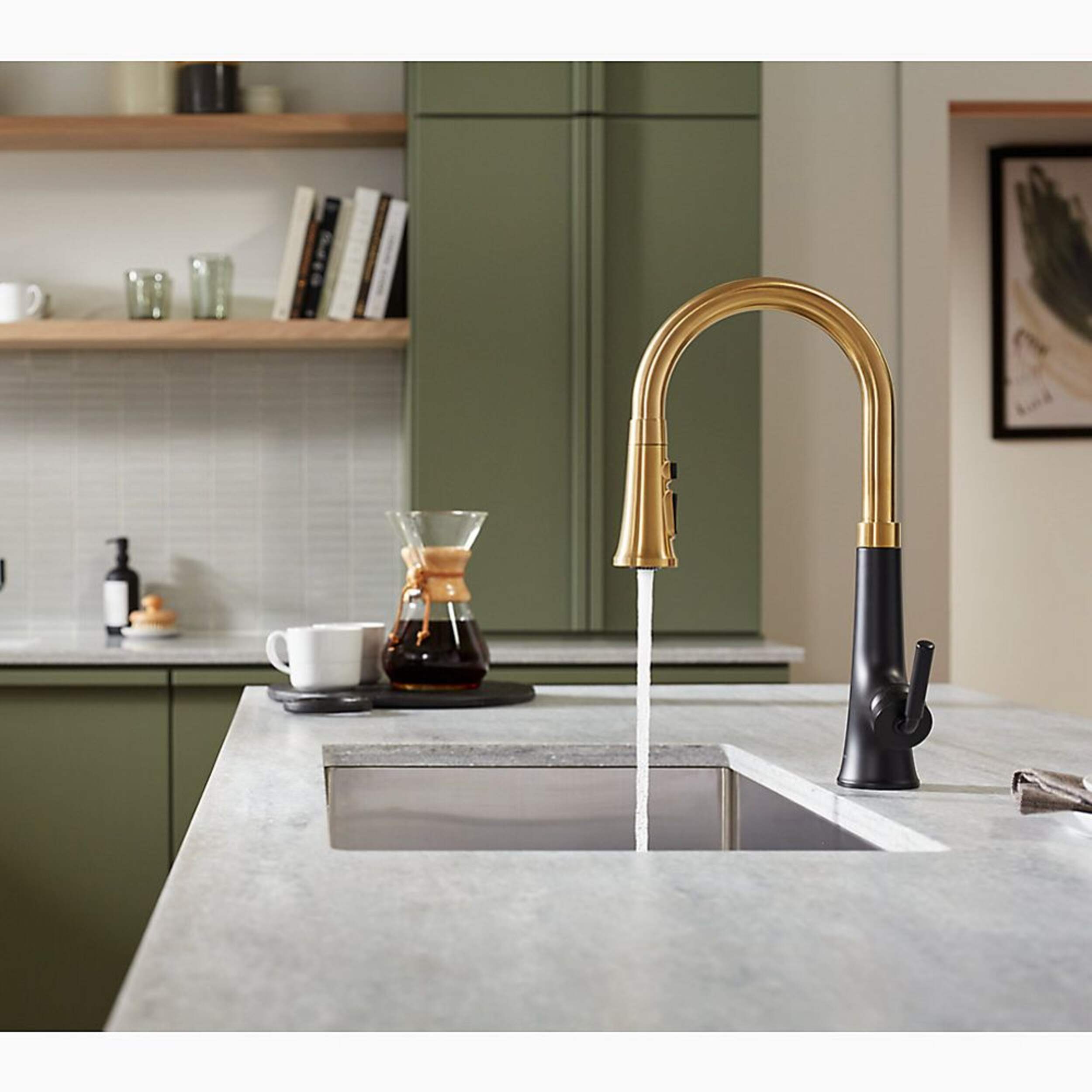 Kohler Tone Pull-Down Kitchen Faucet offers dynamic beauty with clean lines and a soft teardrop base