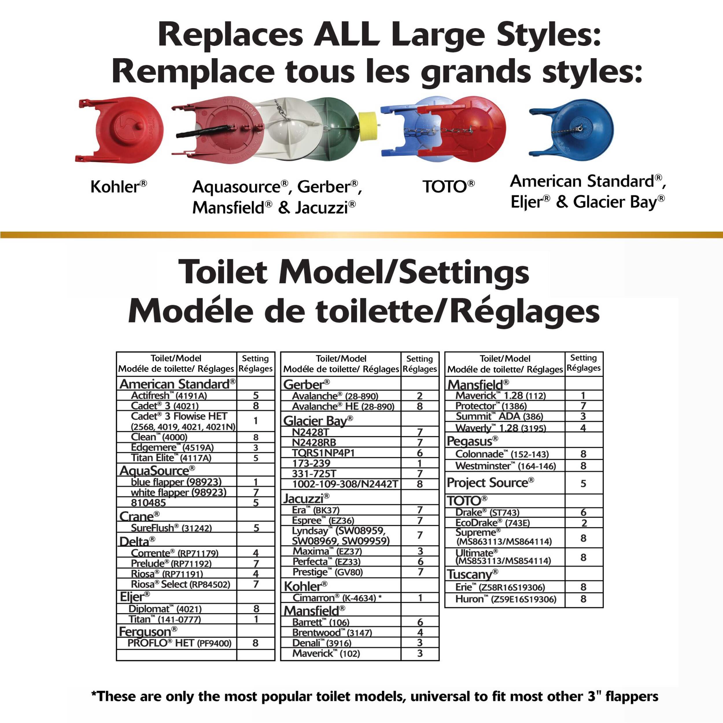Adjustable flapper has multiple settings to ensure it fits popular 3" (8 cm) toilet models