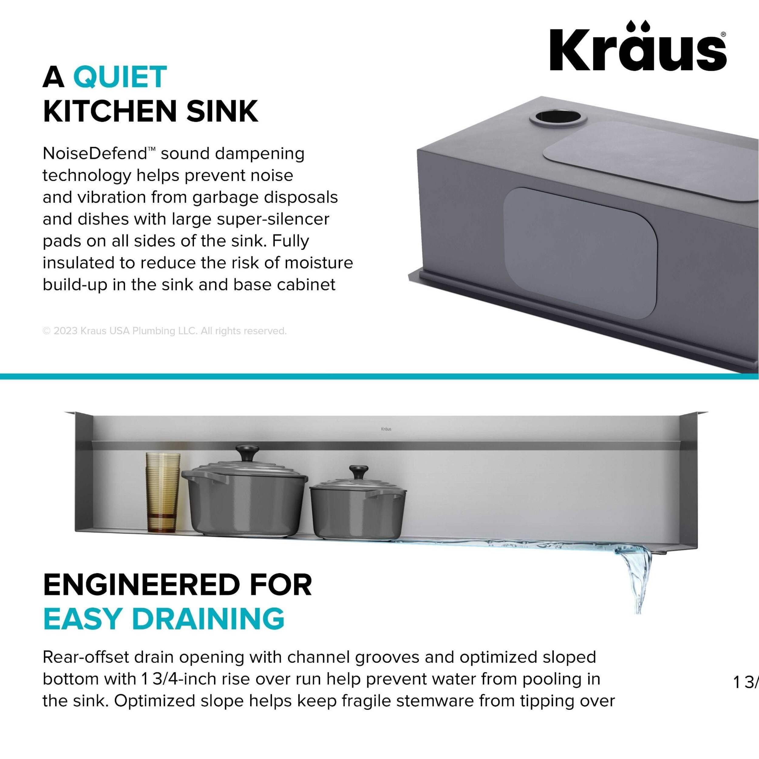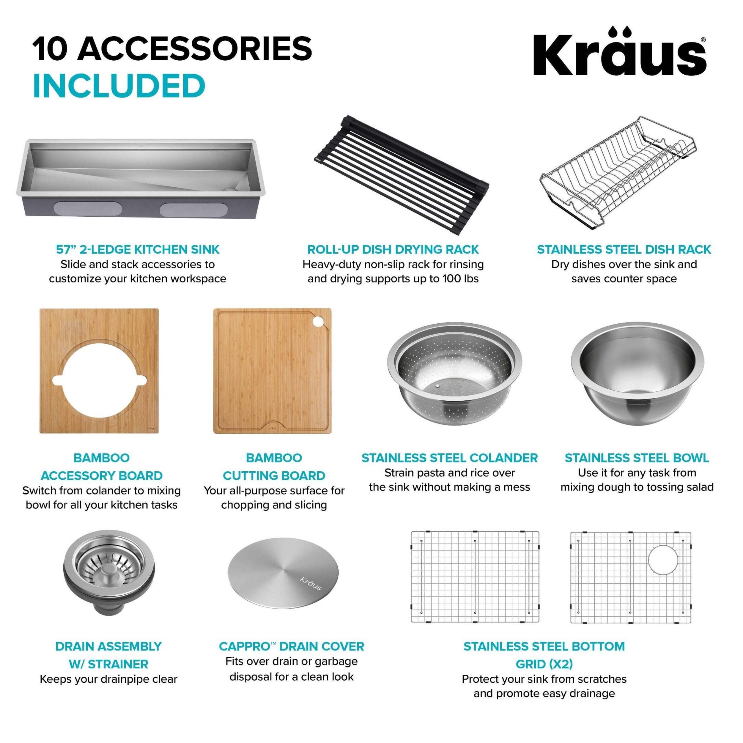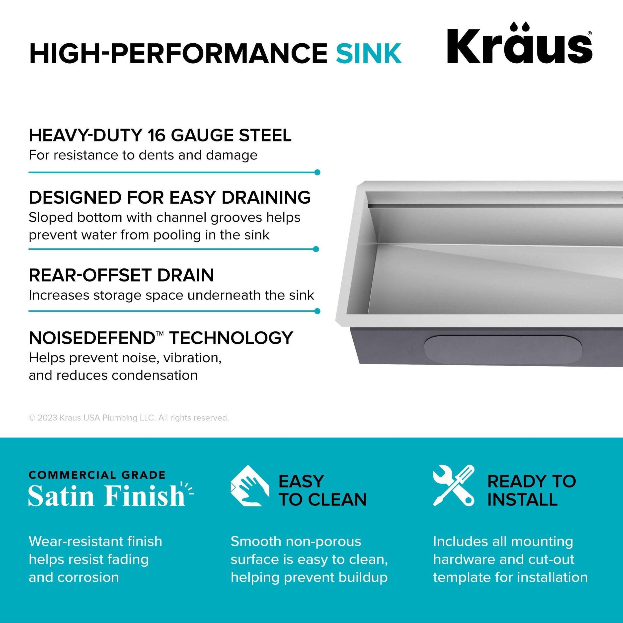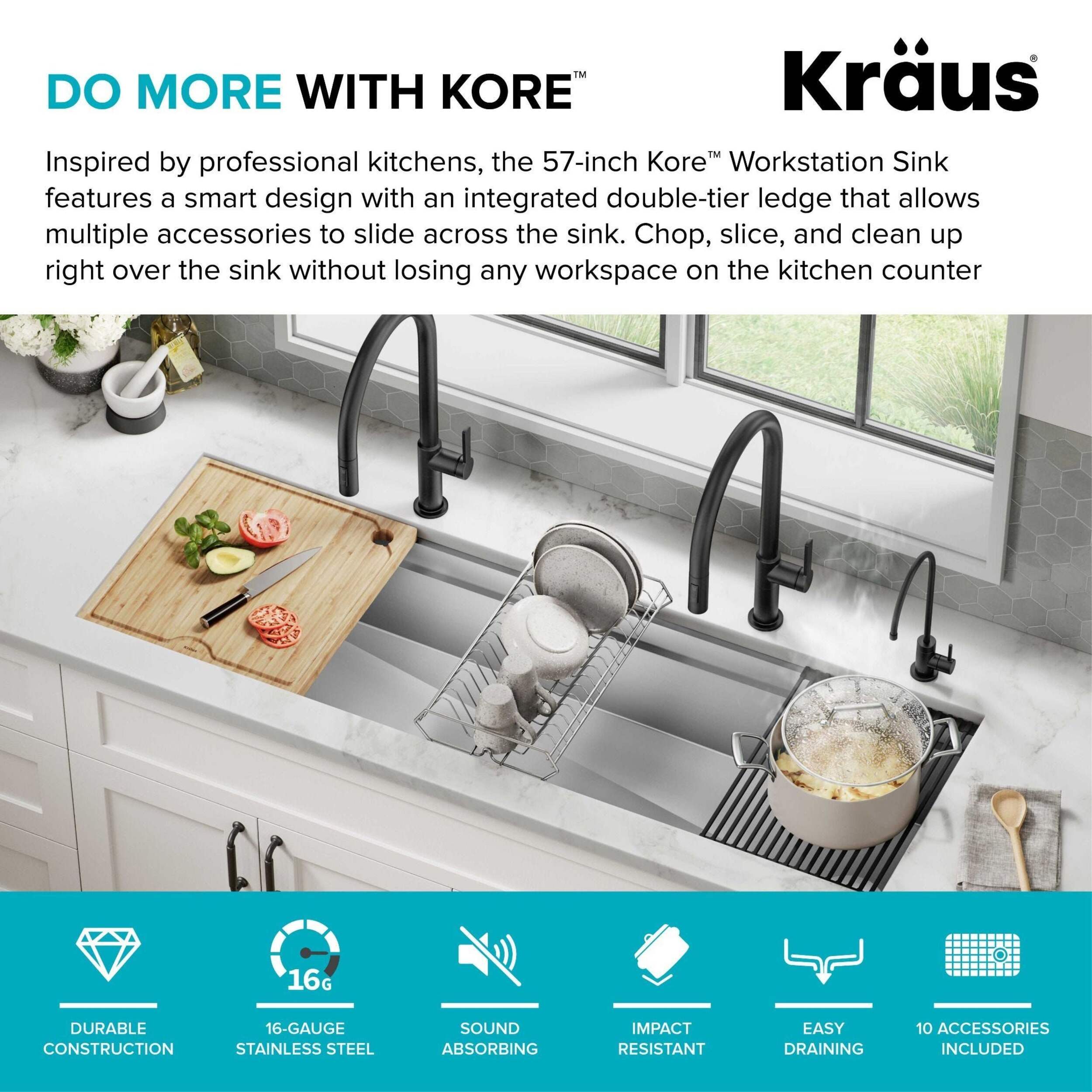 Cook, serve, and entertain in style with a Kraus Kore™ workstation sink. A 2-tier ledge system allows you to slide accessories across the kitchen sink on two levels, doubling your workspace while minimizing clutter on the kitchen counter. Stainless steel sink comes with 10 premium accessories including bamboo cutting board, serving board with bowl and colander, stainless steel dish rack, and roll-up drying rack that allow you to work right over the sink. This Kore™ stainless steel kitchen sink is made with heavy-duty TRU16™ gauge stainless steel for durability with resistance to corrosion, dents, and damage. Undermount sink installation creates a seamless transition from sink to countertop for a modern look and easy cleaning. The oversized single bowl sink offers an uninterrupted work surface with ample space for washing your largest baking sheets and cookware while also allowing multiple people to work side by side. Thick NoiseDefend™ sound dampening pads help reduce sink noise for a quieter kitchen.