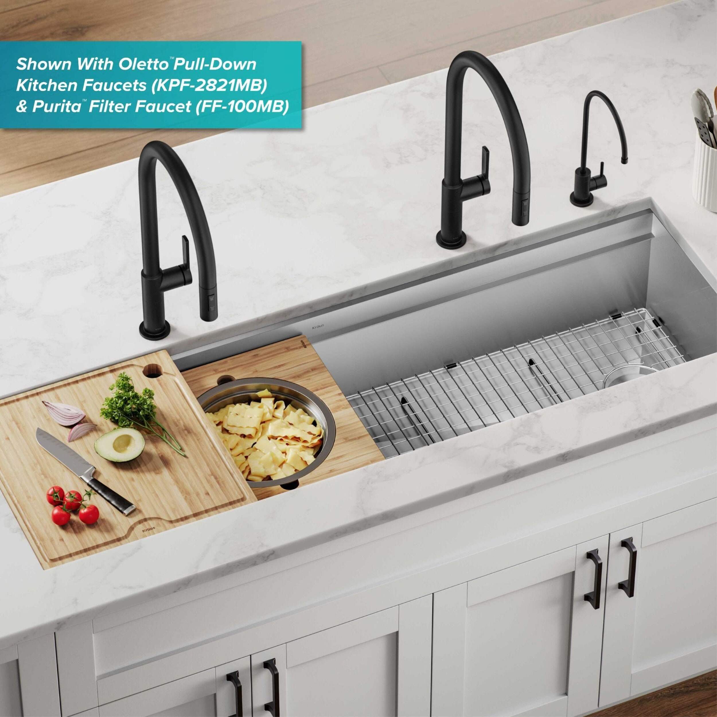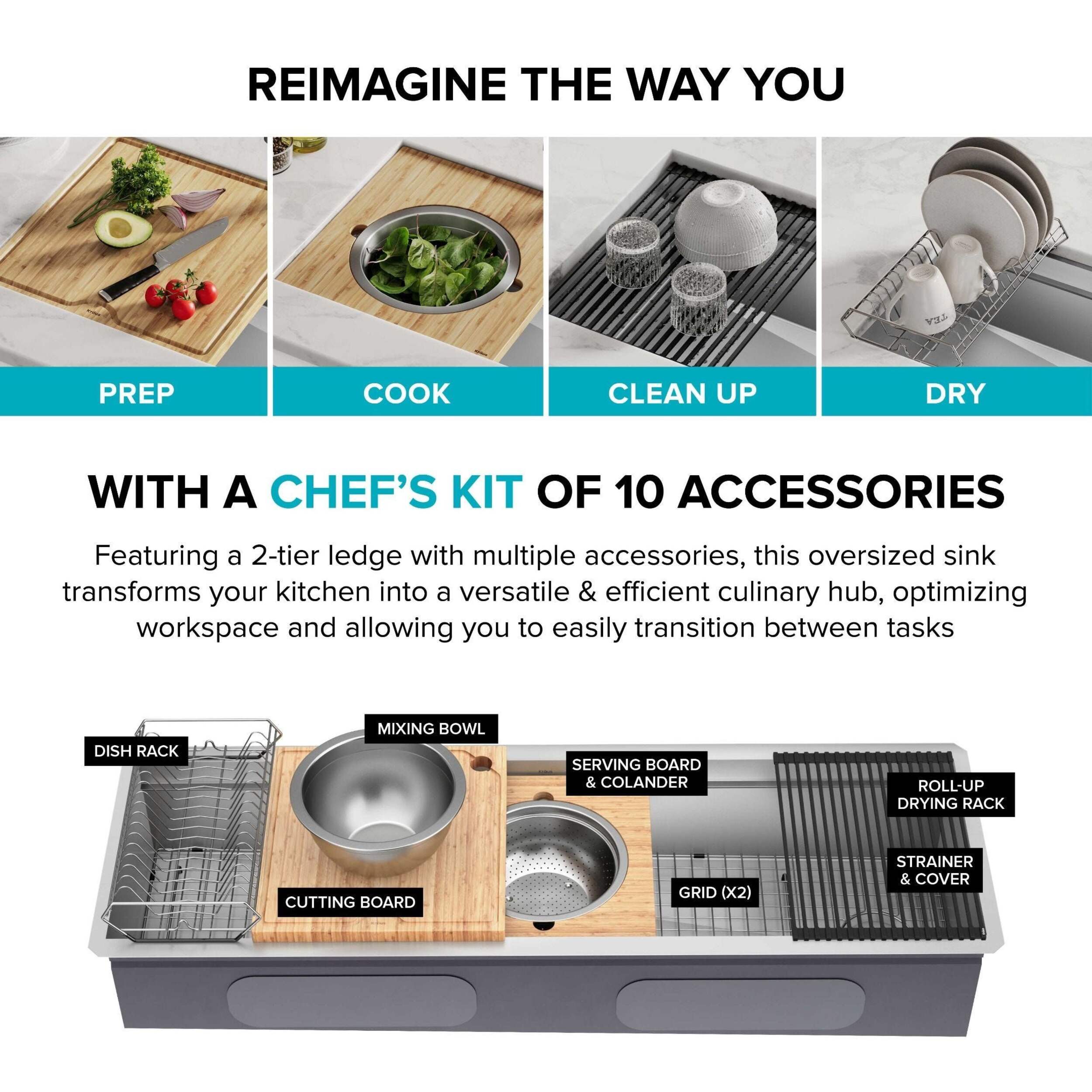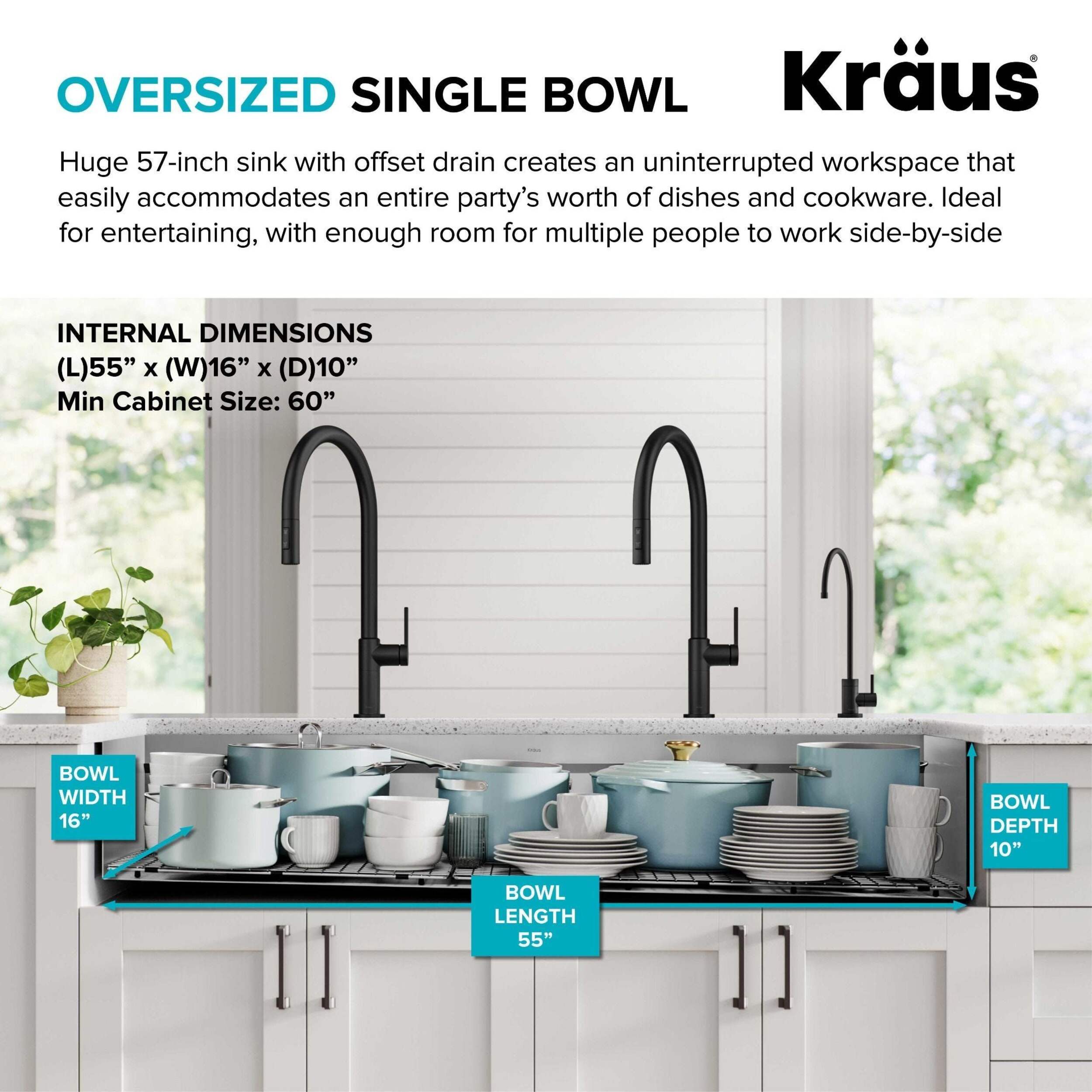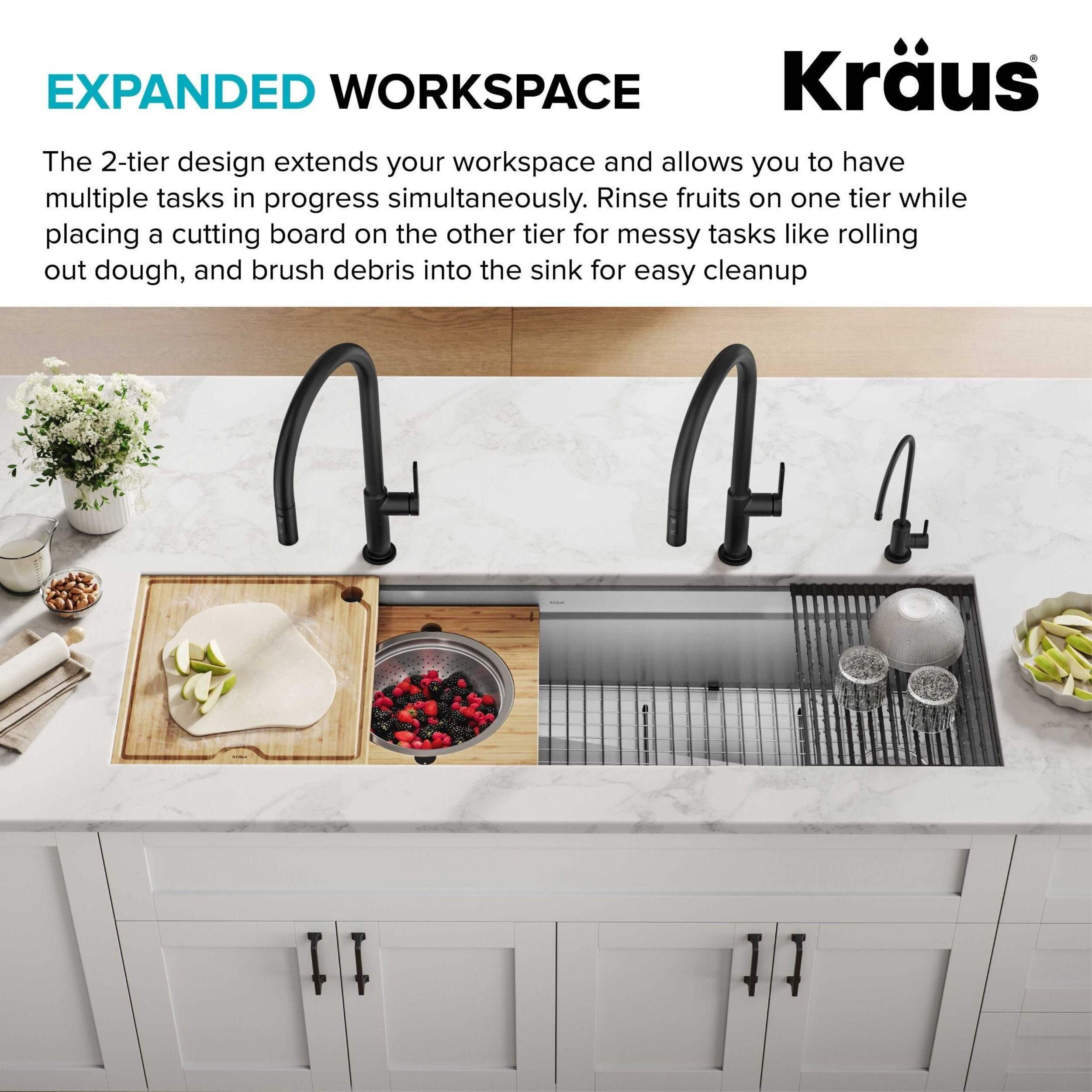 Cook, serve, and entertain in style with a Kraus Kore™ workstation sink. A 2-tier ledge system allows you to slide accessories across the kitchen sink on two levels, doubling your workspace while minimizing clutter on the kitchen counter. Stainless steel sink comes with 10 premium accessories including bamboo cutting board, serving board with bowl and colander, stainless steel dish rack, and roll-up drying rack that allow you to work right over the sink. This Kore™ stainless steel kitchen sink is made with heavy-duty TRU16™ gauge stainless steel for durability with resistance to corrosion, dents, and damage. Undermount sink installation creates a seamless transition from sink to countertop for a modern look and easy cleaning. The oversized single bowl sink offers an uninterrupted work surface with ample space for washing your largest baking sheets and cookware while also allowing multiple people to work side by side. Thick NoiseDefend™ sound dampening pads help reduce sink noise for a quieter kitchen.