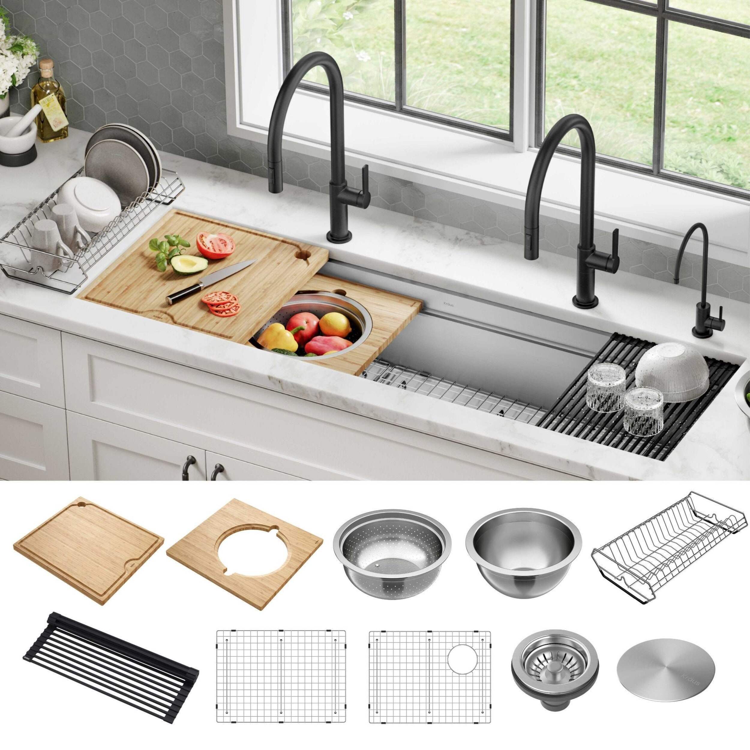 Workstation sink includes 11 accessories: heavy-duty cutting board, roll-up drying rack, serving board with bowl and colander, stainless steel dish rack, 2 bottom grids, drain assembly with decorative cover, mounting hardware, and cutout template