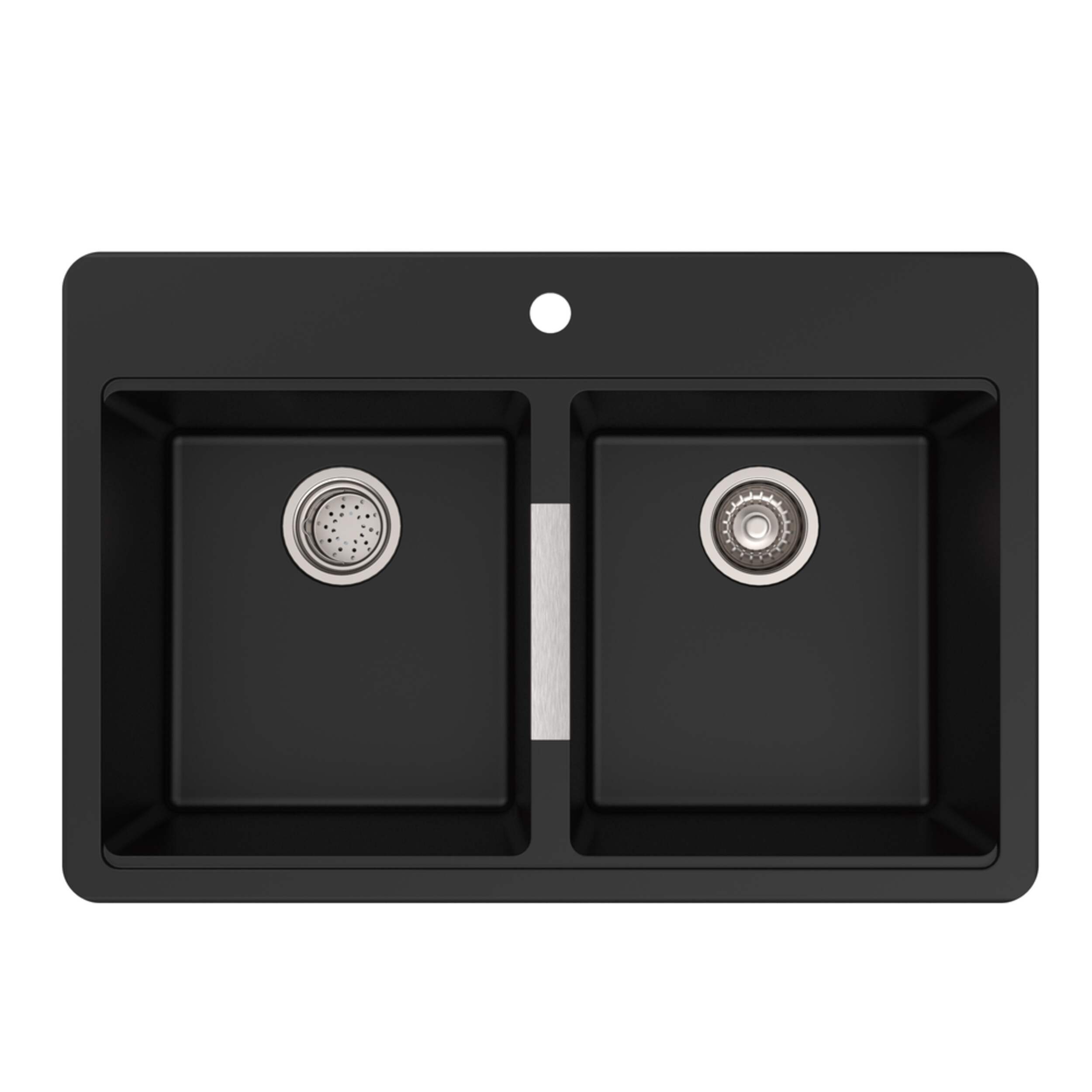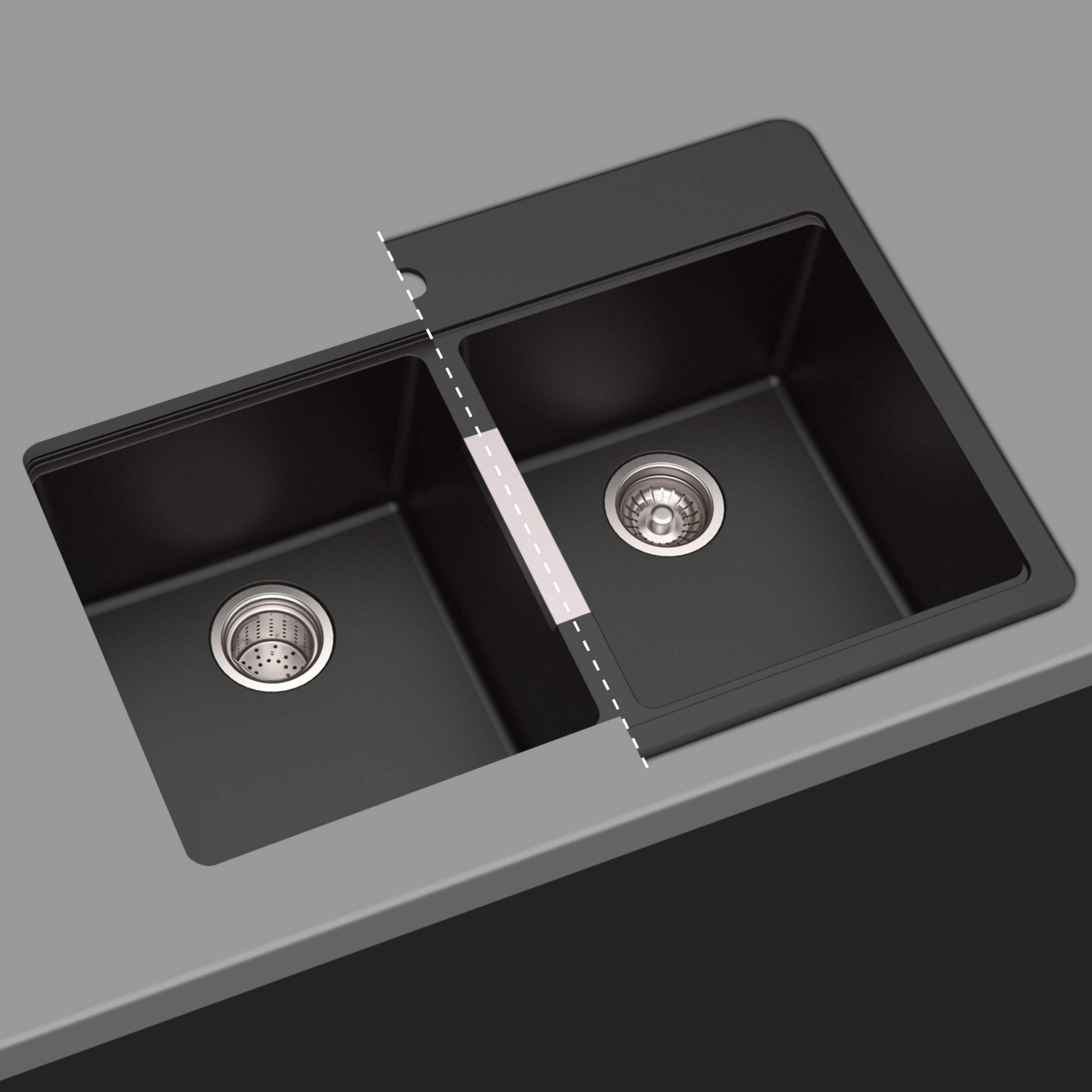 Kraus dual mount granite sinks create an instant style upgrade for the kitchen. Constructed from 80% natural granite, with the look and feel of real stone, these modern kitchen sinks look striking in a variety of settings. Clean lines and thoughtful design details highlight the organic elegance of granite, for an eye-catching look with contemporary appeal. The extra-deep basins accommodate large dishes with ease, while the gently rounded corners make sink maintenance simple. Each non-porous sink is protected with a thermal finishing process, creating a surface that is highly resistant to heat, chemicals, scratching, chipping, and discoloration. This double bowl sink provides a lifetime of functionality with versatile style. The 50/50 split basin adds flexibility for a variety of kitchen tasks. The basin is self rimming, creating a finished look for your kitchen. Choose from easy topmount installation, or install the sink as an undermount for a seamless look. For added convenience, a basket strainer drain assembly and complimentary towel are included free with purchase. Constructed from premium stainless steel, the top-quality basket strainer assembly creates a tight seal to prevent food and debris from clogging the drainpipe. For easy installation, all mounting hardware is provided. Experience Kraus Quality and bring your best kitchen ideas to life.