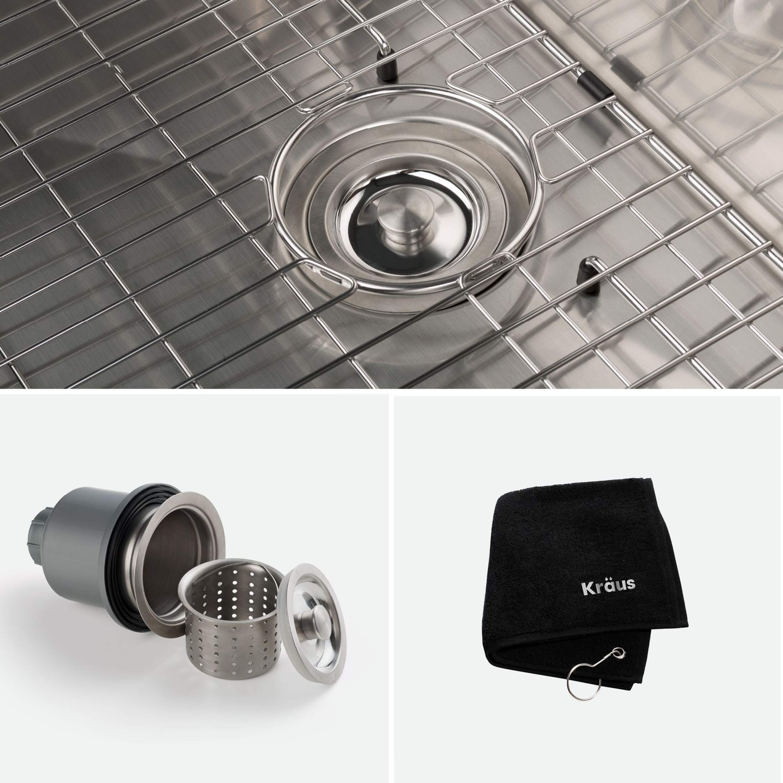 Includes protective bottom grid, premium 3-piece basket strainer set, kitchen towel
