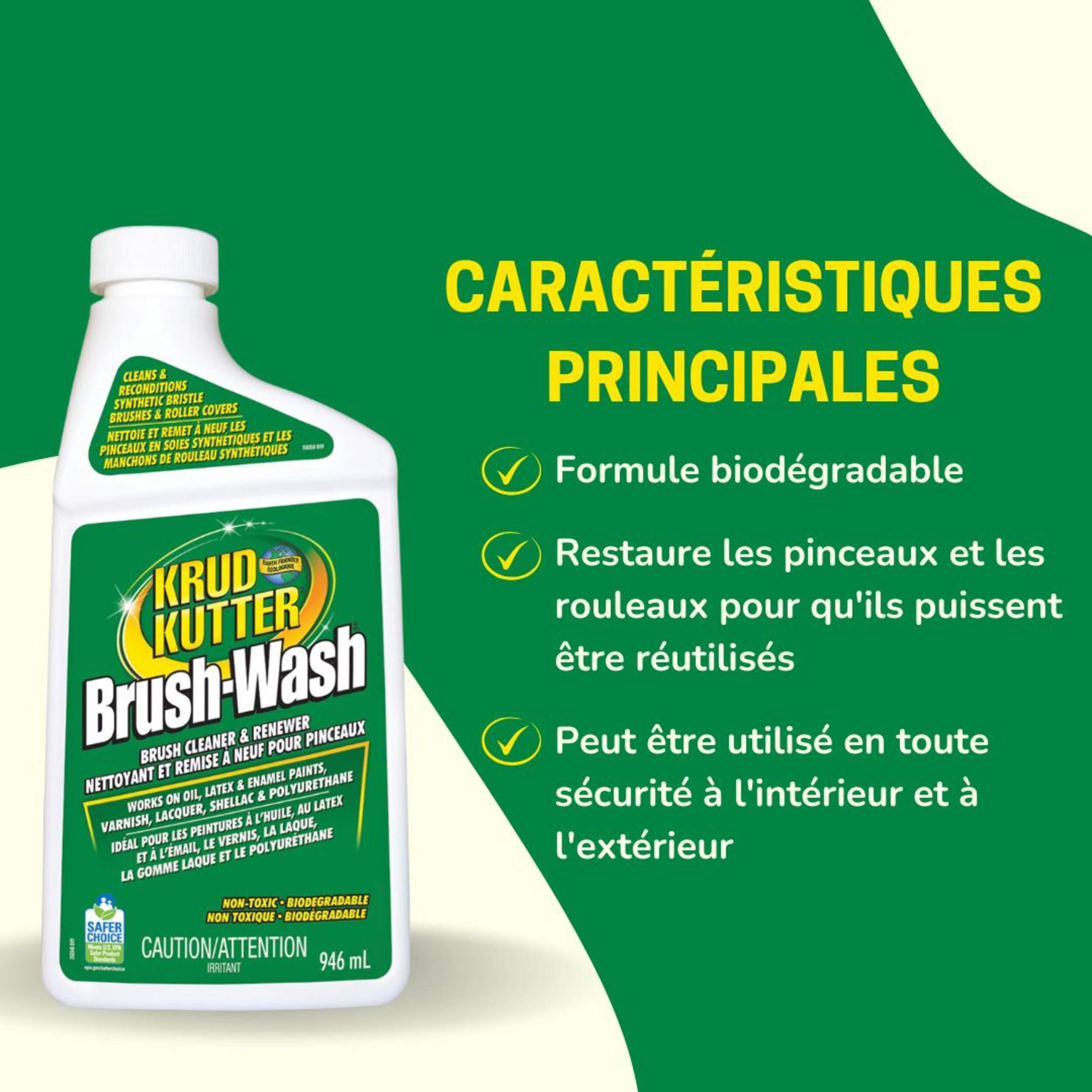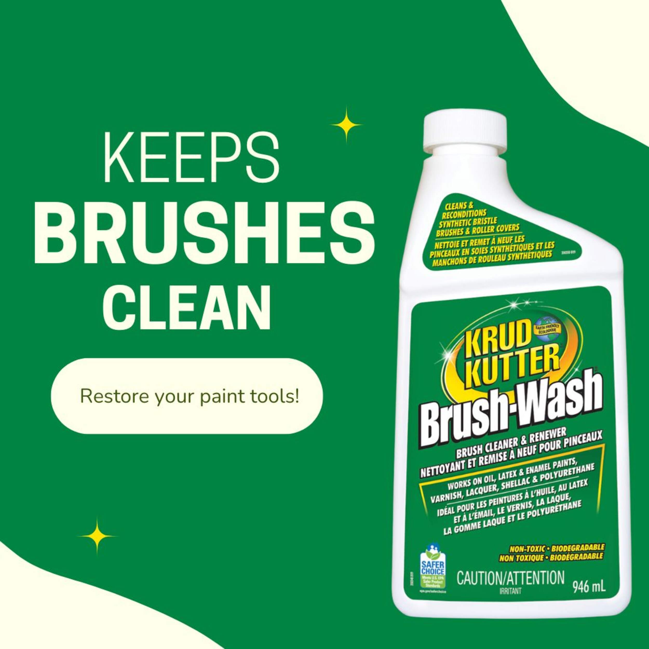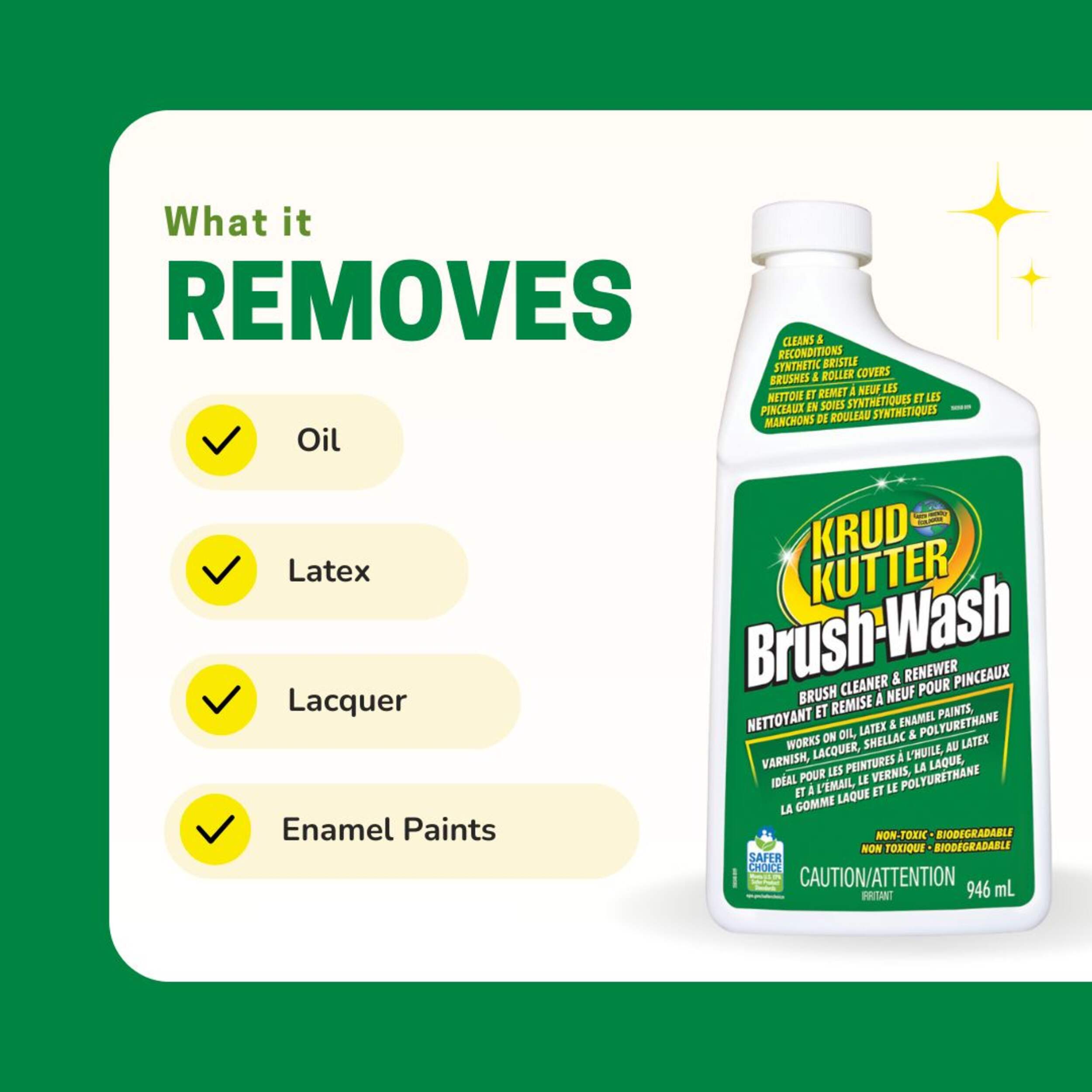 Krud Kutter Brush-Wash Cleaner & Renewer removes dried paint from most types of paint applicators. Specially formulated to clean and recondition synthetic bristle brushes and roller covers. This biodegradable, water-based formula is safe, fast and effective on oil, latex and enamel paints, varnish, lacquer, shellac, and polyurethane.