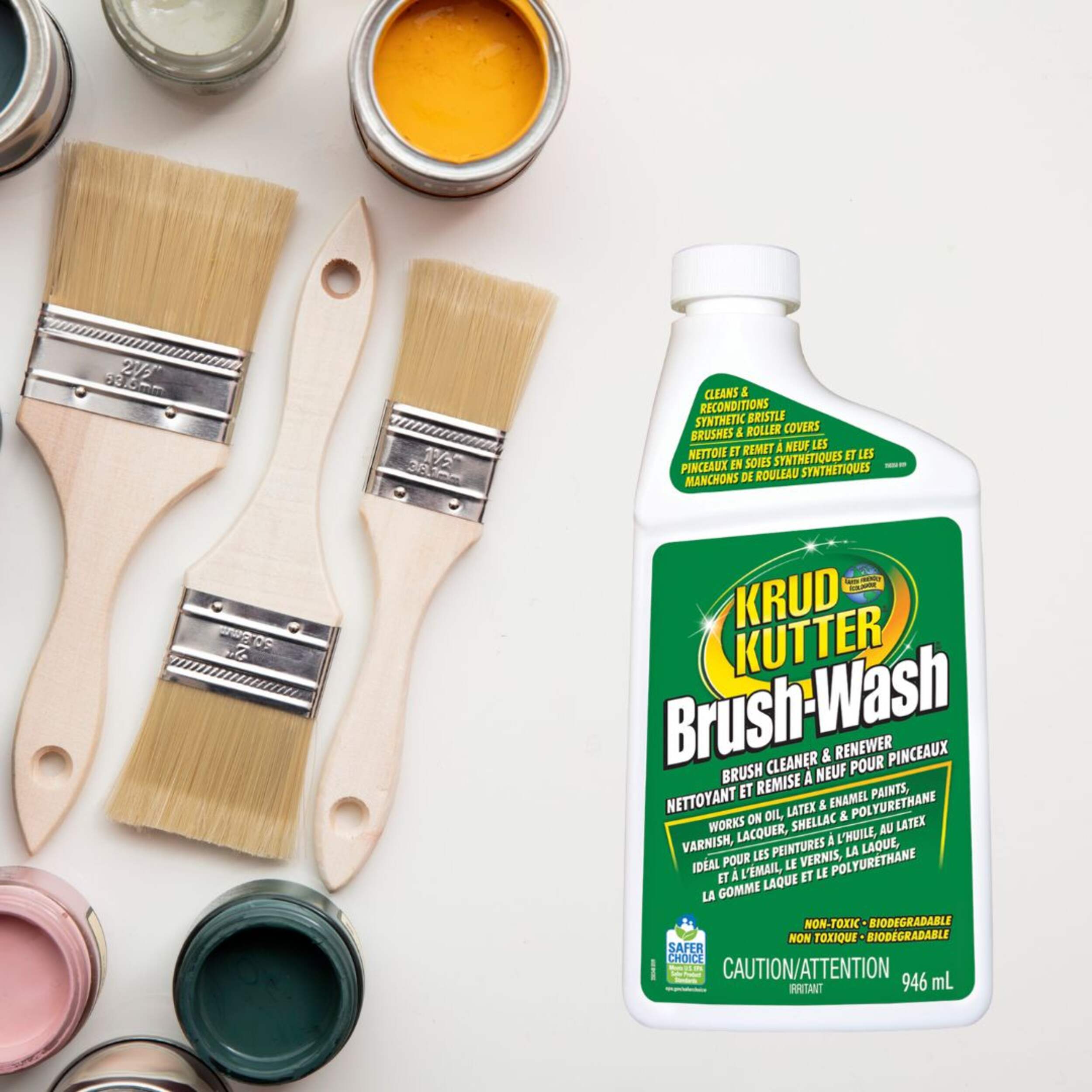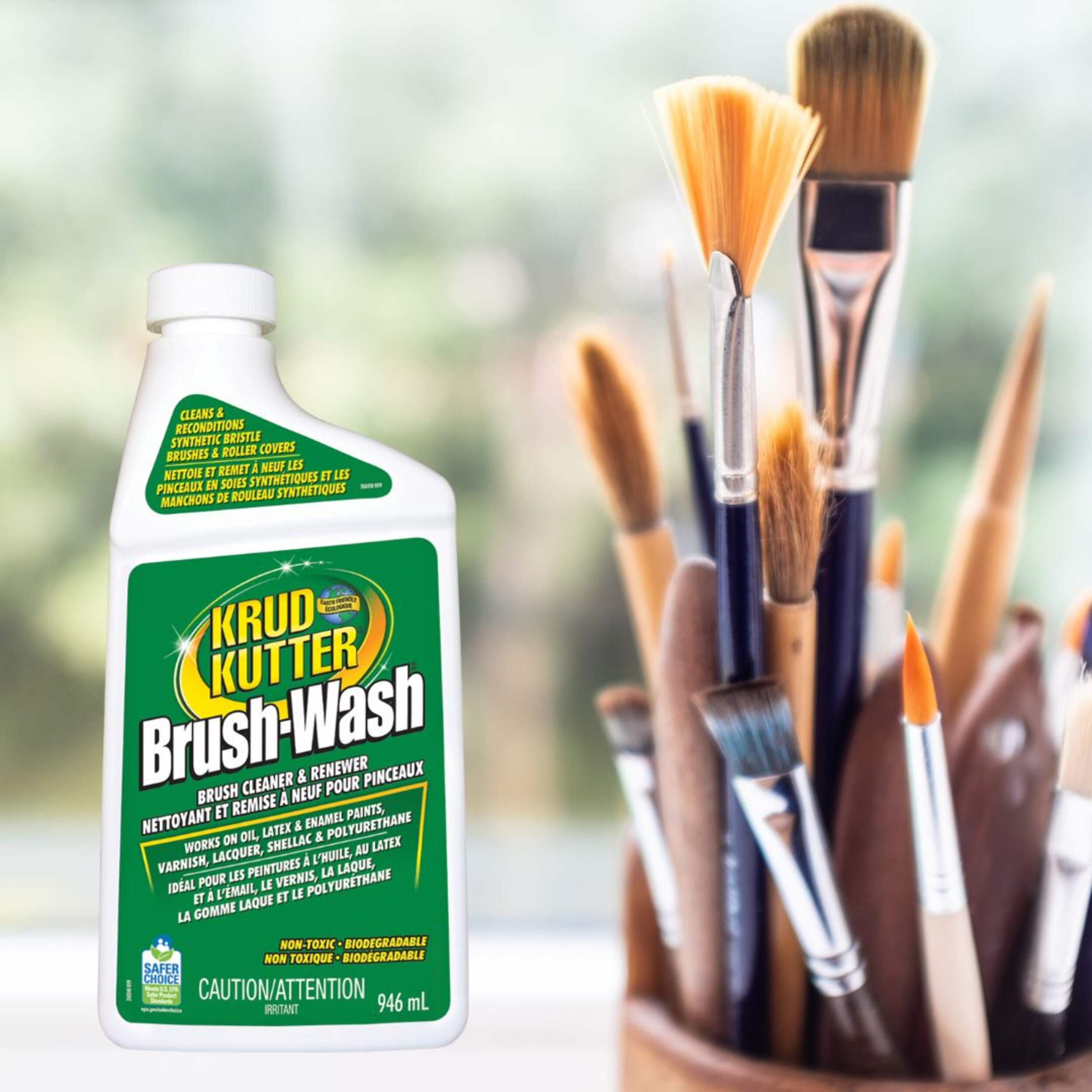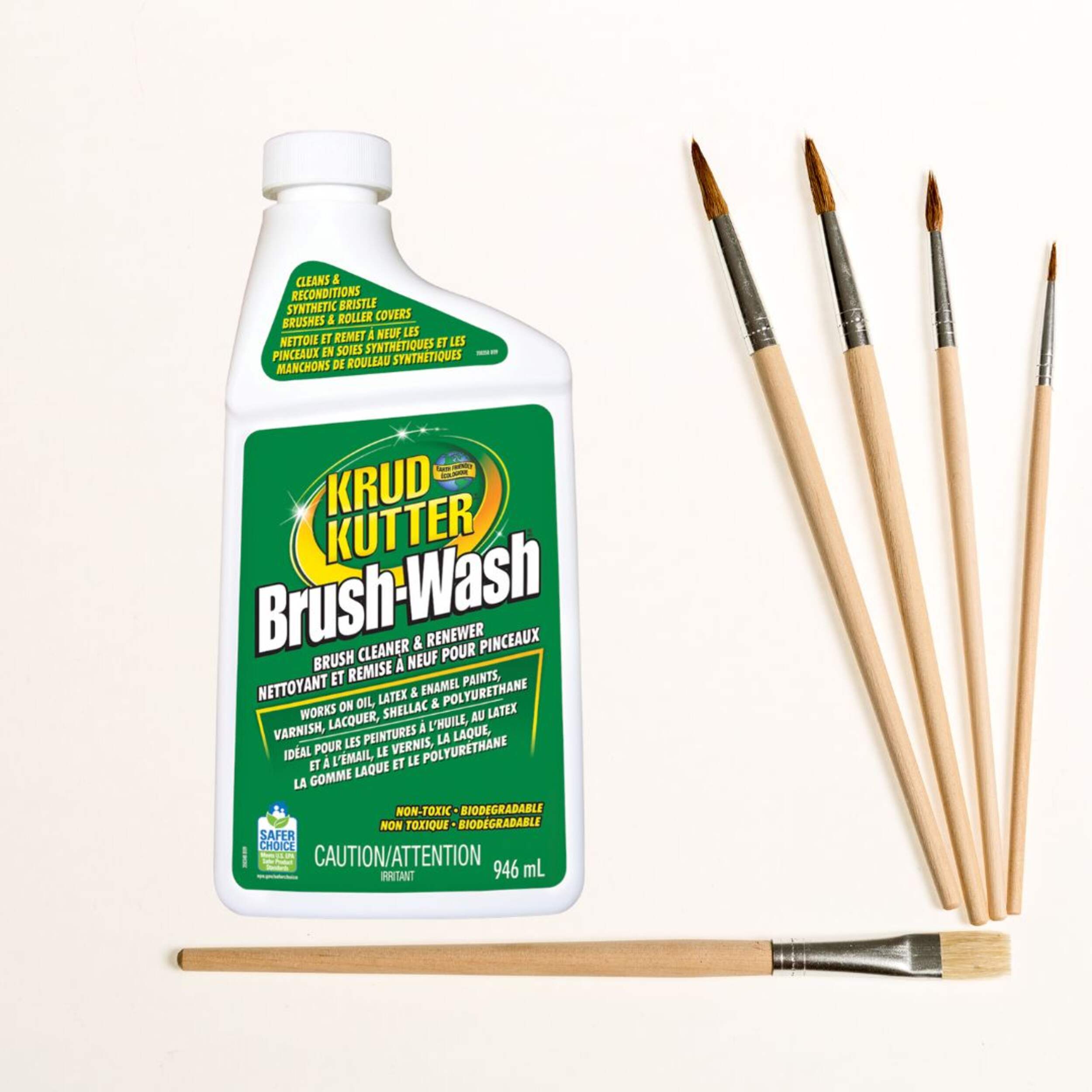 Krud Kutter Brush-Wash Cleaner & Renewer cleans and reconditions synthetic bristle brushes and roller covers