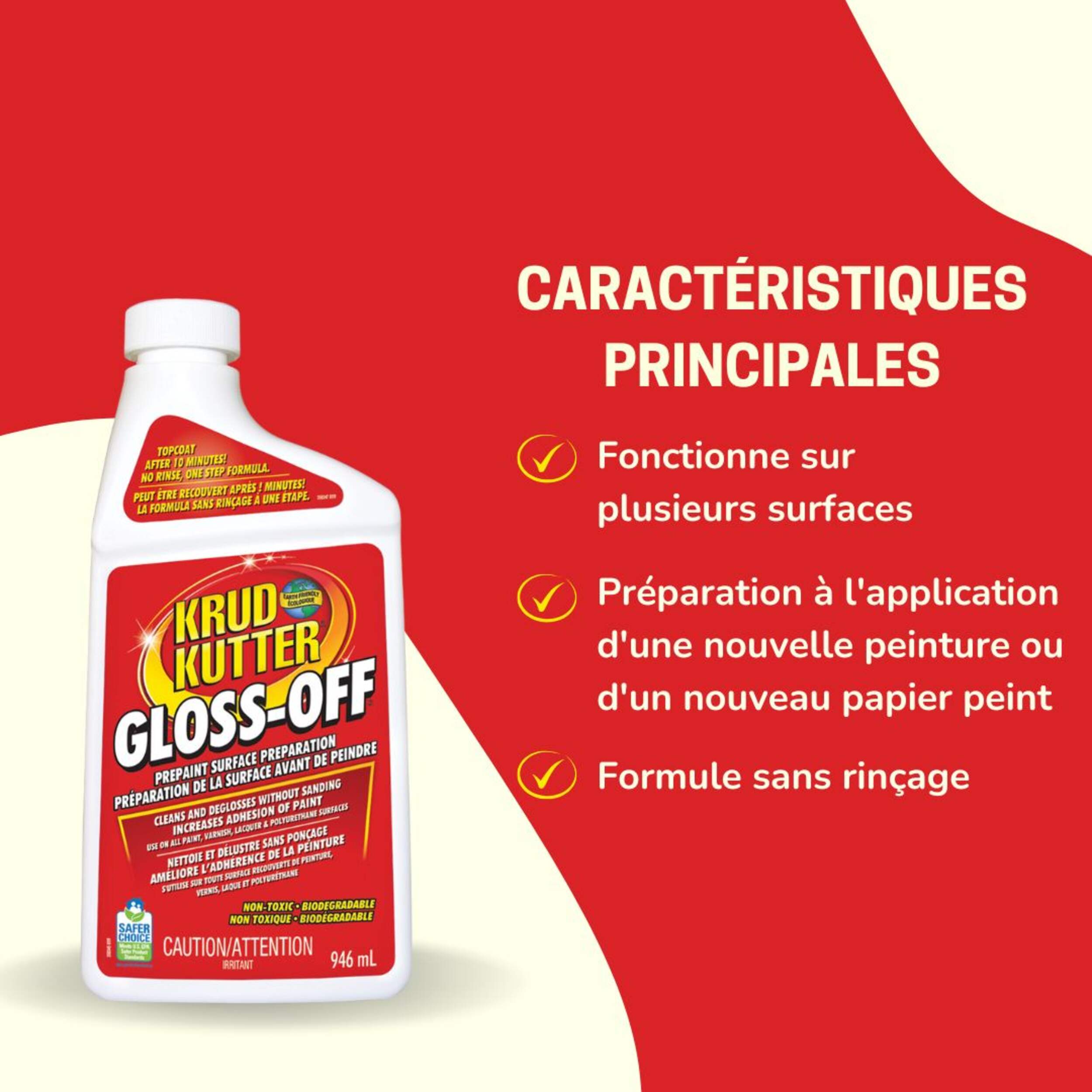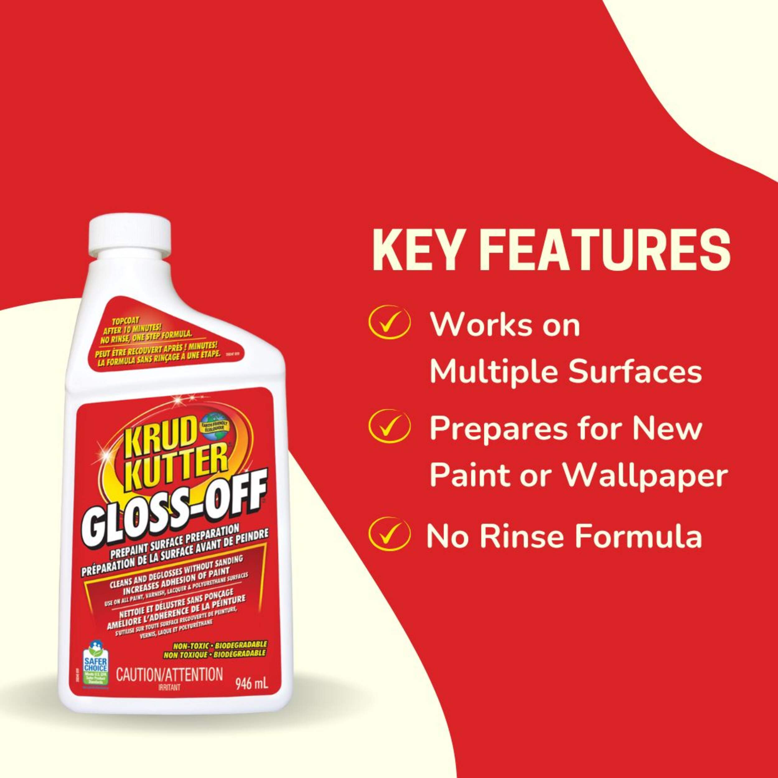 Krud Kutter Gloss-Off Prepaint Surface Preparation is a no rinse formula that's specially designed to prepare high gloss and other hard-to-stick-to surfaces for repainting or refinishing. Specially formulated to help new paint and varnish bond to old finishes, or as a wall preparation prior to wallpapering. It removes dirt, grease, grime, smoke, mildew, food stains, heel marks, crayon, old wallpaper paste, and wax from painted or unpainted wood, metal, or vinyl wallpaper.