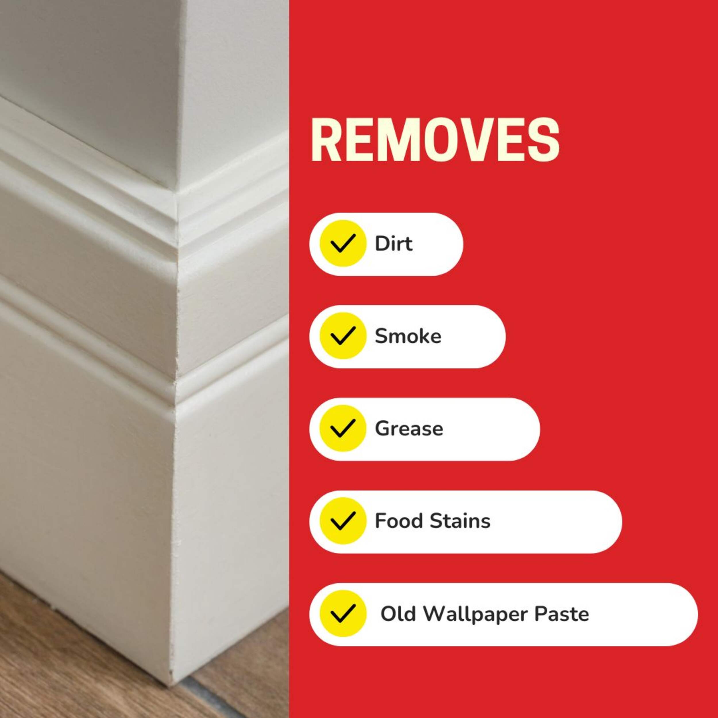 Removes dirt, grease, grime, smoke, mildew, food stains, heel marks, crayon, old wallpaper paste, and wax from painted or unpainted wood, metal, or vinyl wallpaper