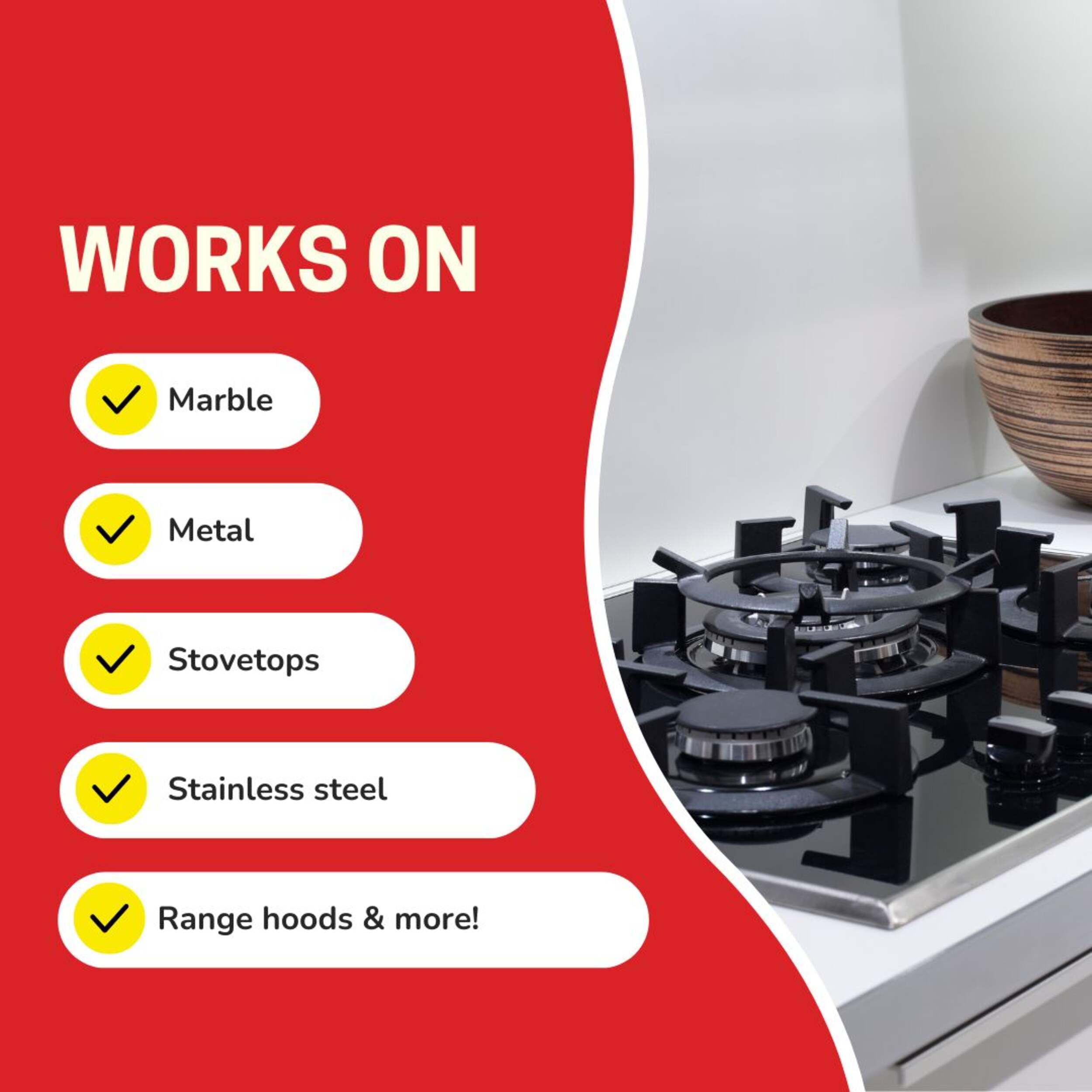 For use on stainless steel, cooktops, aluminum, range hoods, sealed stone, countertops, marble, metal, granite or fibreglass