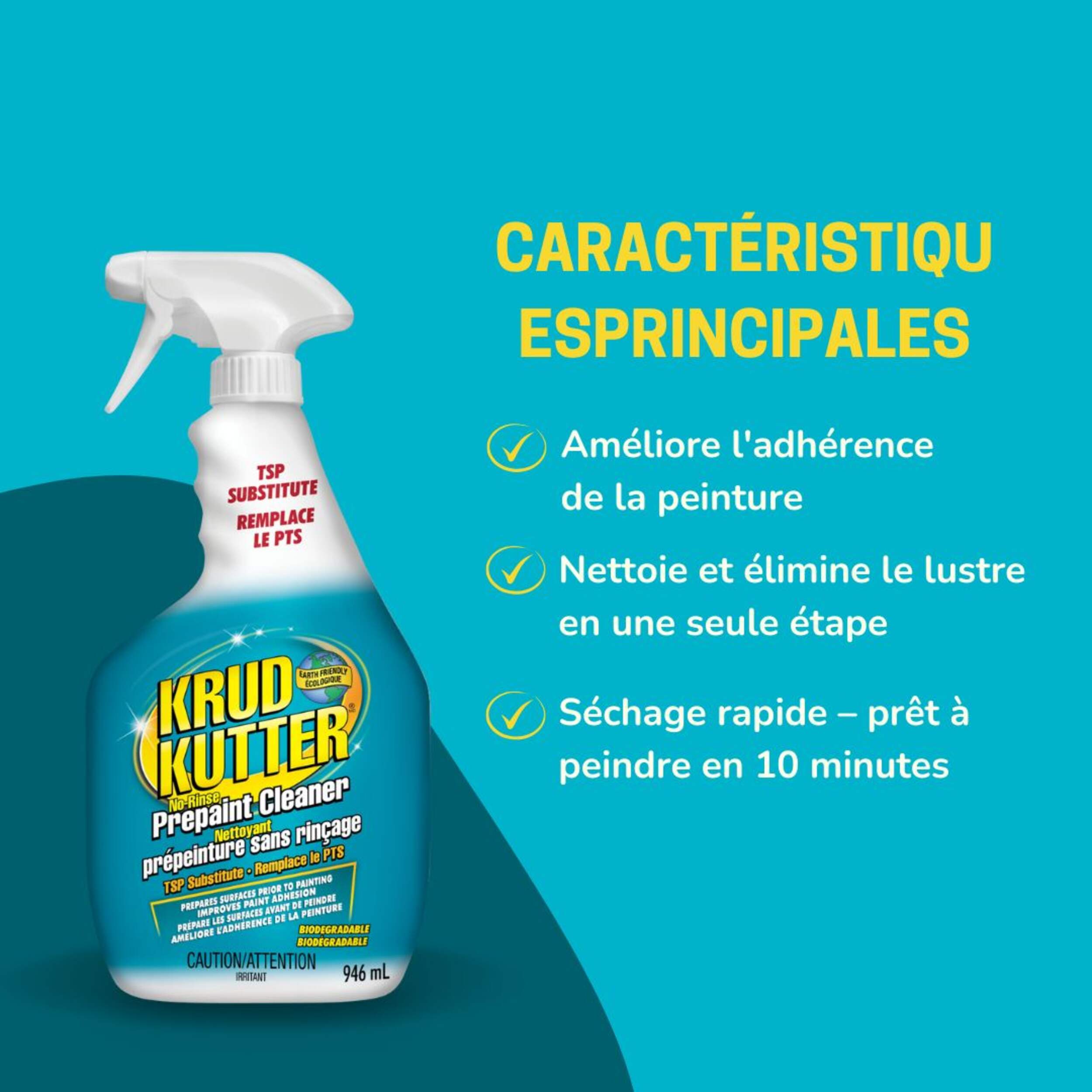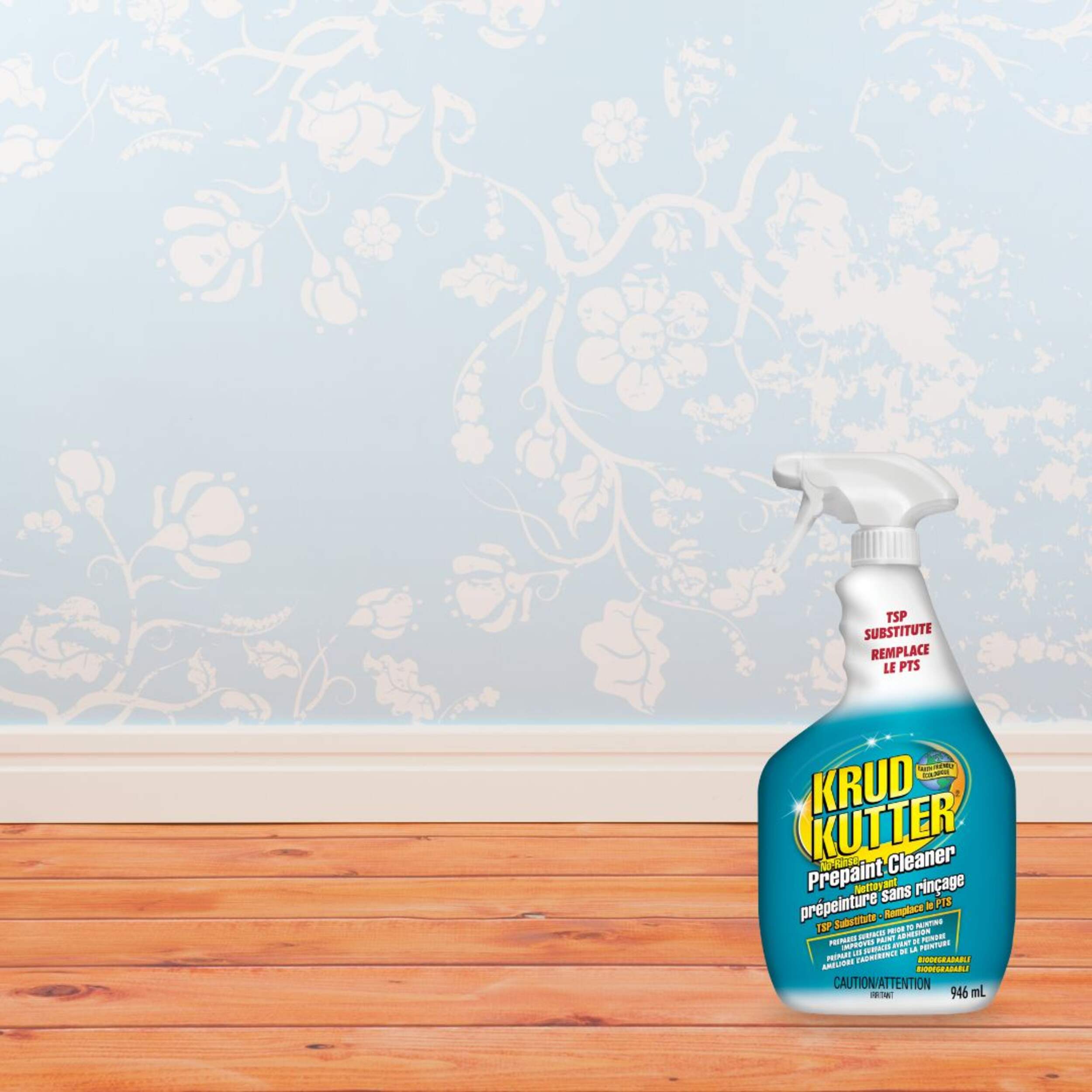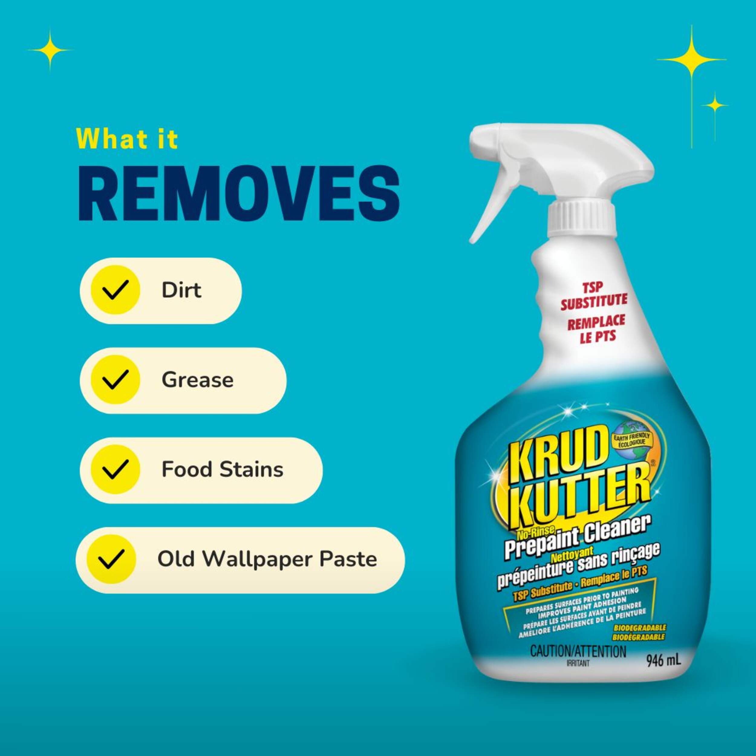 Krud Kutter No-Rinse Prepaint Cleaner TSP Substitute cleans and deglosses surface so paint adheres better. Use on all paints, varnish, lacquer, and polyurethane, or as a wall preparation prior to wallpapering. Removes dirt, grease, grime, smoke, mildew, food stains, heel marks, crayon, old wallpaper paste, and wax from painted or unpainted wood, metal, or vinyl wallpaper.