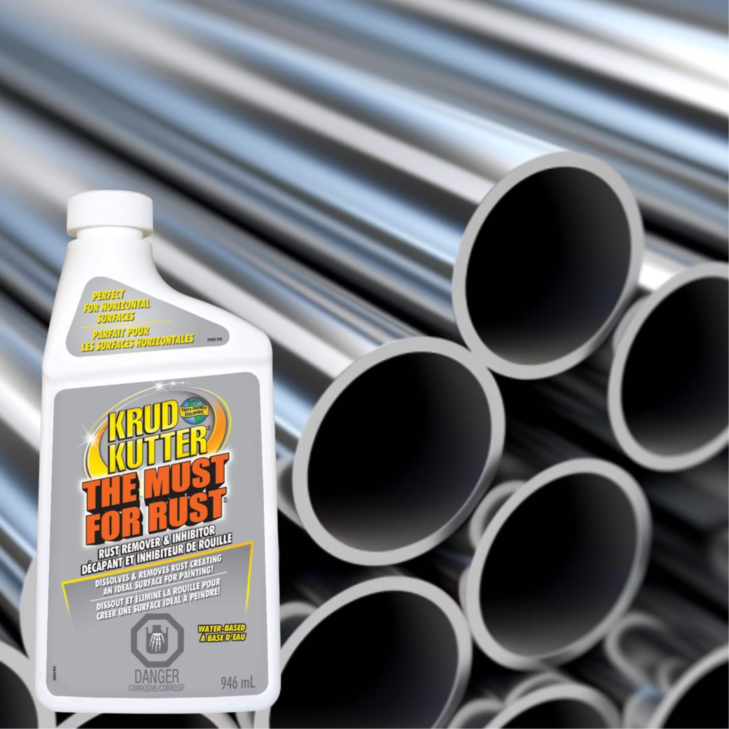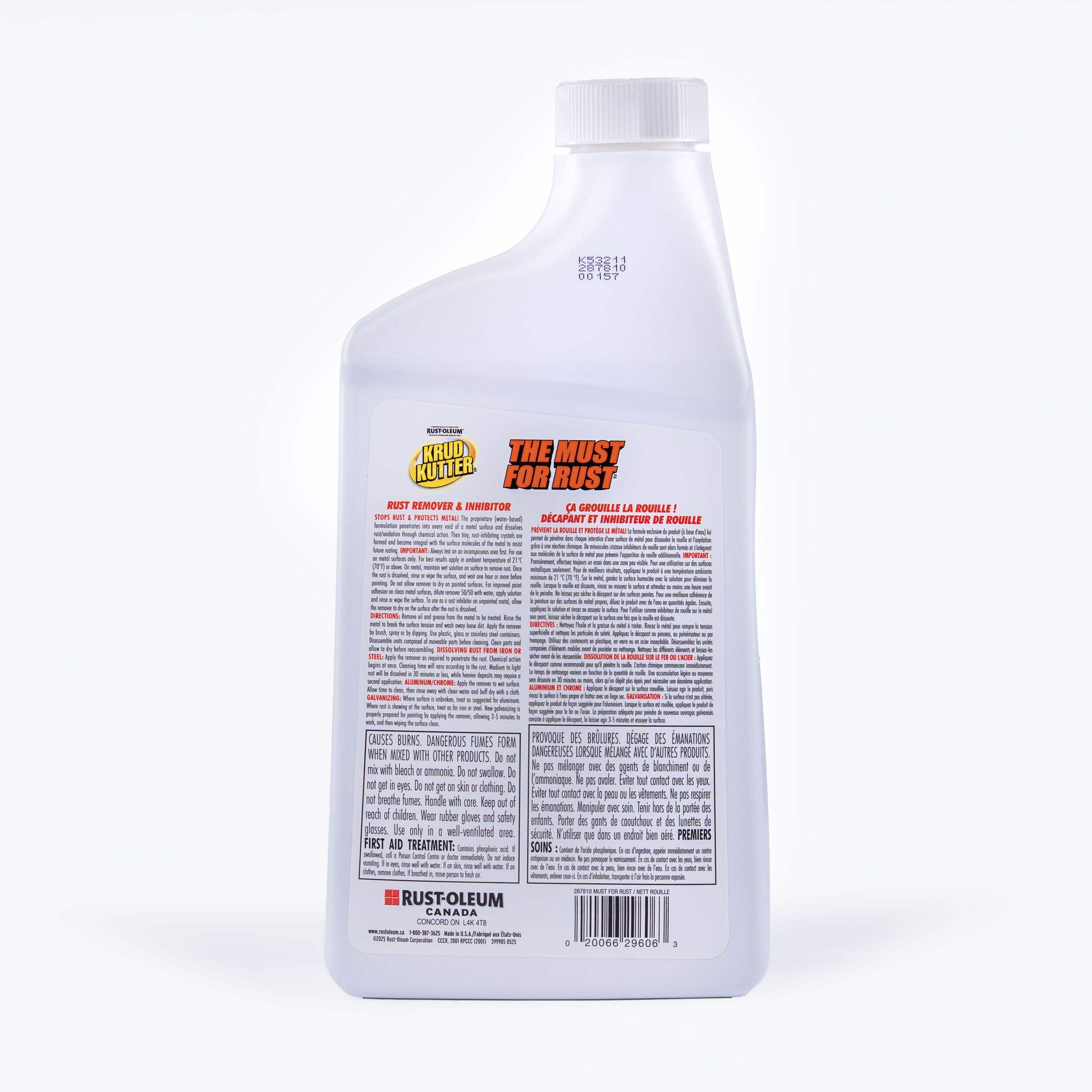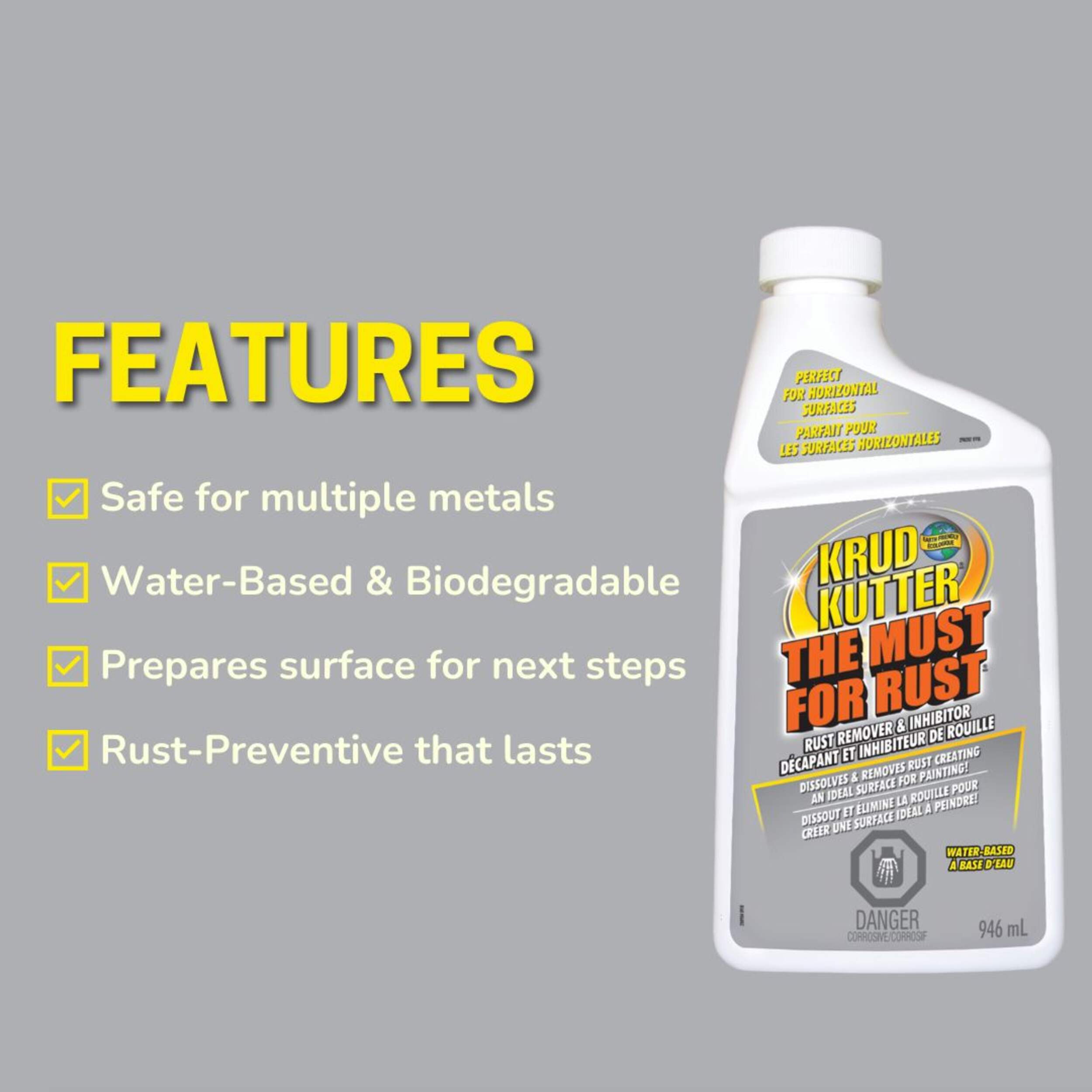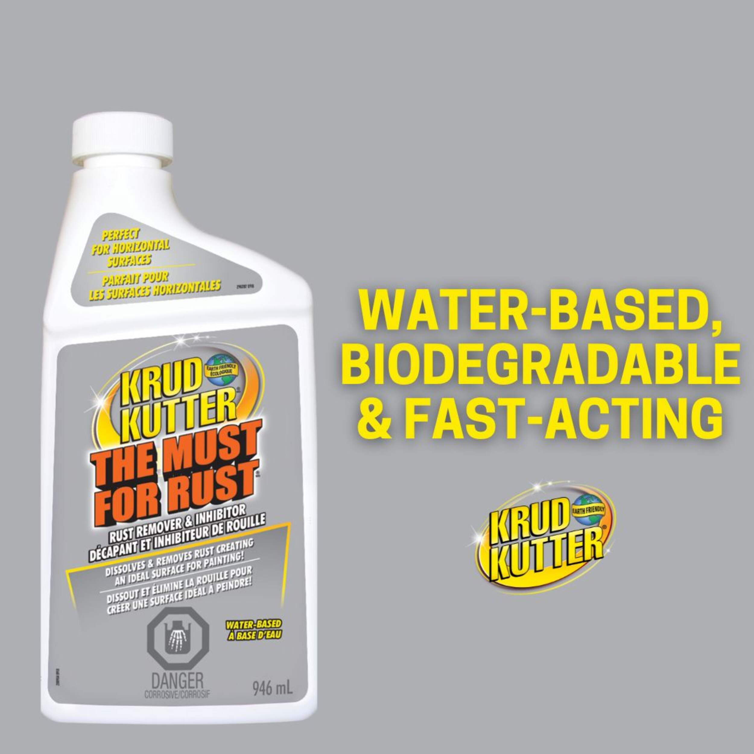 Krud Kutter The Must for Rust is a superior rust remover and inhibitor. The proprietary formulation penetrates into every void of a metal surface and dissolves rust/oxidation through chemical action. Then tiny, rust-inhibiting crystals are formed and become integral with the surface molecules of the metal to resist future rusting. The corrosive agents attack these crystals instead of the metal. Once completely dry, the surface is ready for the next step, whether it be painting, welding, plating, lubricating, etc. Or simply leave the surface bare, and the crystals will inhibit future rust formation.
