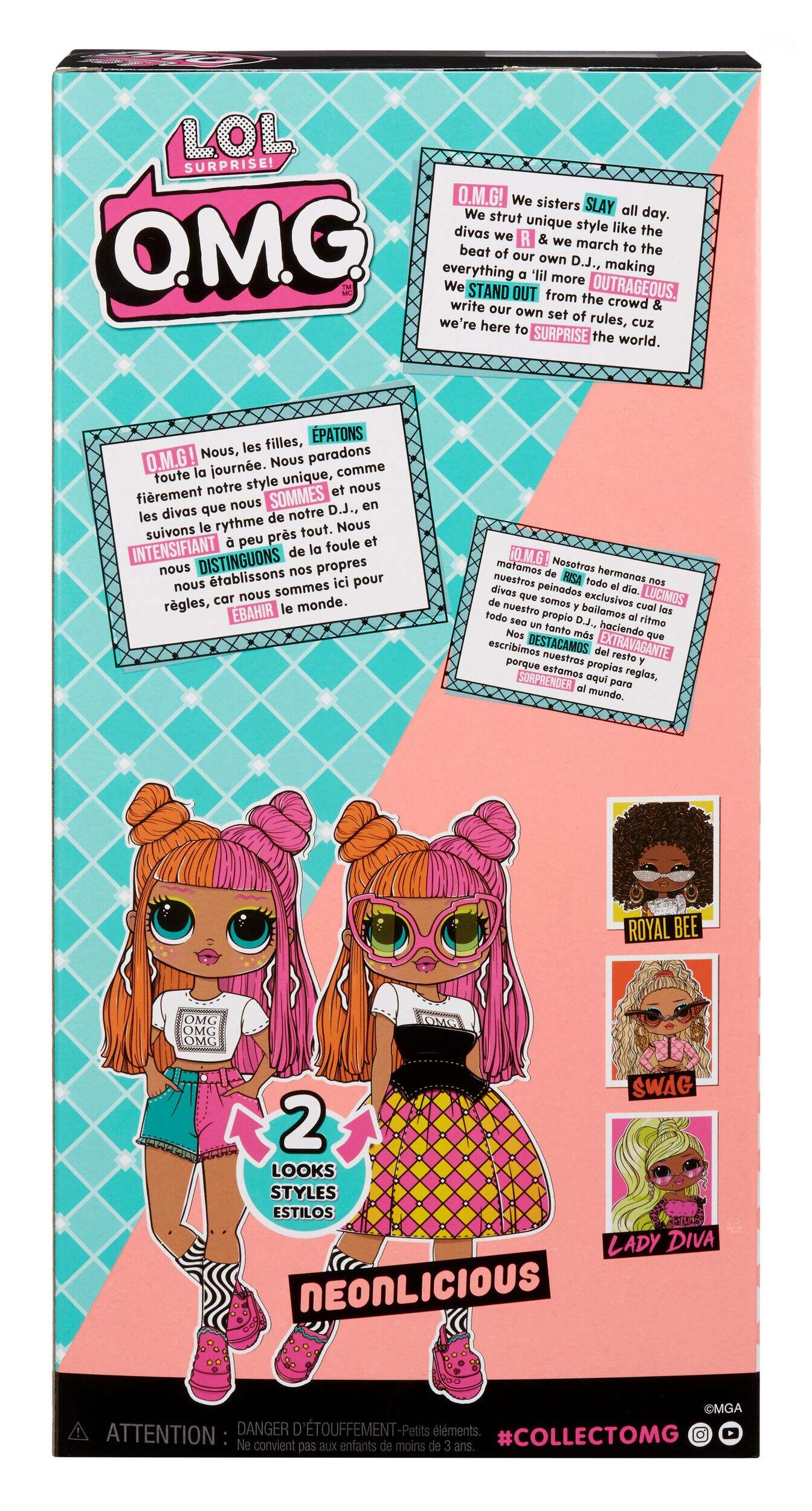 Discover the latest L.O.L. Surprise O.M.G. dolls with this assortment featuring 4 fan favourite characters! Each articulated L.O.L. surprise doll comes with 2 stylish outfits that transform from day to night. Swag, Neonlicious, Lady Diva, and Royal Bee are ready to show off their signature looks. Each doll includes a doll stand and brush so you can strike fierce poses. With 2 complete looks apiece, these L.O.L. Surprise dolls are ready for endless fashion fun and creative play.