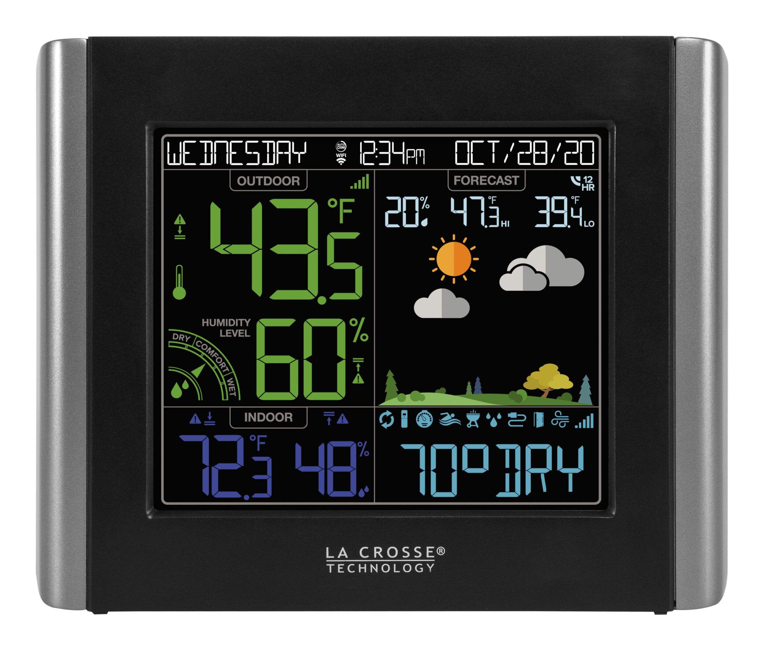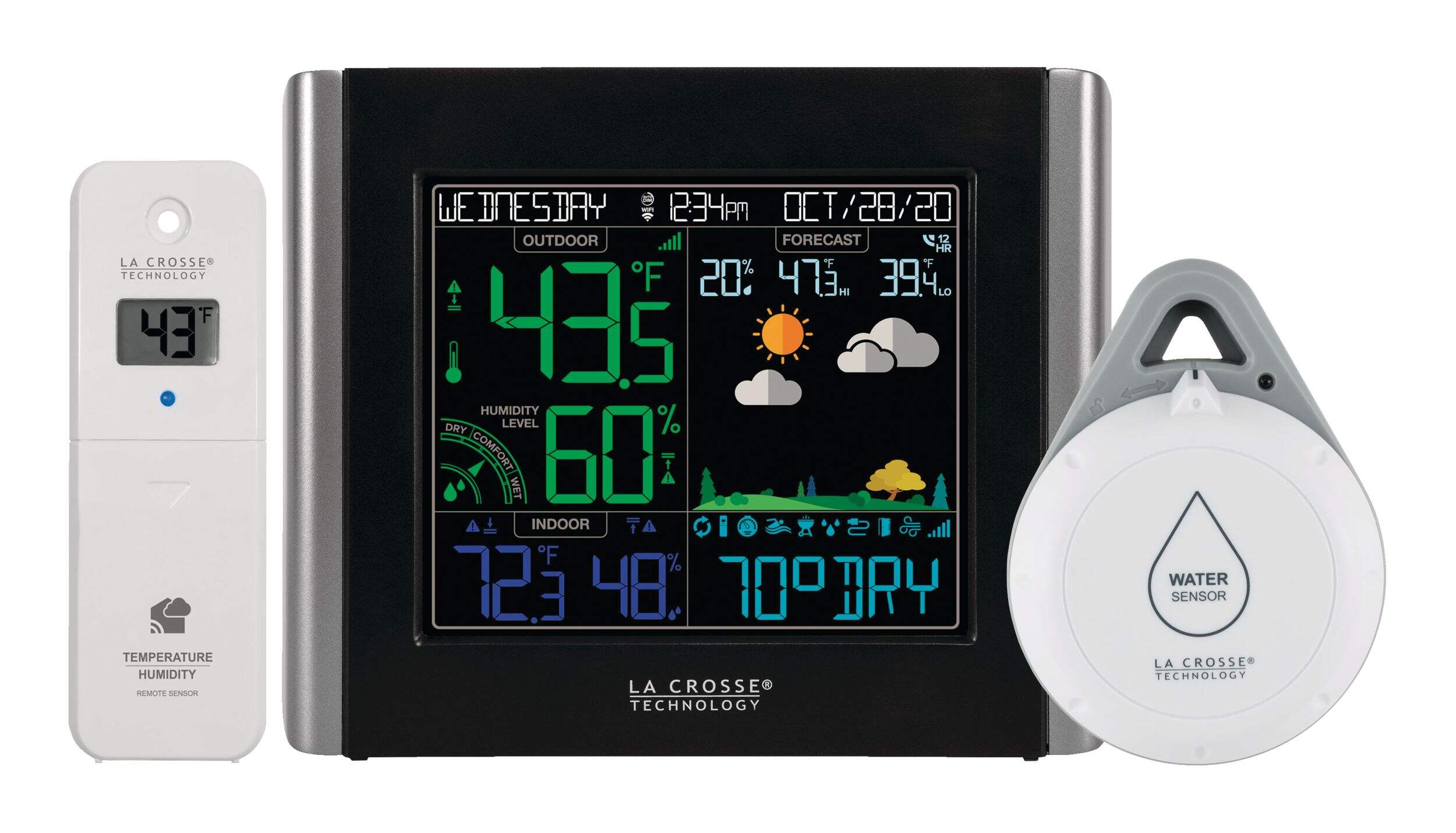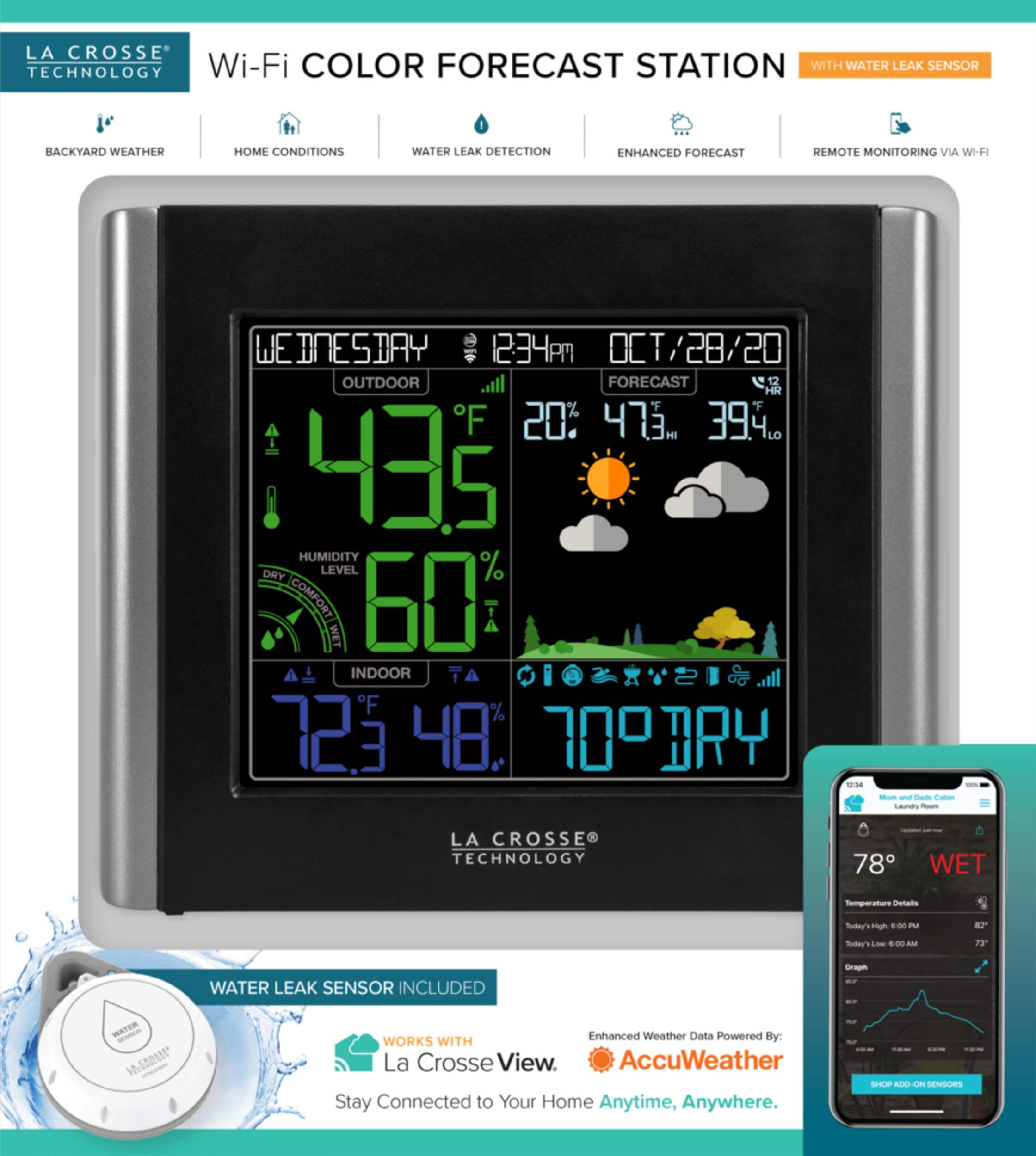 Stay prepared and plan your day with ease with the La Crosse CA79103 Wi-Fi Weather Forecast Station and Thermometer. This comprehensive system displays various weather data points, the time, your Wi-Fi connection and more, making it an extremely useful tool that can help you plan your day with confidence. Functional and versatile, this weather forecast station also includes a water leak sensor to help safeguard moisture-sensitive areas like bathrooms and basements from damage by alerting you to leaks as they happen. Made for easy use, this La Crosse weather forecast and thermometer includes colour weather forecasts, multiple dynamic icons, backlight with automatic dim as well as a wall-hanging or free-standing option, so you can install it almost anywhere in your home.