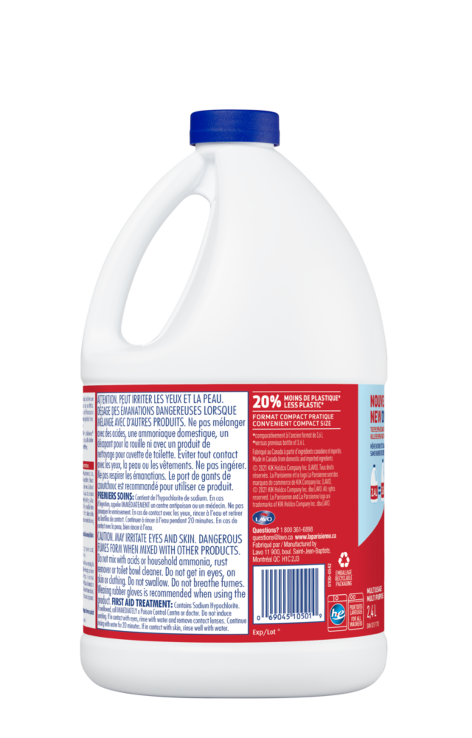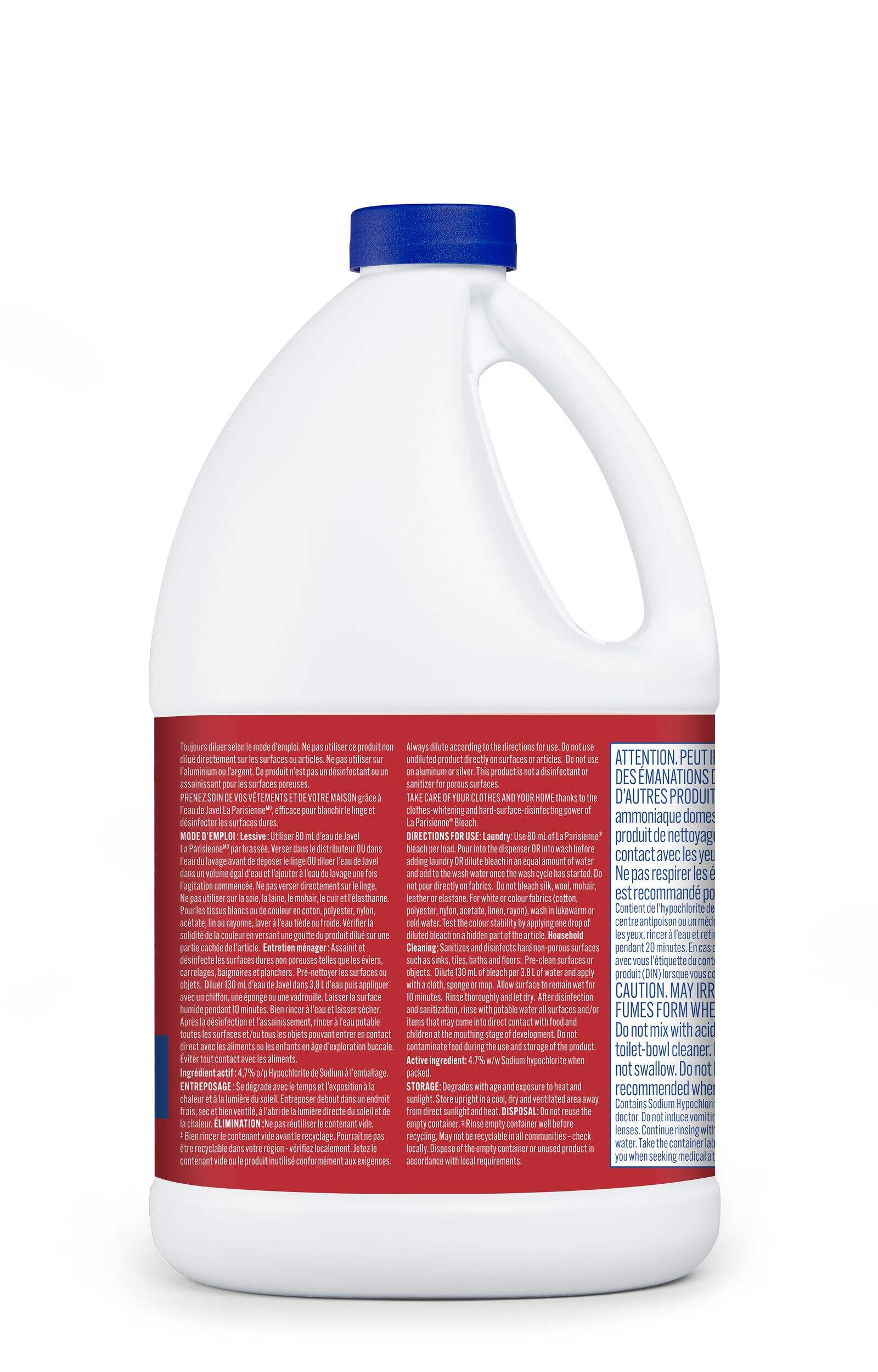La Parisienne Liquid Disinfectant Multi Purpose Bleach is a concentrated formula that goes further, perfect for bleaching fabrics or disinfecting hard non-porous surfaces around your home. This 2.4 L container is equivalent to 3.6 L of regular formula, meaning less shopping trips and less plastic waste. Simply dilute as directed and spray or wipe onto surfaces like countertops, sinks, toilets, tile, vinyl floors and more to kill germs and leave behind a fresh, clean smell.