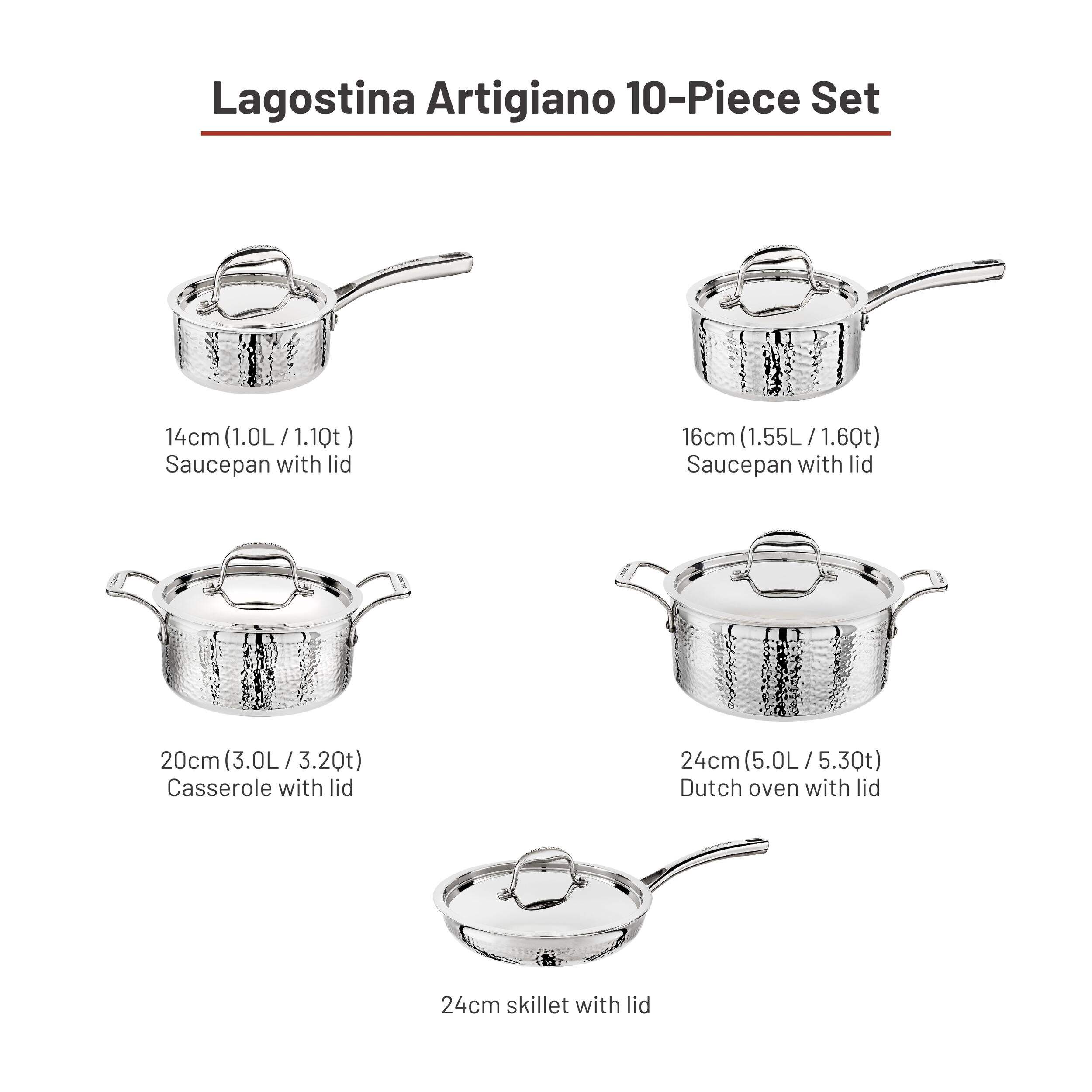 The Lagostina Artigiano 10-Piece Cookware Set combines timeless design with innovative technology. Its hammered exterior brings a sophisticated look to your kitchen, while the 3-PLY CLAD —featuring an aluminum core—delivers exceptional heat conduction and even cooking results. The 18/10 stainless steel interior resists staining and odors, and the riveted stainless steel handles ensure durability and comfort. Stainless steel lids create a tight seal to lock in flavour, and the flared edges offer drip-free pouring. Dishwasher safe, oven safe up to 400°F/204°C, and compatible with all cooktops, including induction, this set brings both style and practicality to your kitchen.