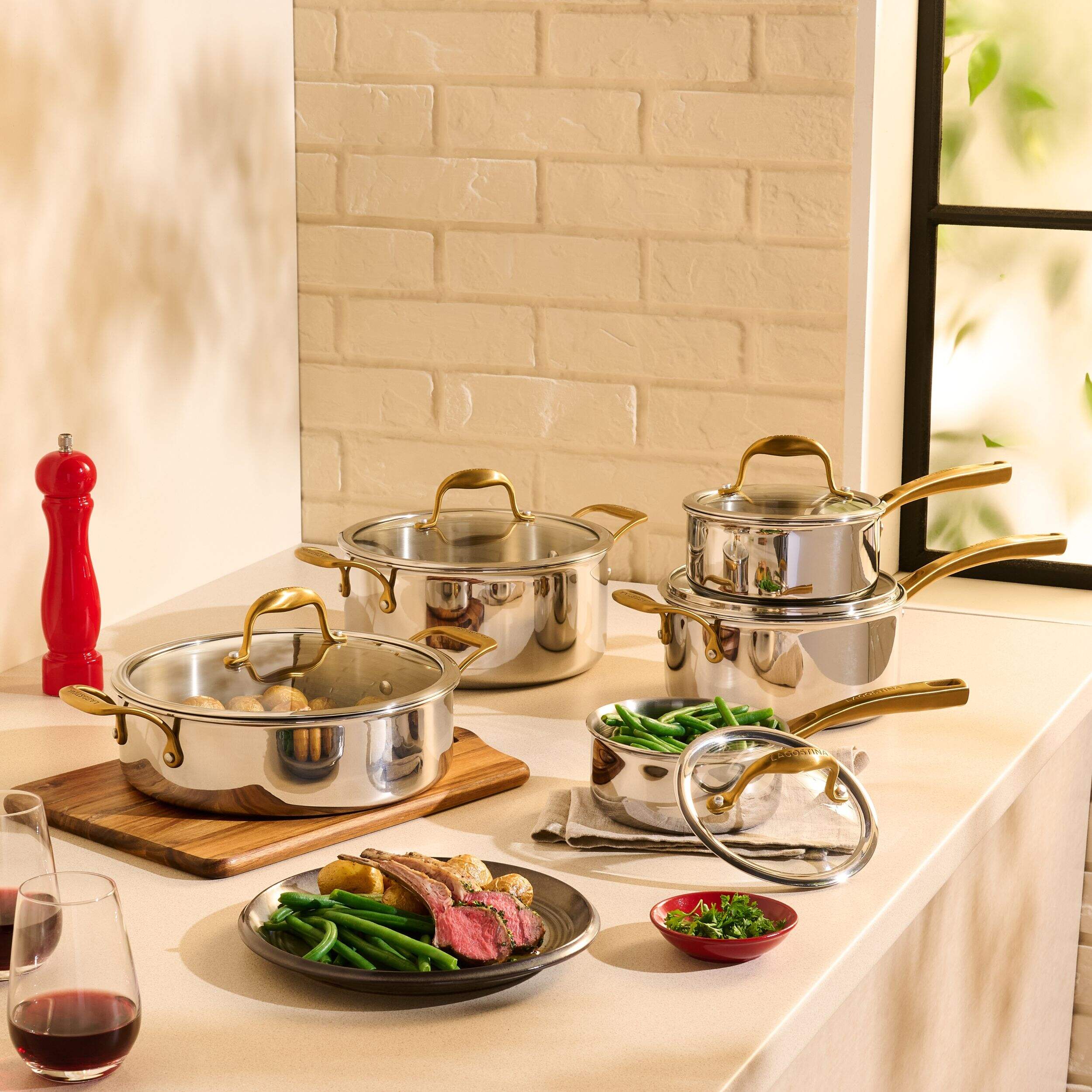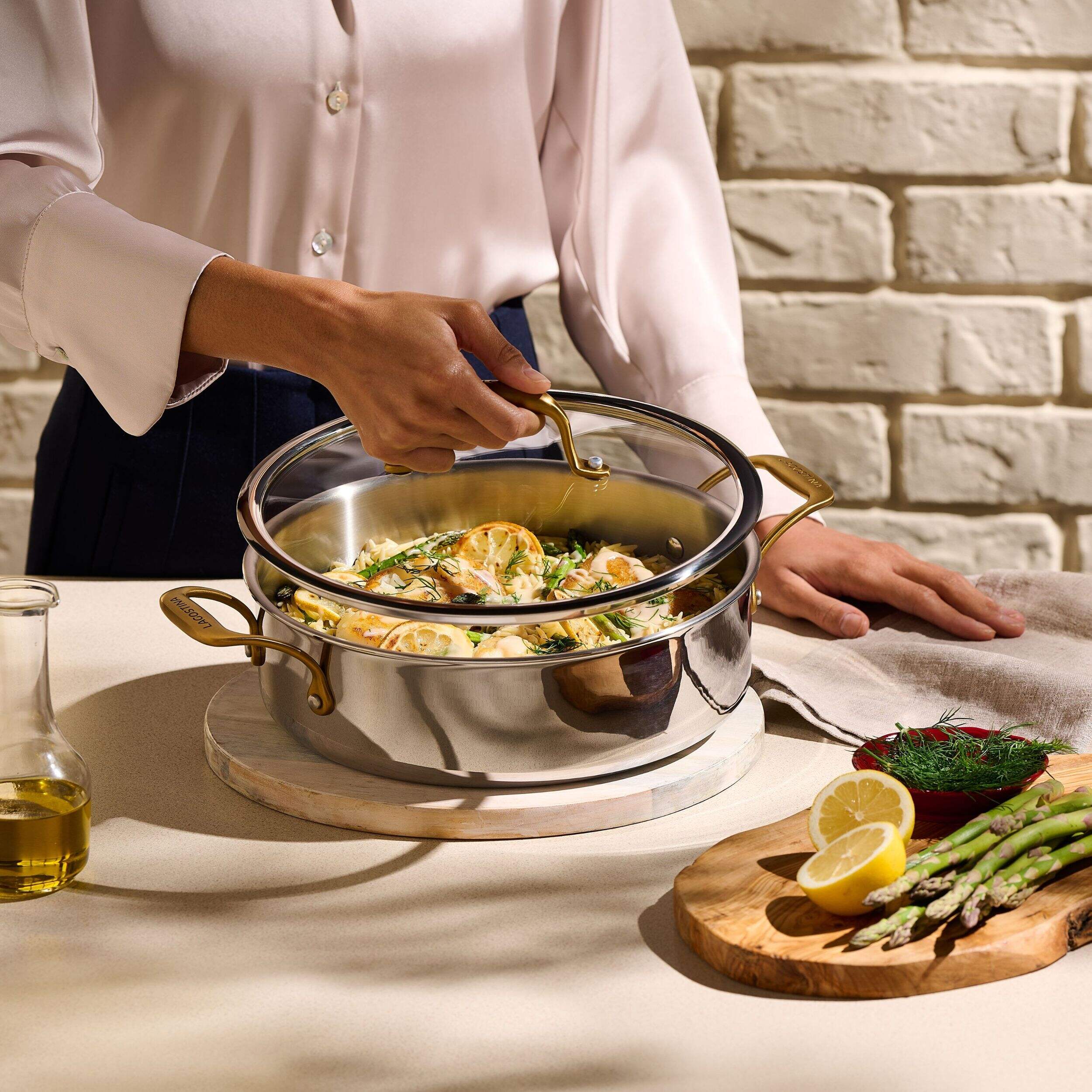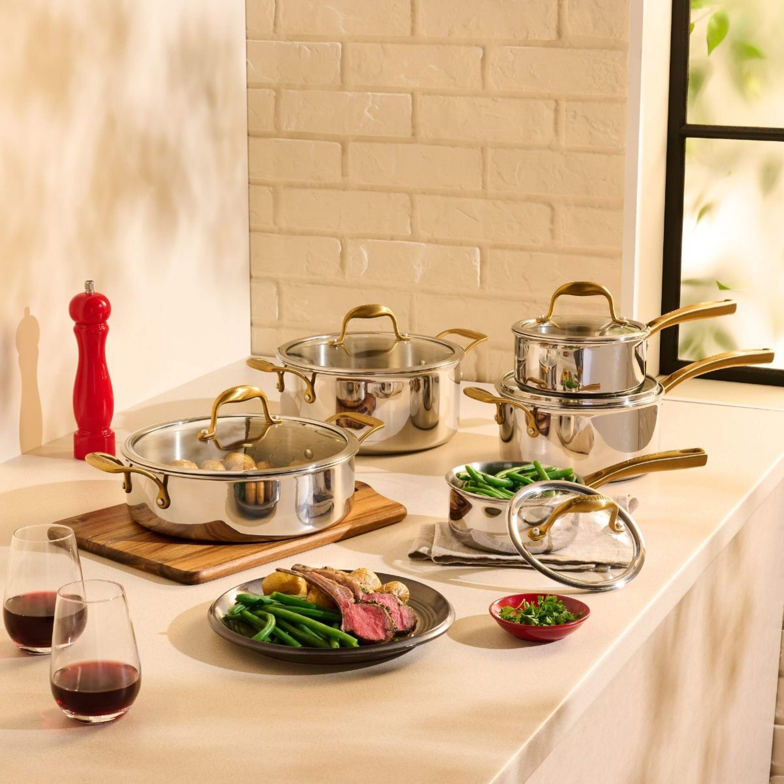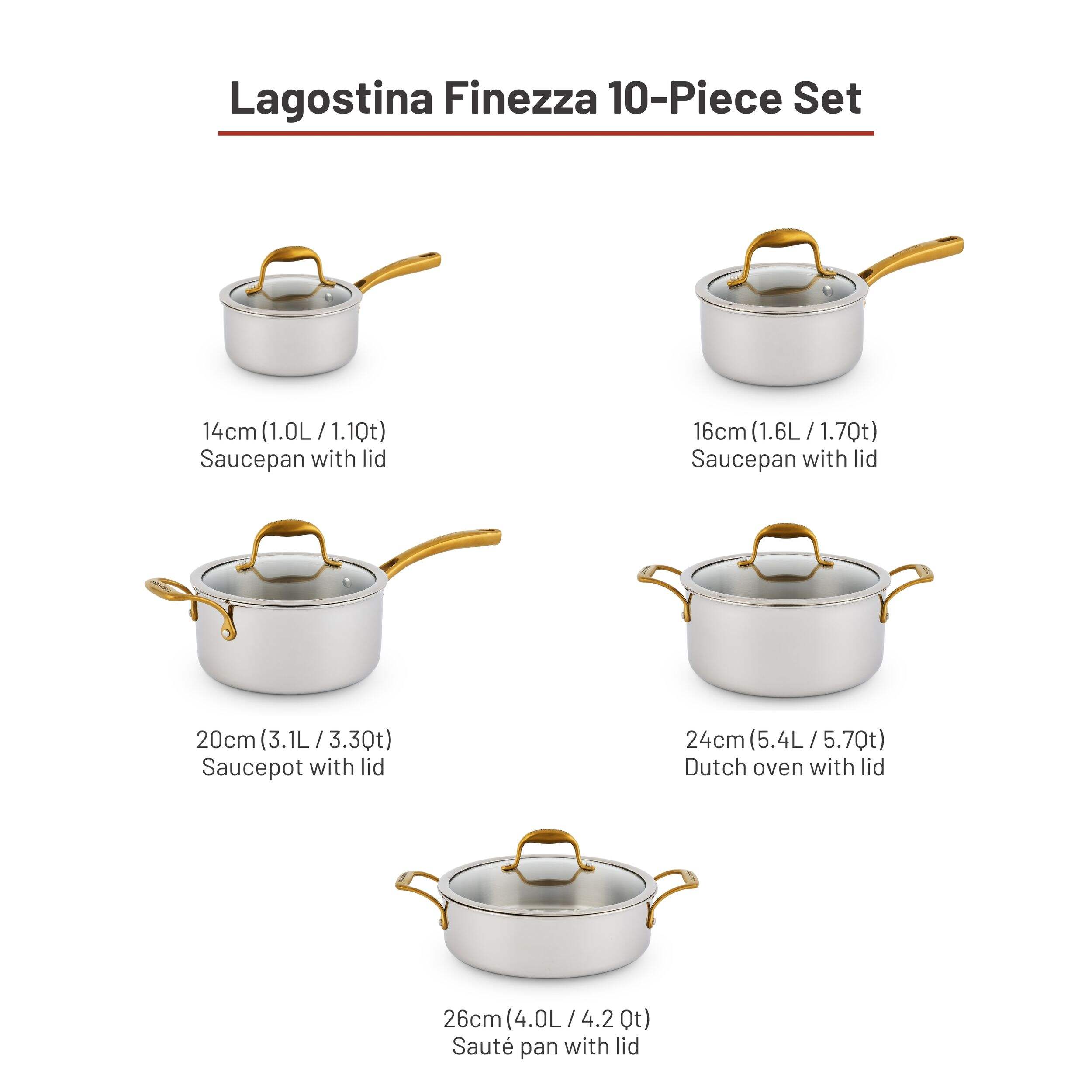 The Lagostina Finezza 10-Piece Set combines elegance and performance, perfect for those who appreciate quality cooking. With its 5-PLY CLAD technology, three layers of aluminum between two layers of stainless steel ensure even heat distribution from base to rim for superior cooking results. The premium 18/10 stainless steel interior resists odors and staining, while the gold-accented handles add a refined touch to your kitchen. Glass lids allow for easy monitoring of your meals, and flared edges enable dripless pouring. This set is dishwasher safe for easy cleaning, oven safe up to 400°F / 204°C, and compatible with all cooktops, including induction, making it the perfect combination of style, function, and durability.
