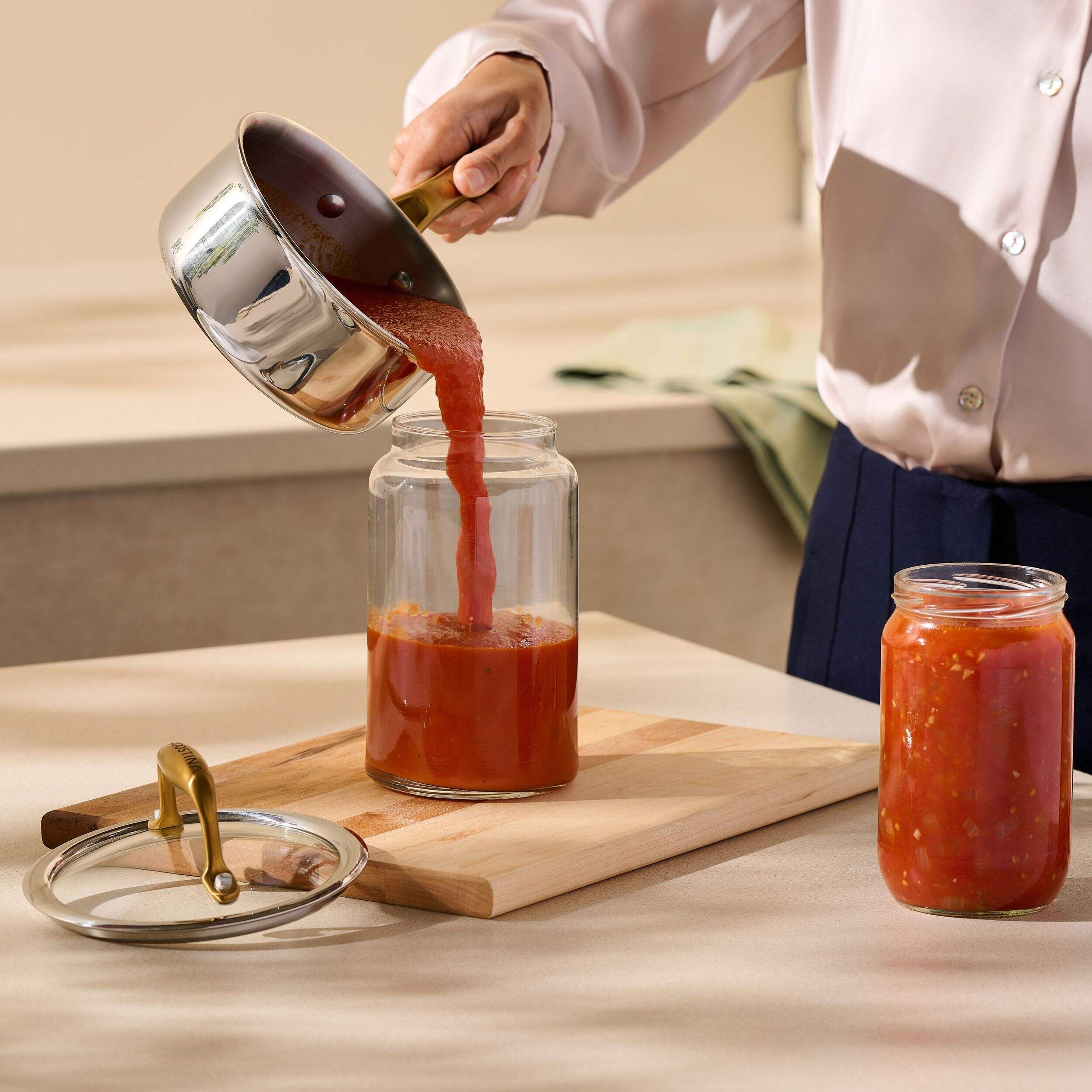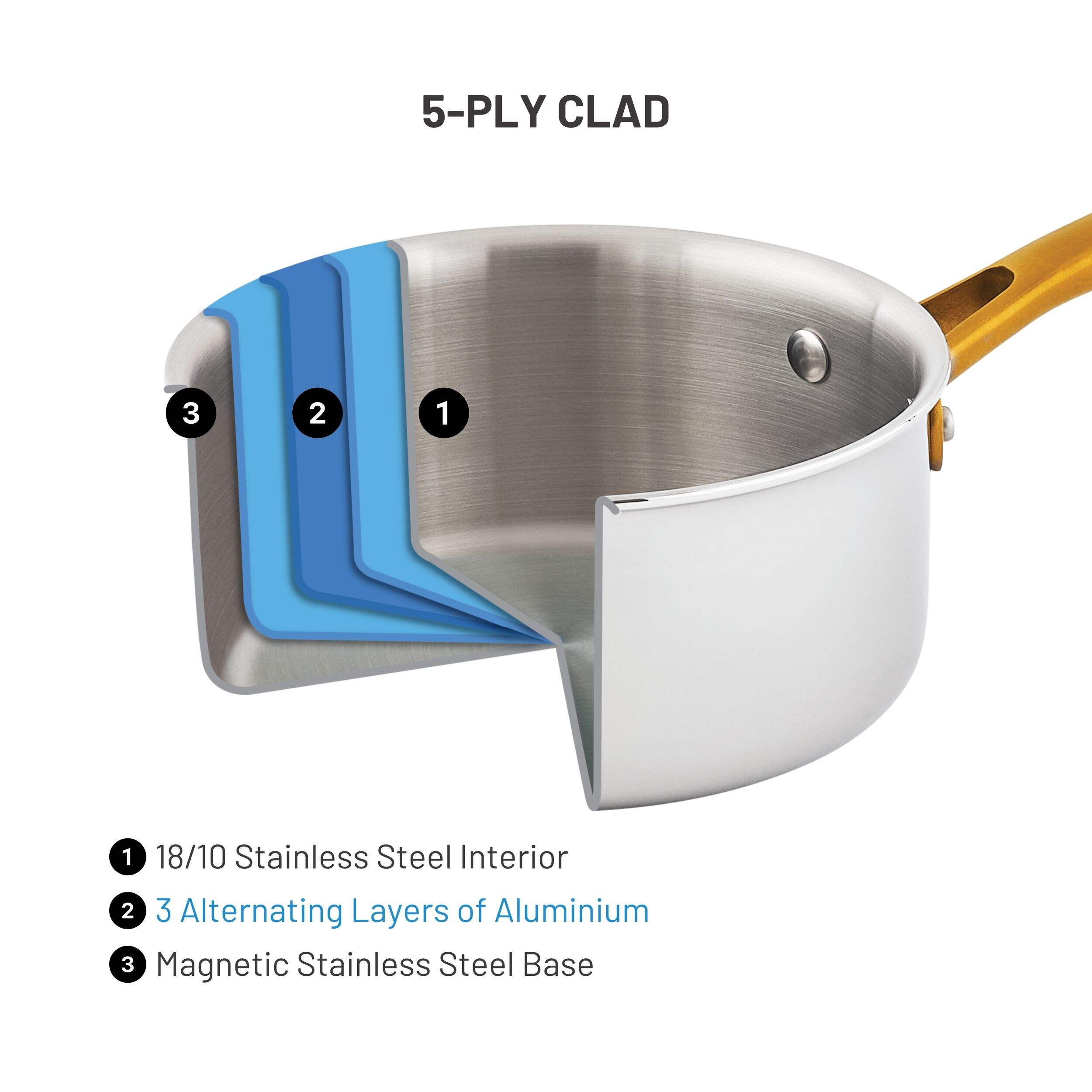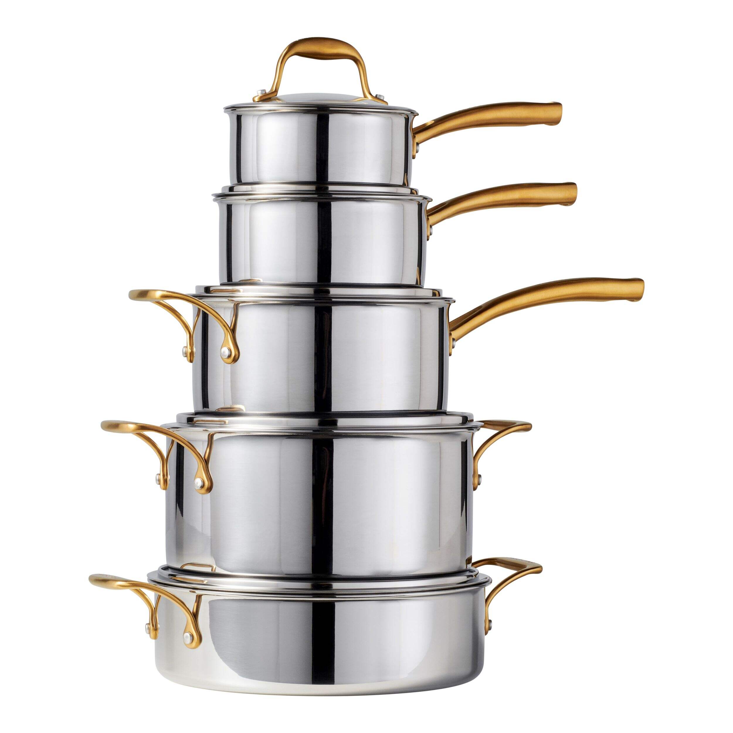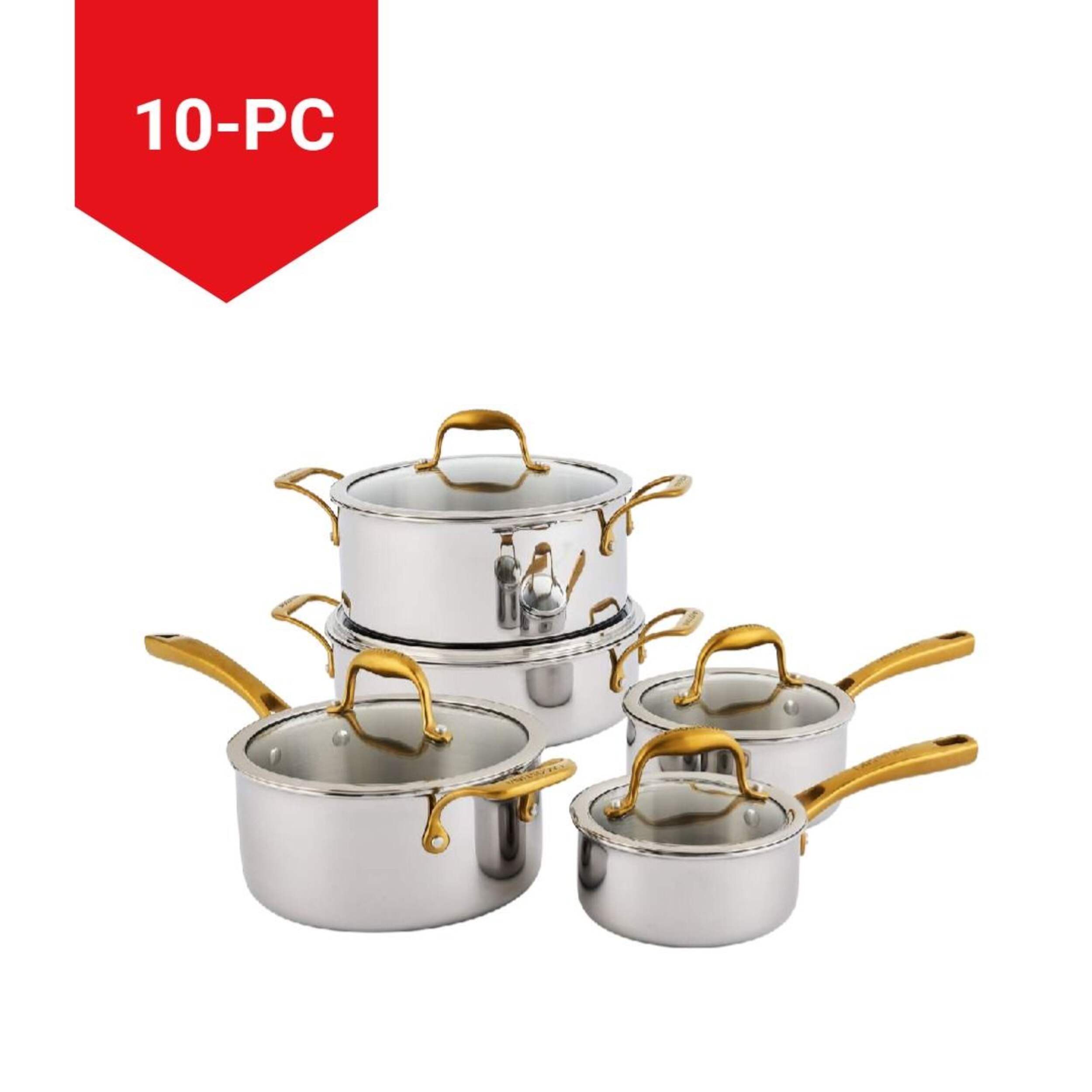 The Lagostina Finezza 10-Piece Set combines elegance and performance, perfect for those who appreciate quality cooking. With its 5-PLY CLAD technology, three layers of aluminum between two layers of stainless steel ensure even heat distribution from base to rim for superior cooking results. The premium 18/10 stainless steel interior resists odors and staining, while the gold-accented handles add a refined touch to your kitchen. Glass lids allow for easy monitoring of your meals, and flared edges enable dripless pouring. This set is dishwasher safe for easy cleaning, oven safe up to 400°F / 204°C, and compatible with all cooktops, including induction, making it the perfect combination of style, function, and durability.