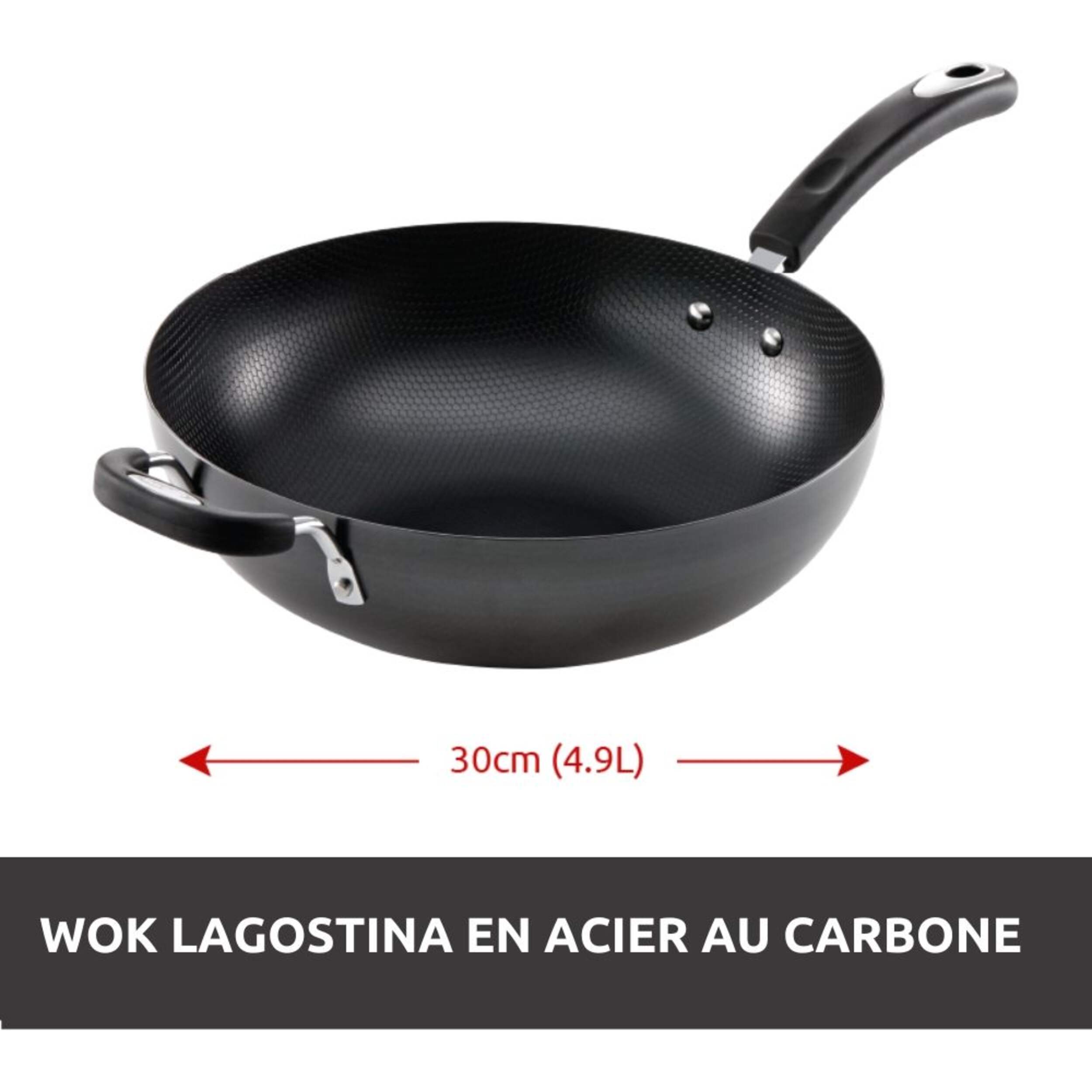 The Lagostina Carbon Steel Wok Pan is designed to deliver optimal cooking performance. For best results, an initial seasoning process is recommended to enhance its non-stick capabilities. Avoid using metal utensils on the cooking surface to maintain its quality. Hand washing is advised, and ensure the wok pan is dried thoroughly after each wash. Proper care will keep your wok pan in excellent condition for years to come.
