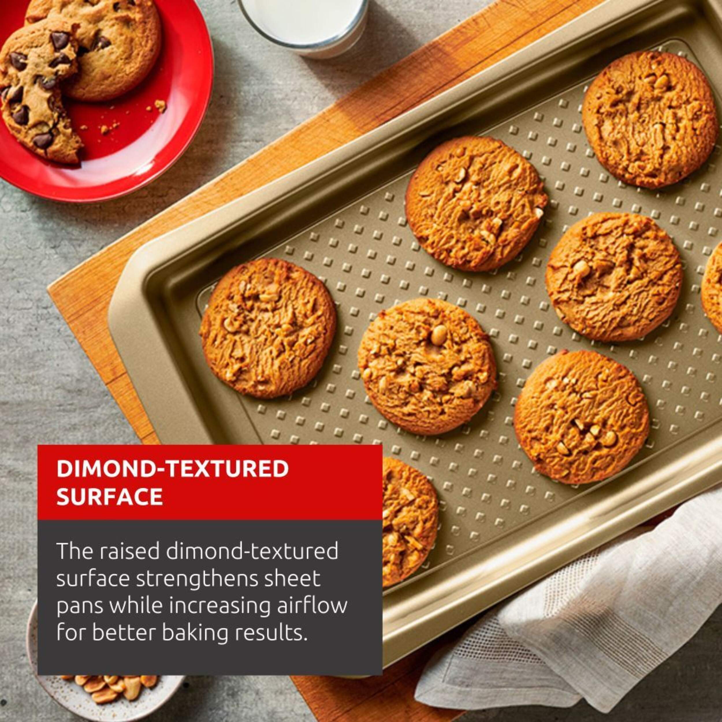 Get the best results ever from your cookie and sheet-pan recipes with the Lagostina Diamond Cookie Sheet. Made with heavy-gauge steel for even heat retention, it features a raised diamond-textured surface designed to increase airflow for better baking. The premium gold, non-stick coating releases food and cleans up easily. The oversized handles provide a secure grip for easy transfers with mitts to the oven.