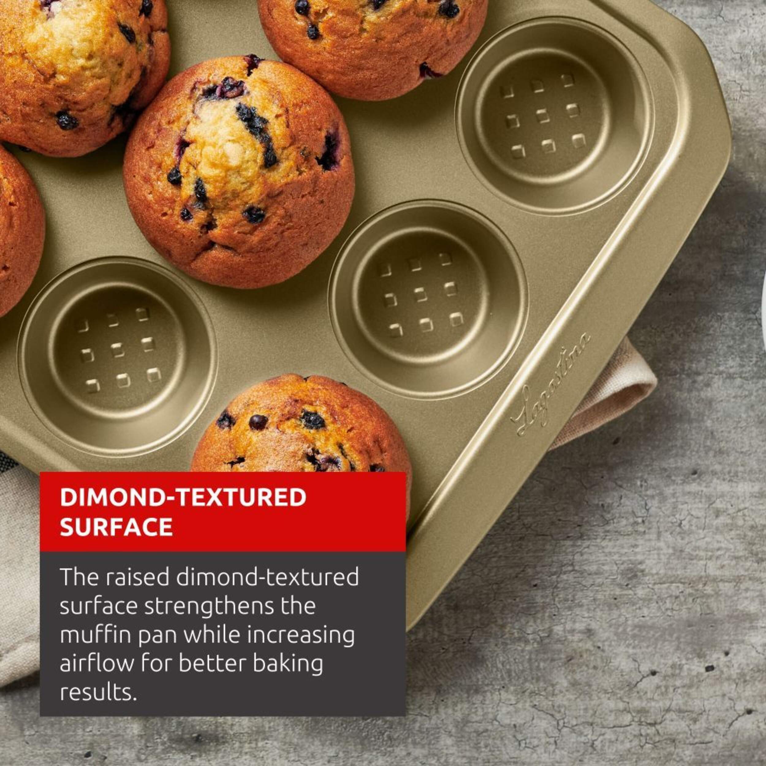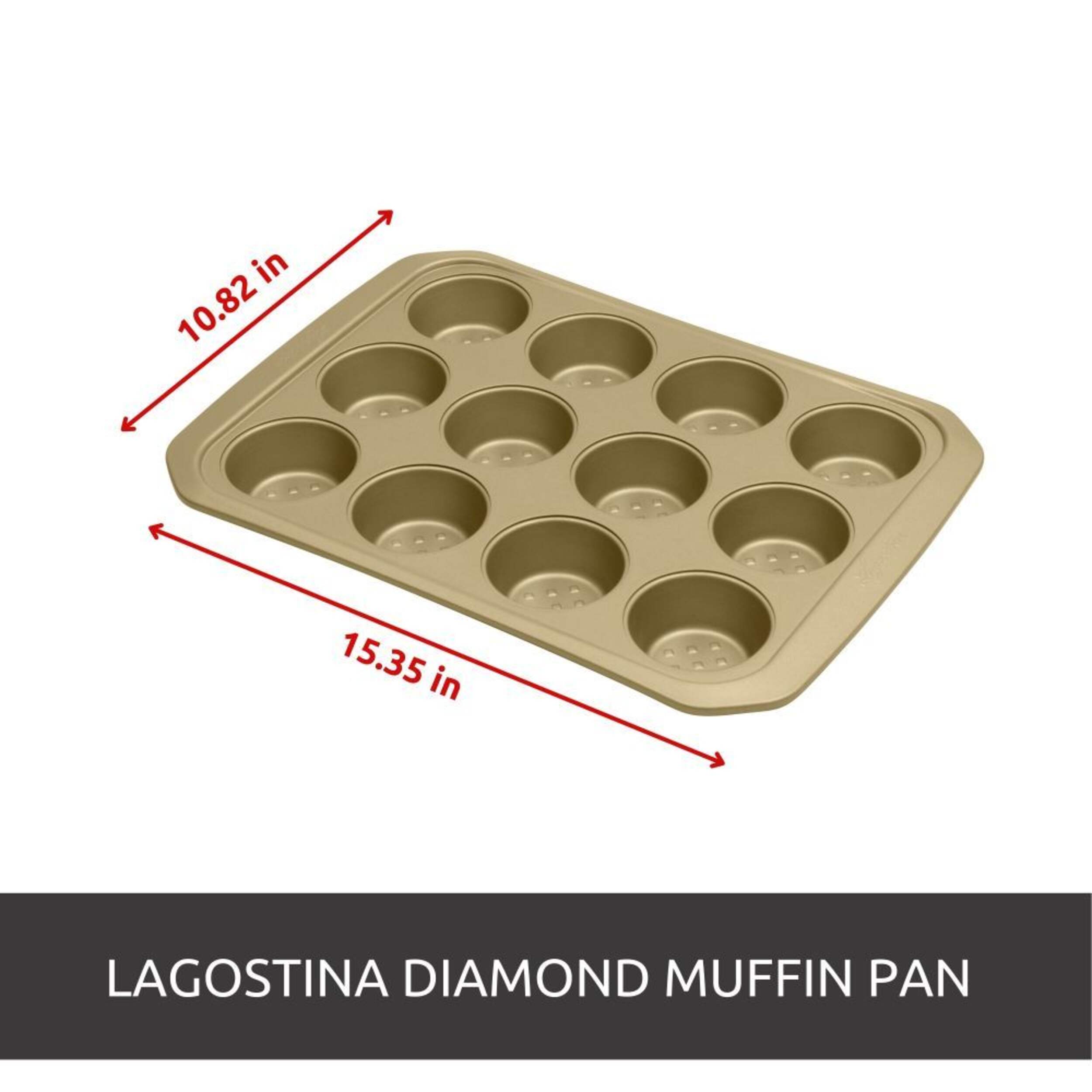 Bake perfect muffins with the Lagostina Diamond Non-Stick Muffin Tin. This muffin pan provides exceptional heat retention for evenly baked results every time. Its premium gold non-stick coating allows for effortless food release and quick clean-up, making it a favourite in any kitchen. The oversized handle ensures a secure grip, providing maximum convenience when transferring the pan to and from the oven.